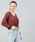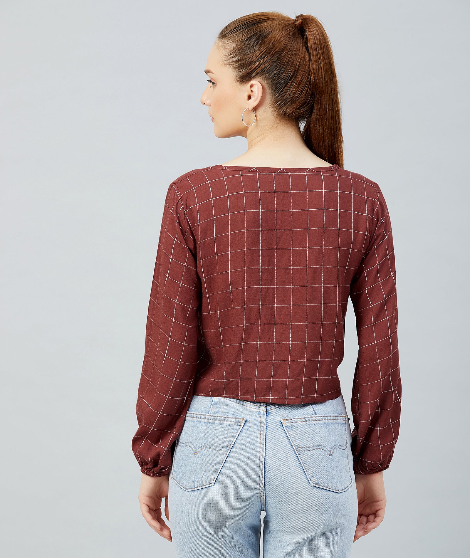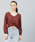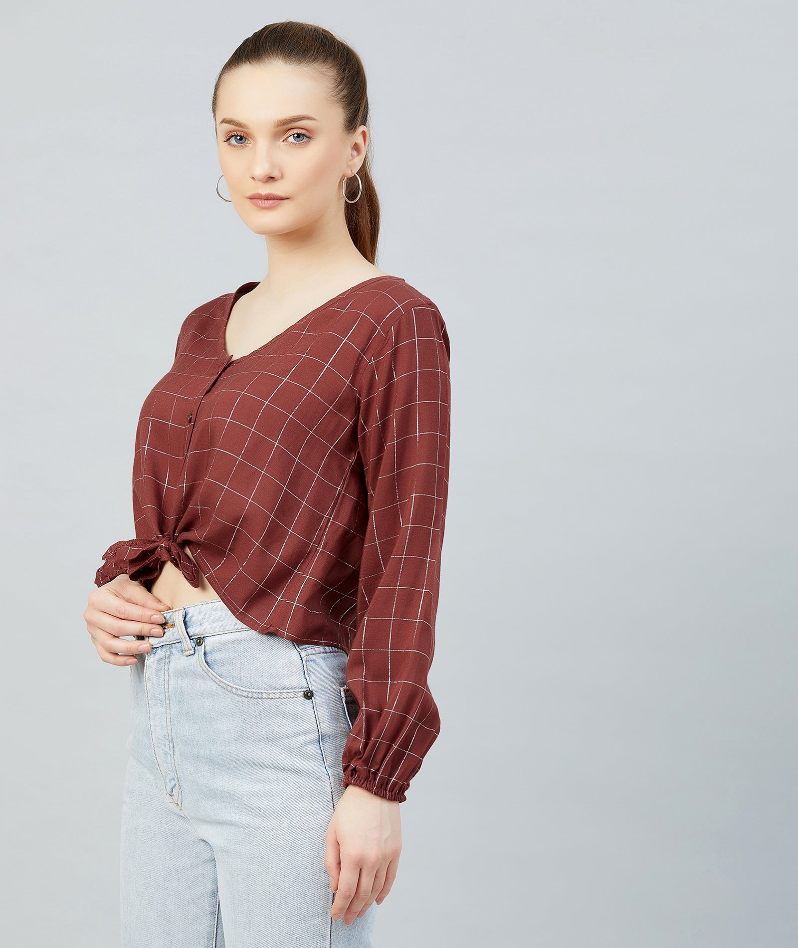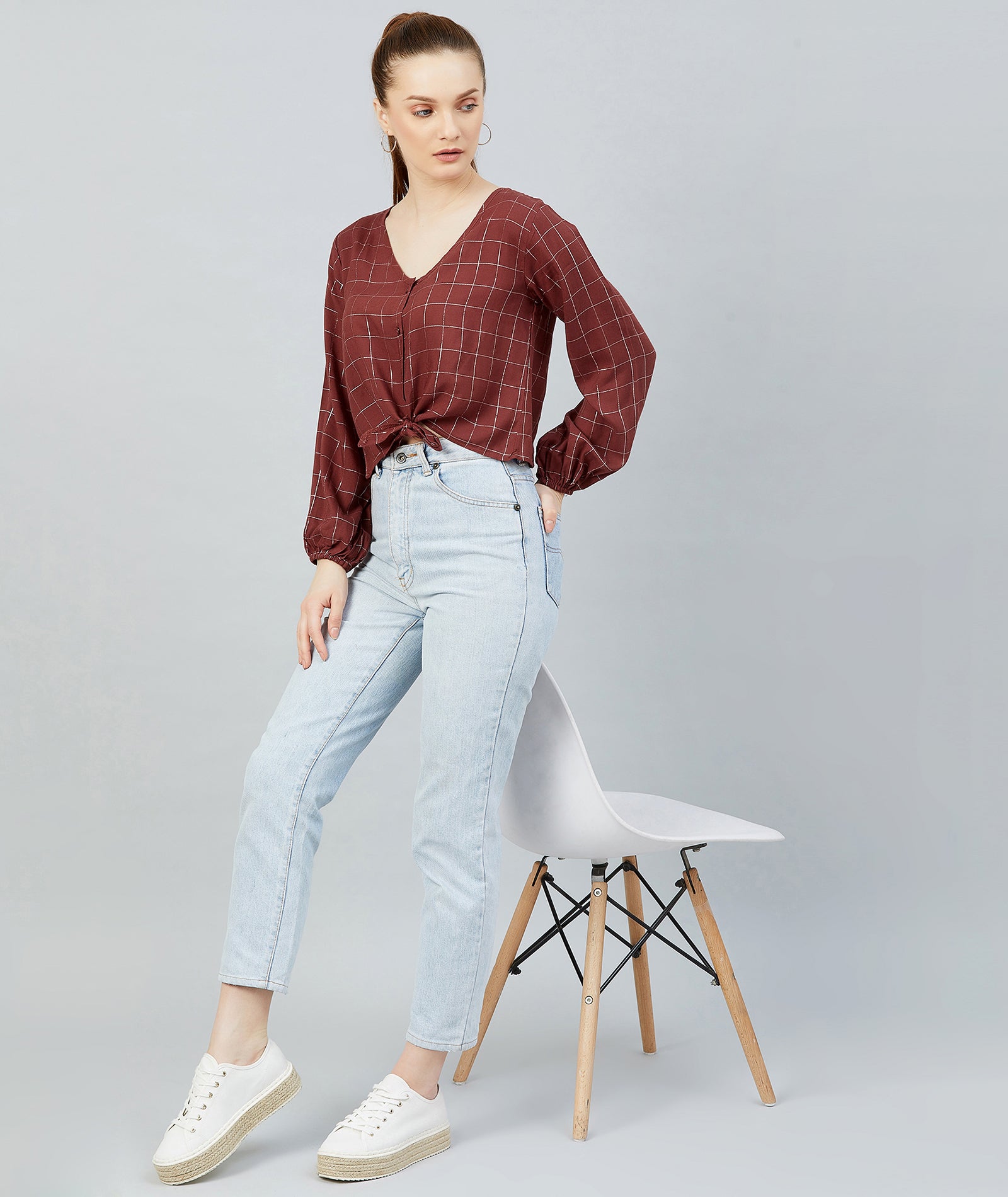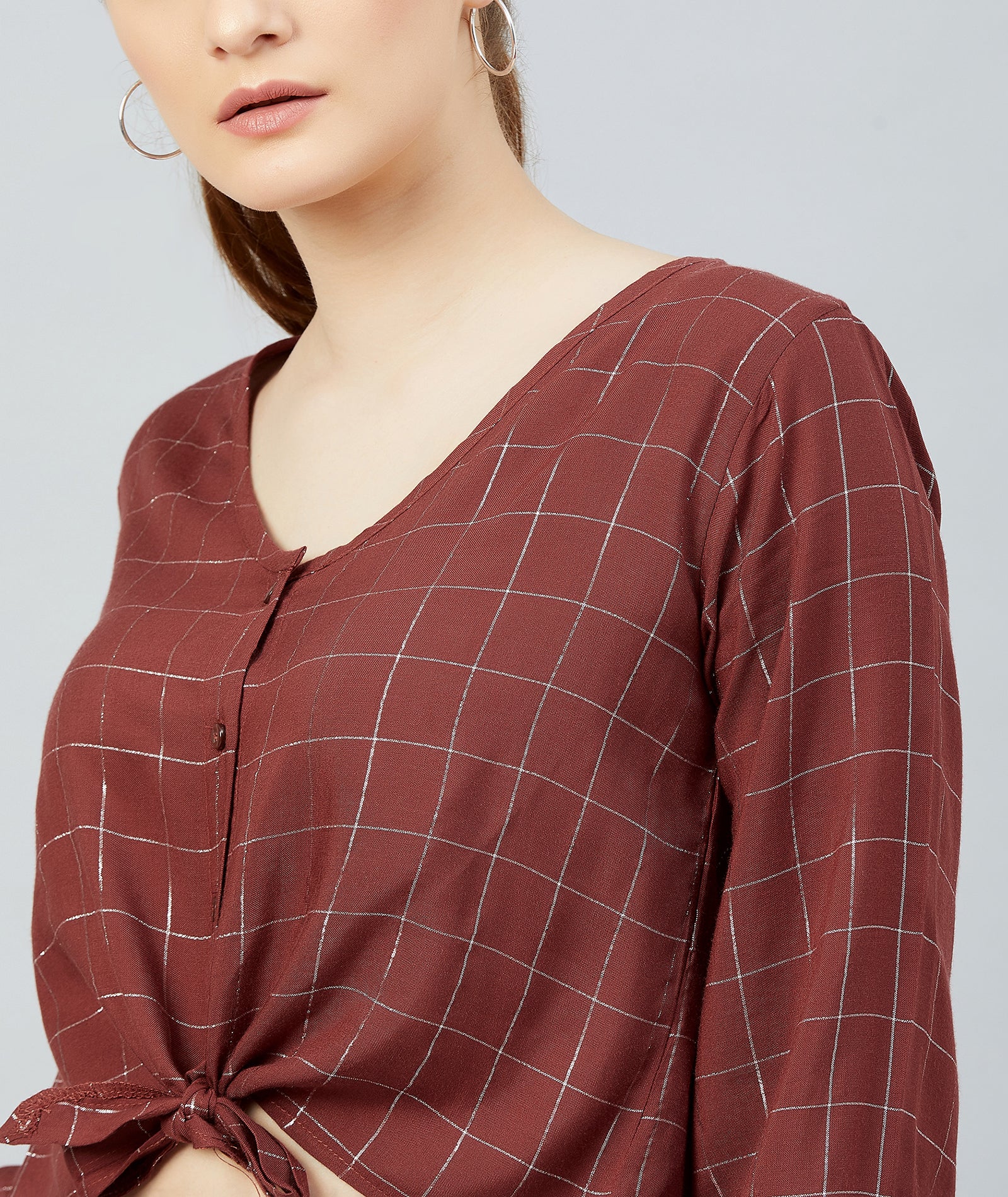 Chimpaaanzee Women Maroon Checkered Viscose Knotted Top