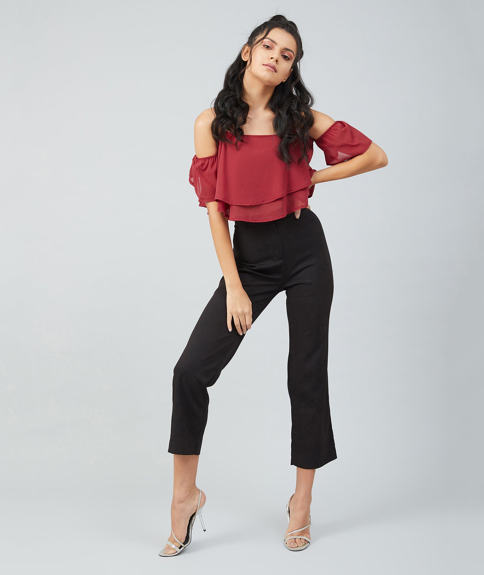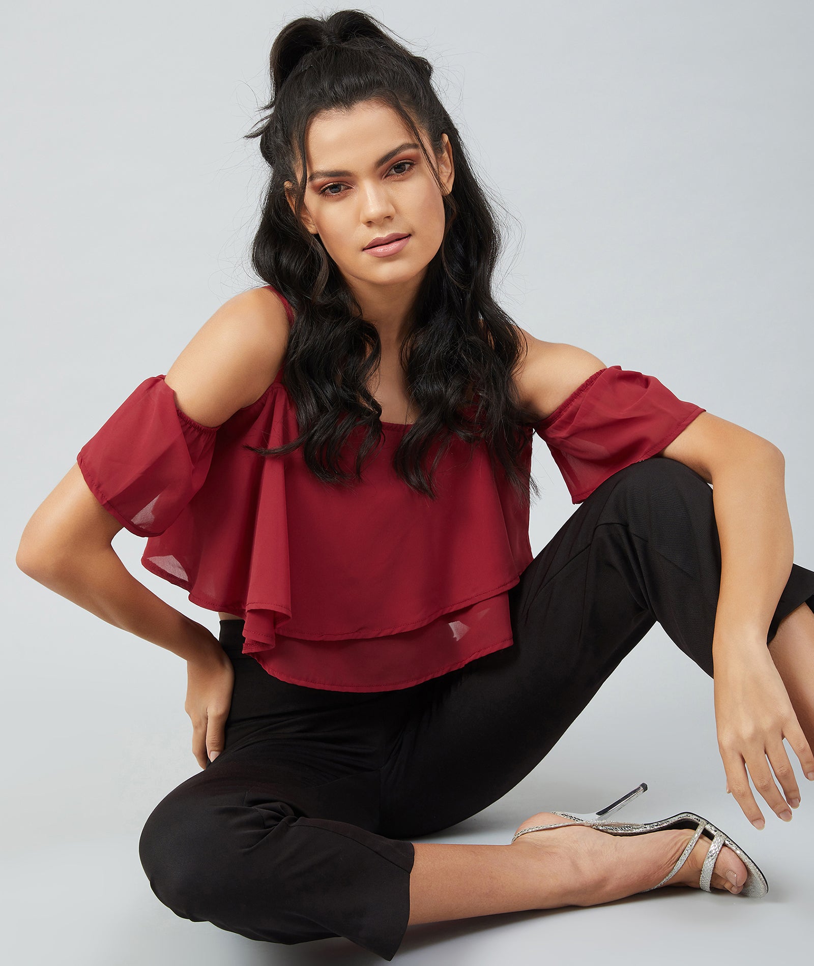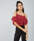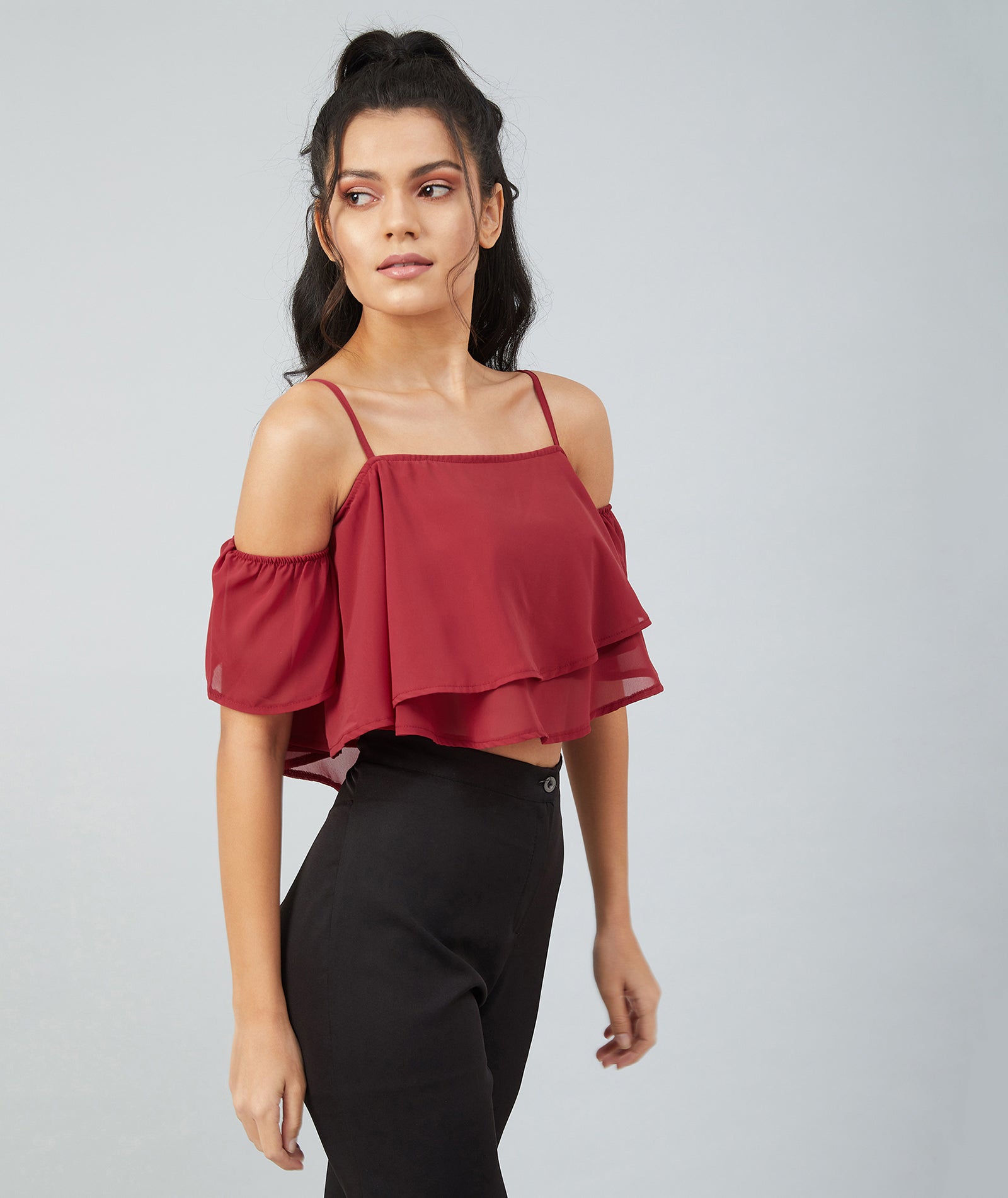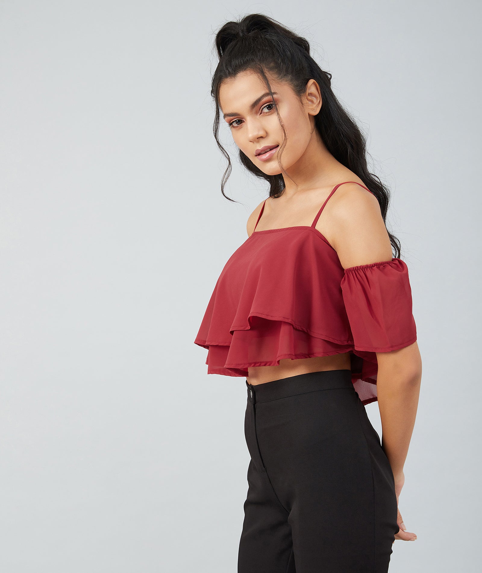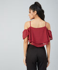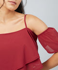 Chimpaaanzee women Maroon Georgette Noodle Strap Cold Shoulder Crop top