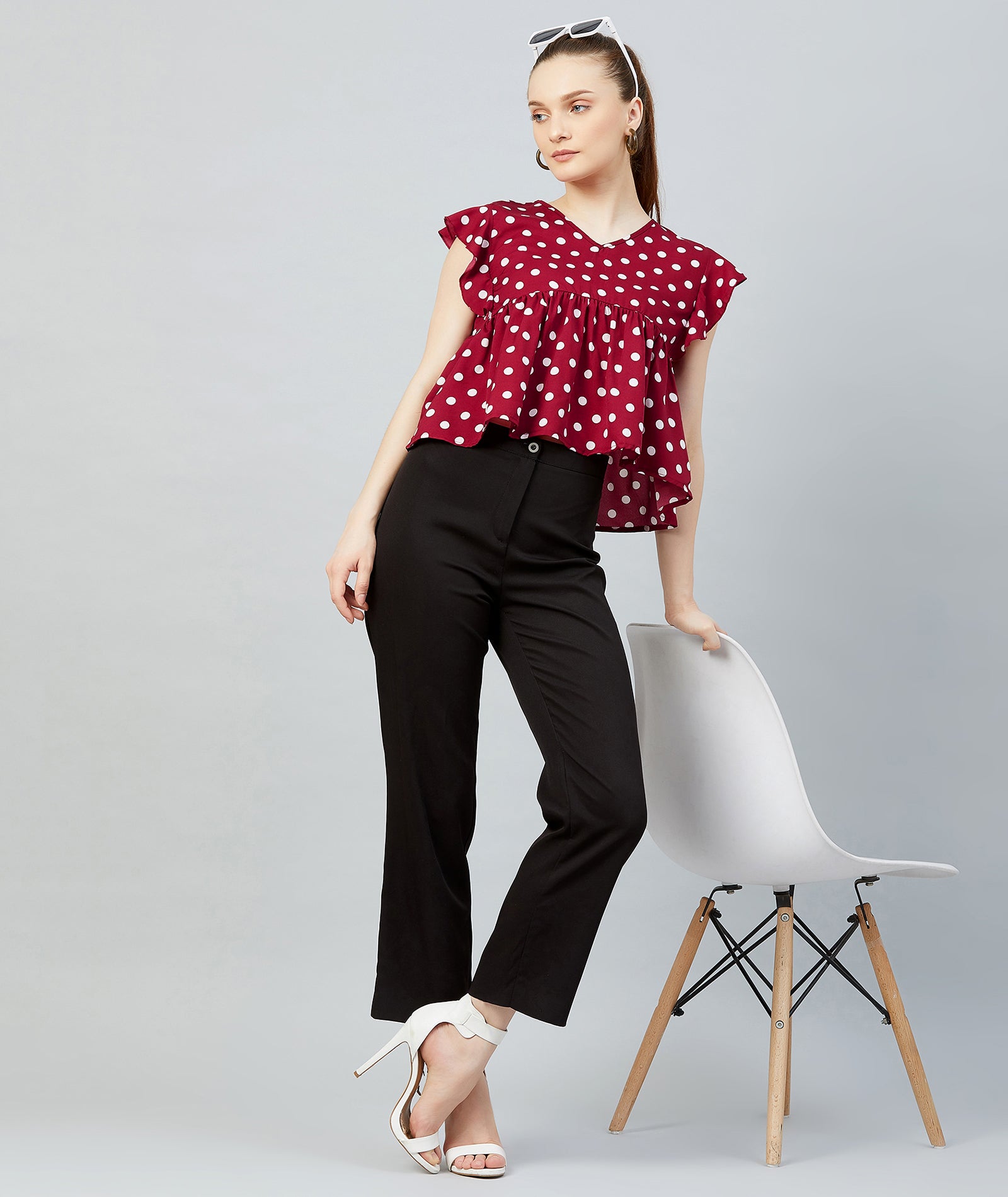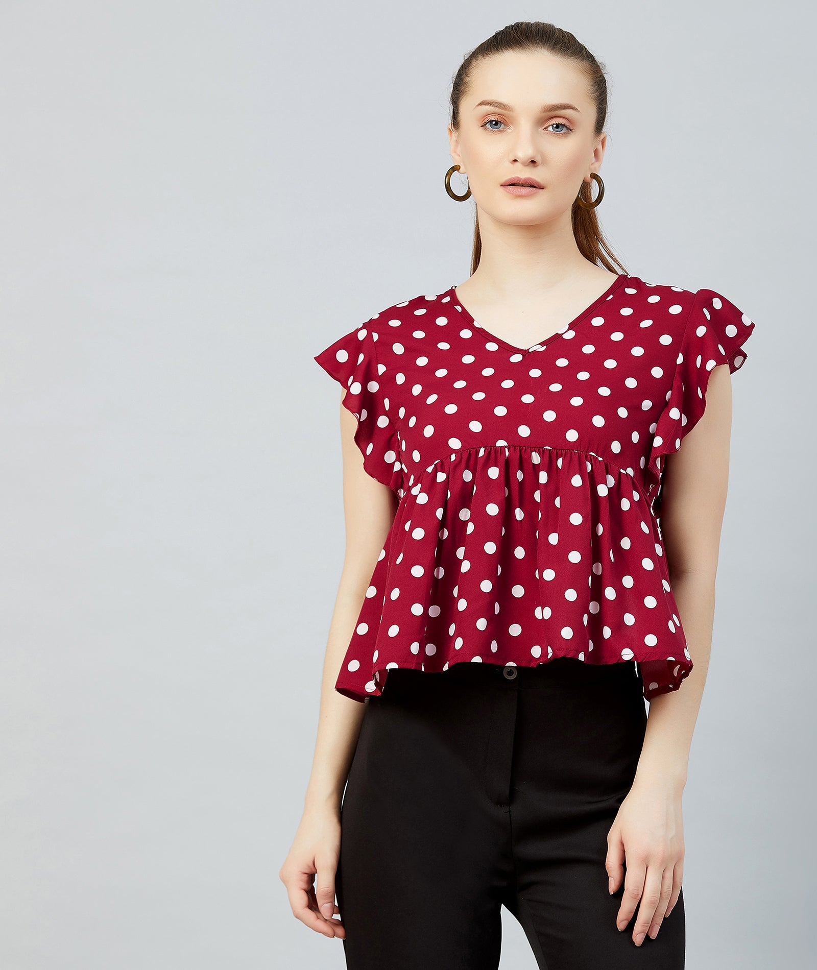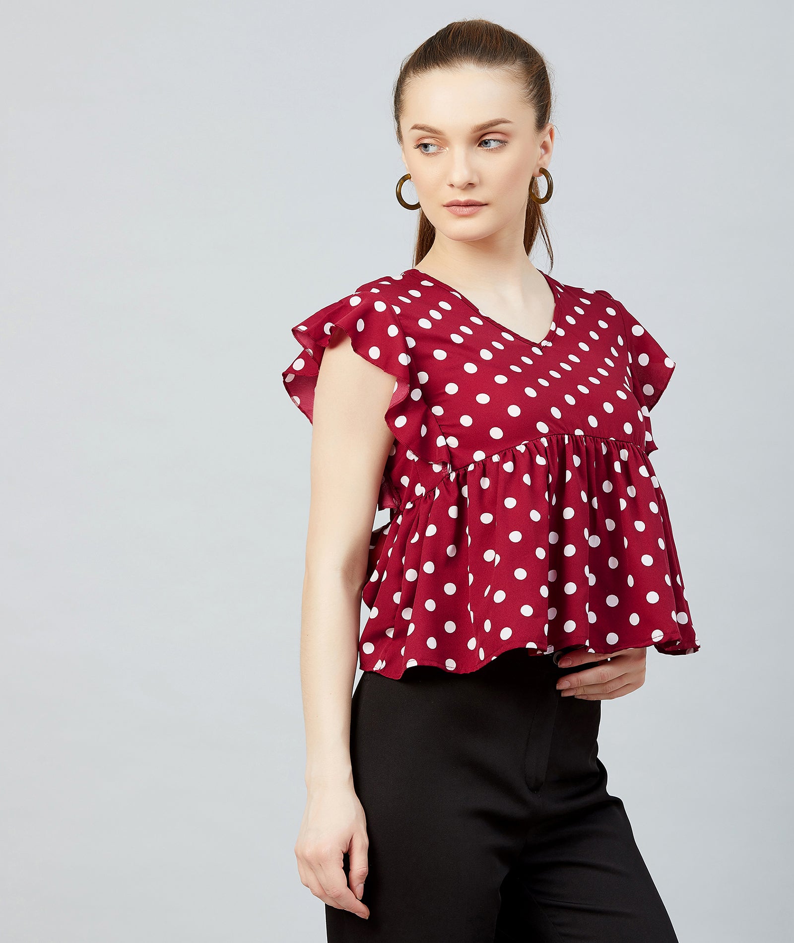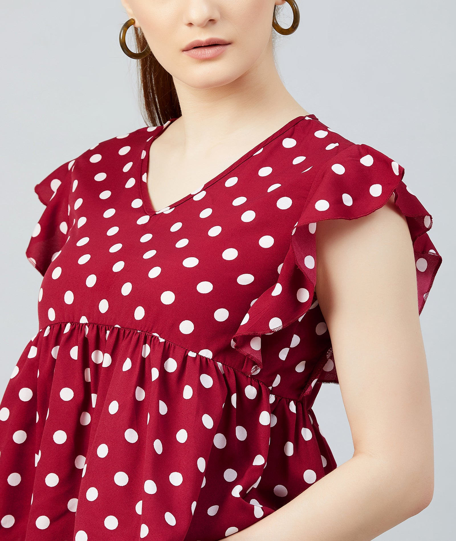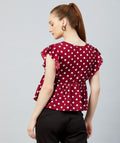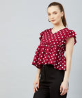 Chimpaaanzee Women Maroon Polka Doted Crepe Ruffled Top