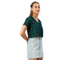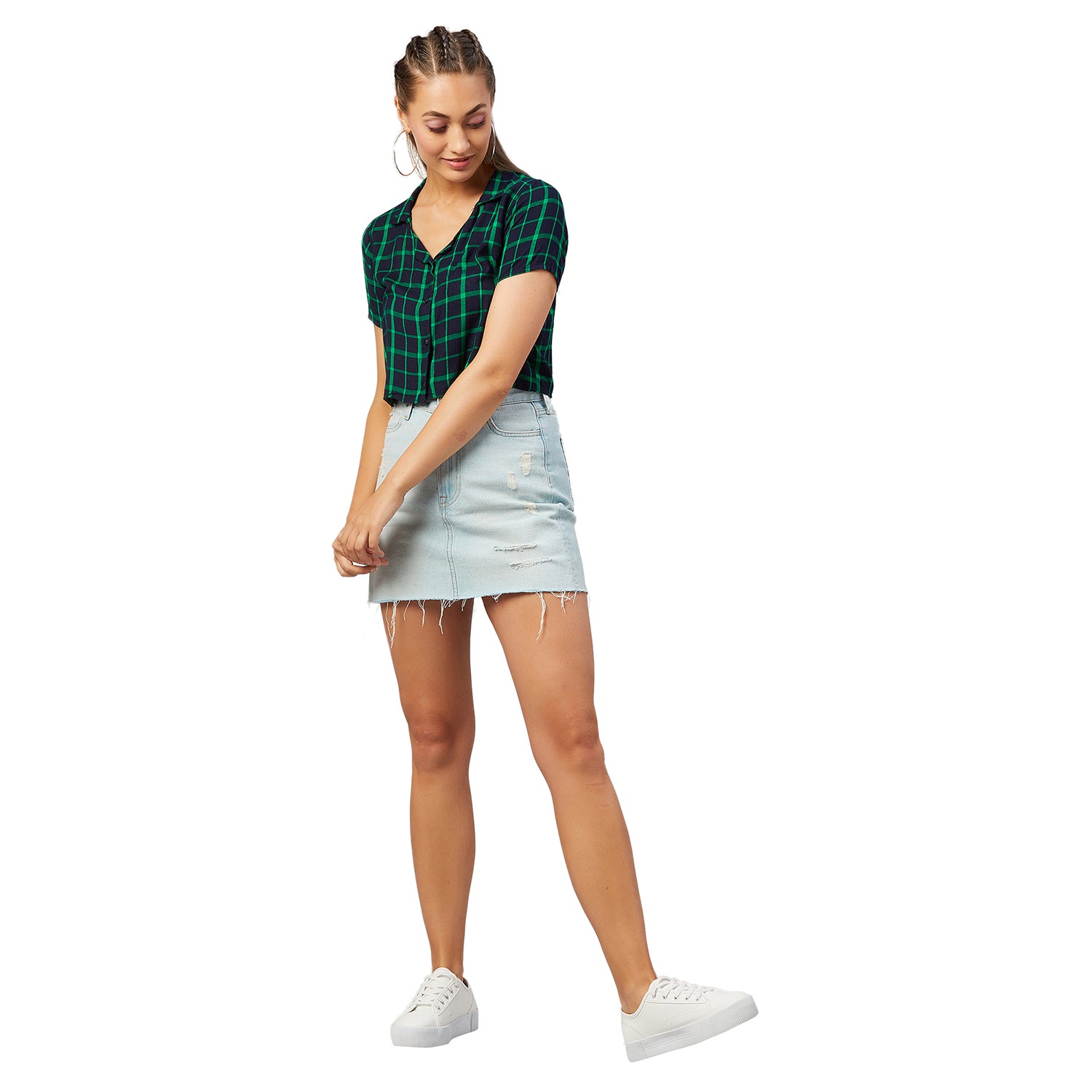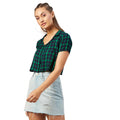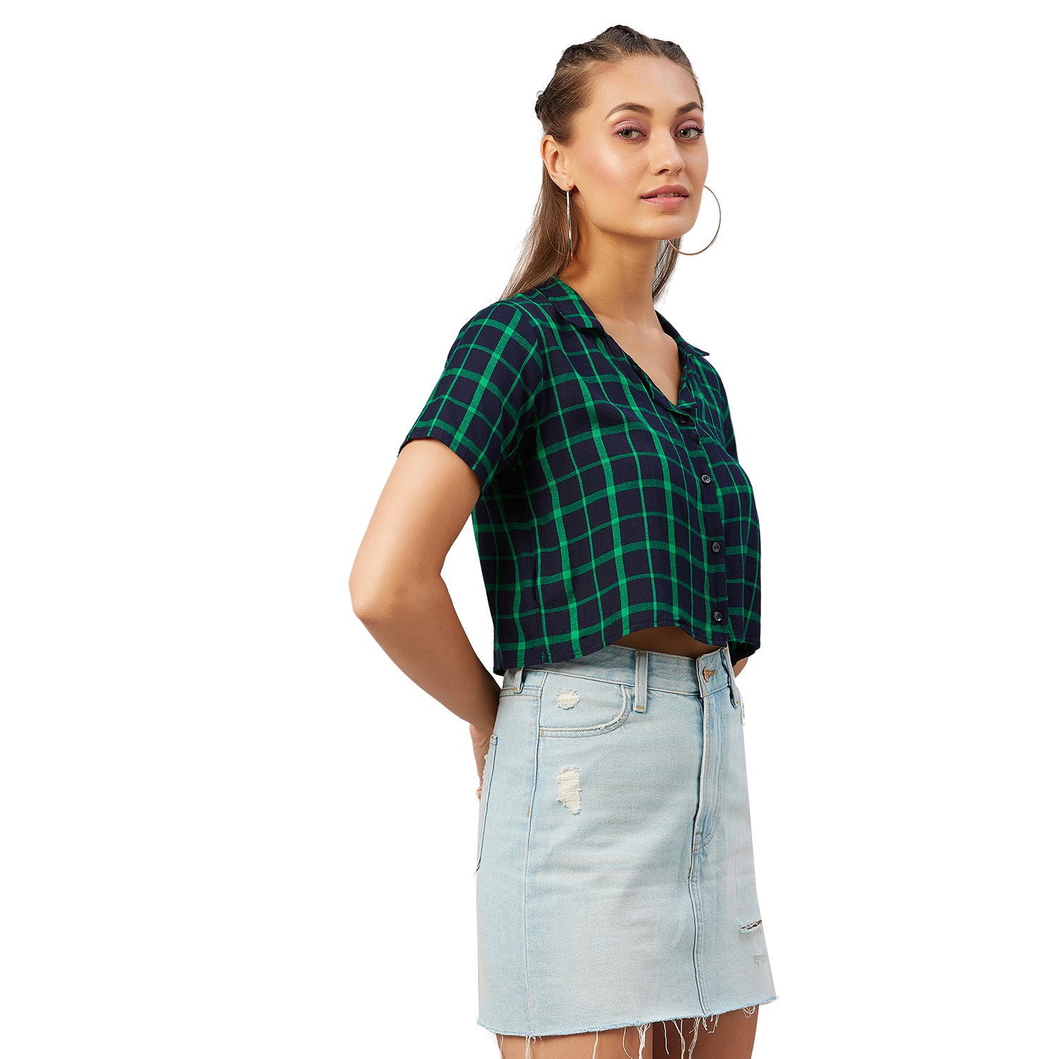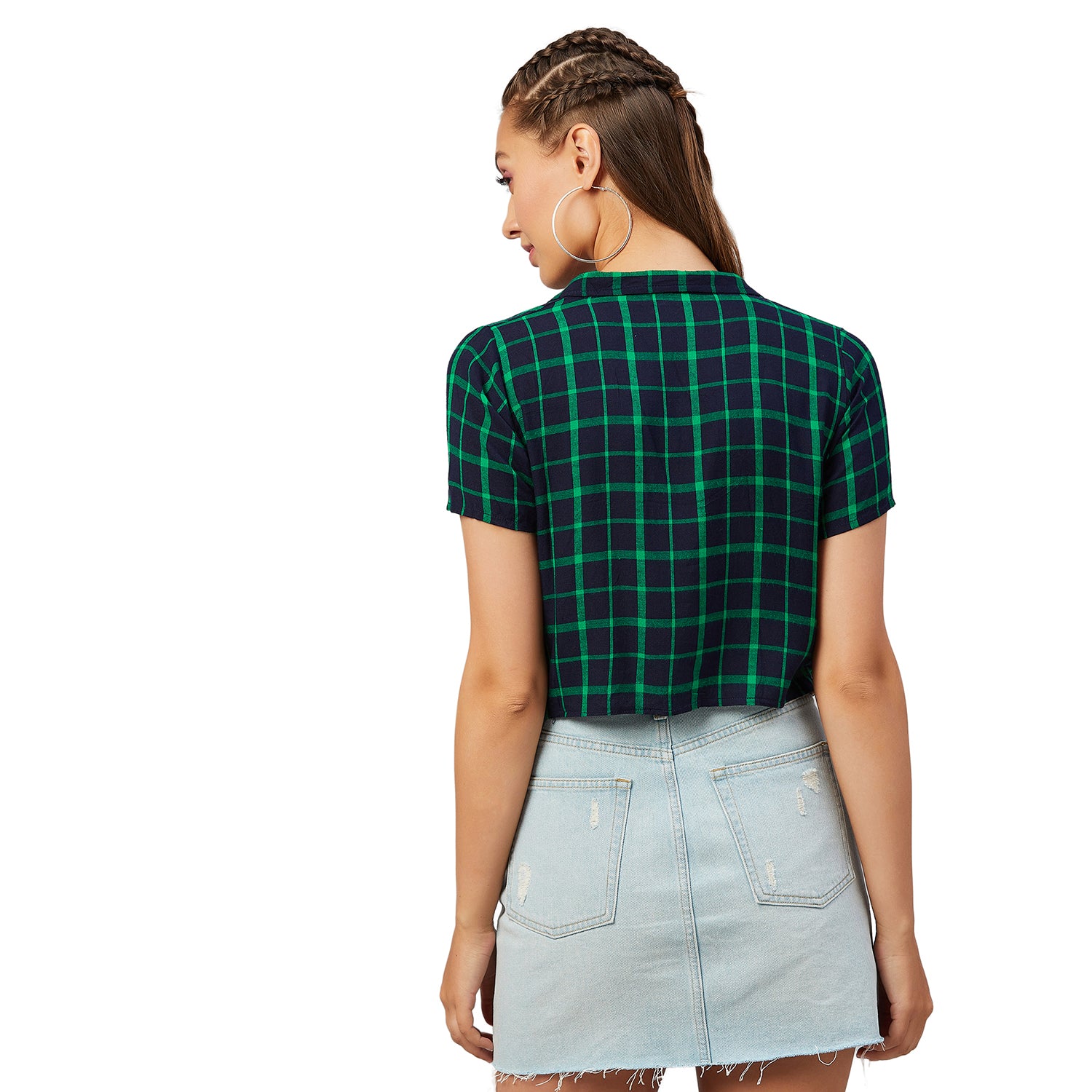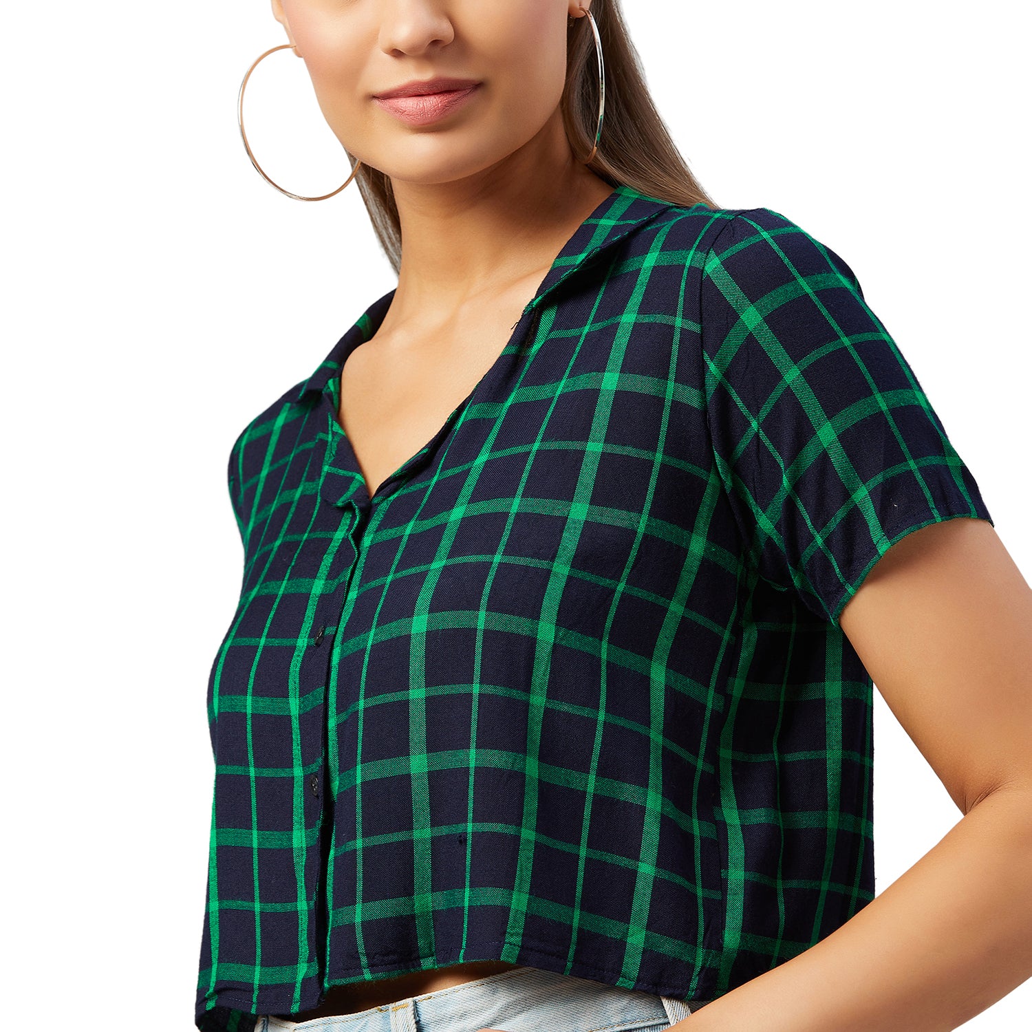 Chimpaaanzee Women Navy and Green Checkered Viscose Crop Shirt