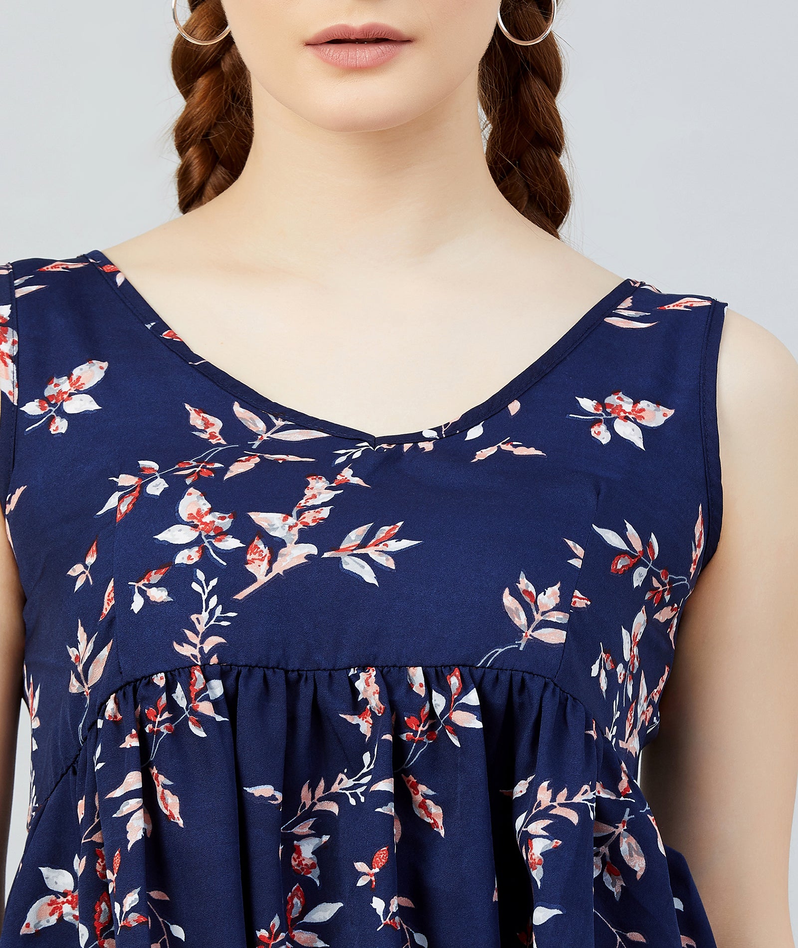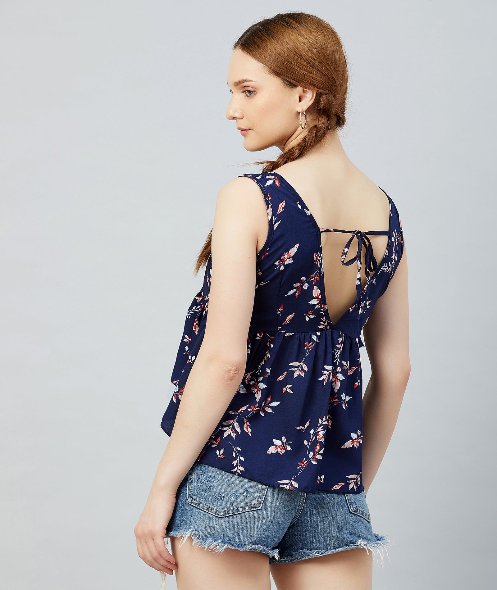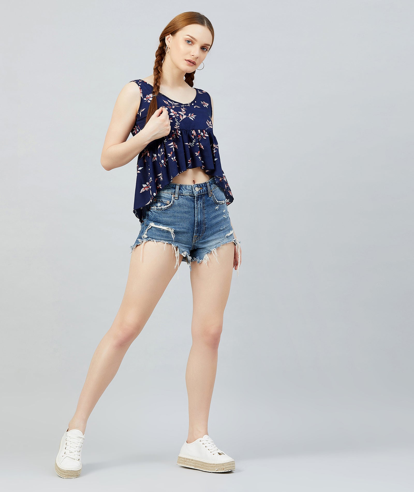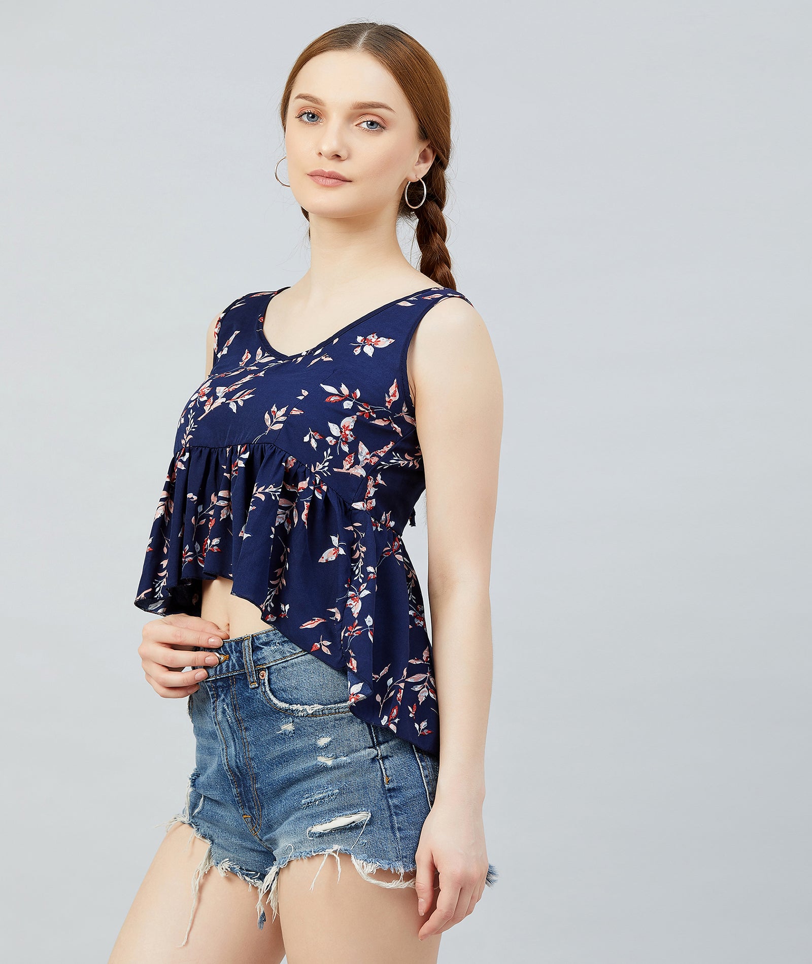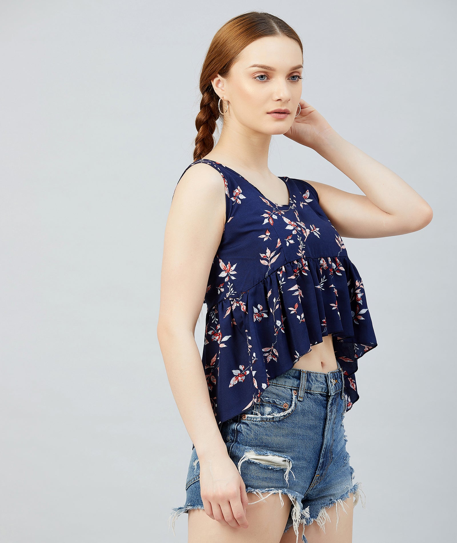 Chimpaaanzee Women Navy Flower Printed Crepe Assymetrical Top