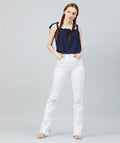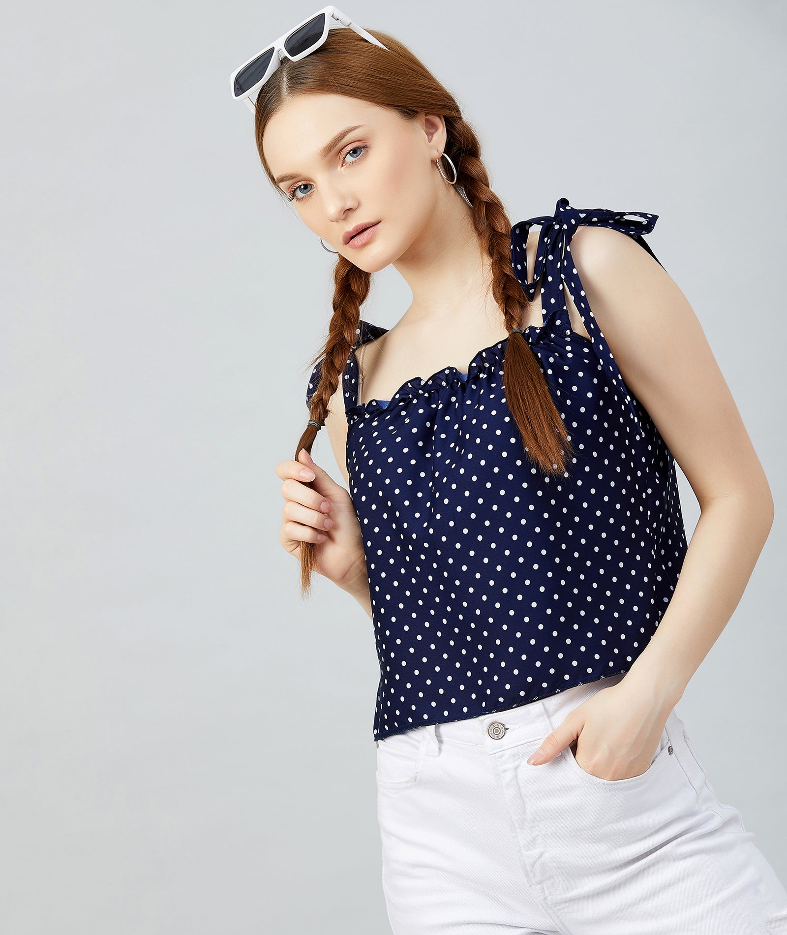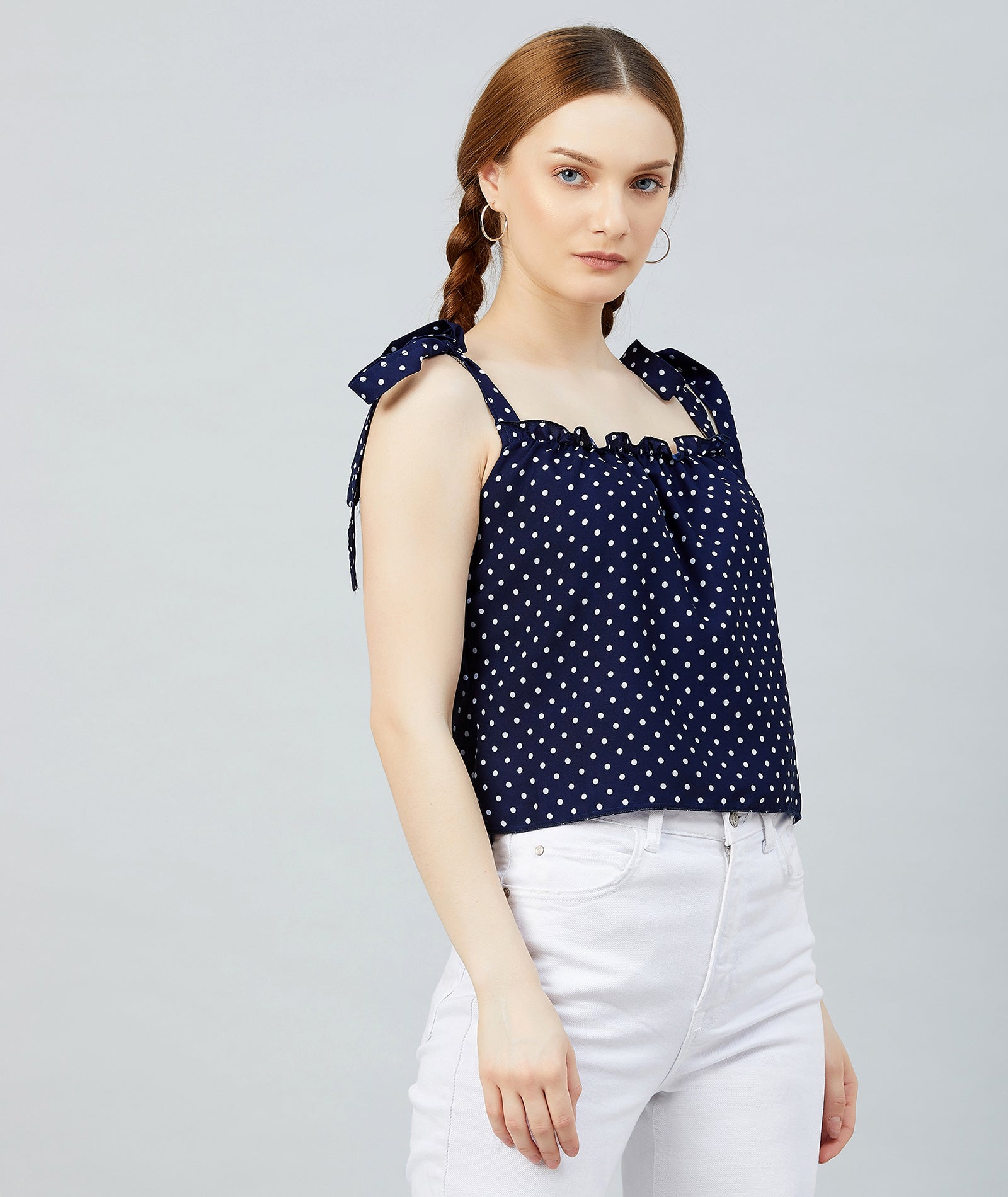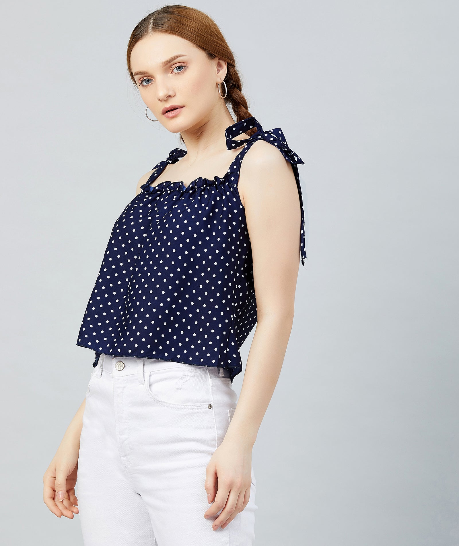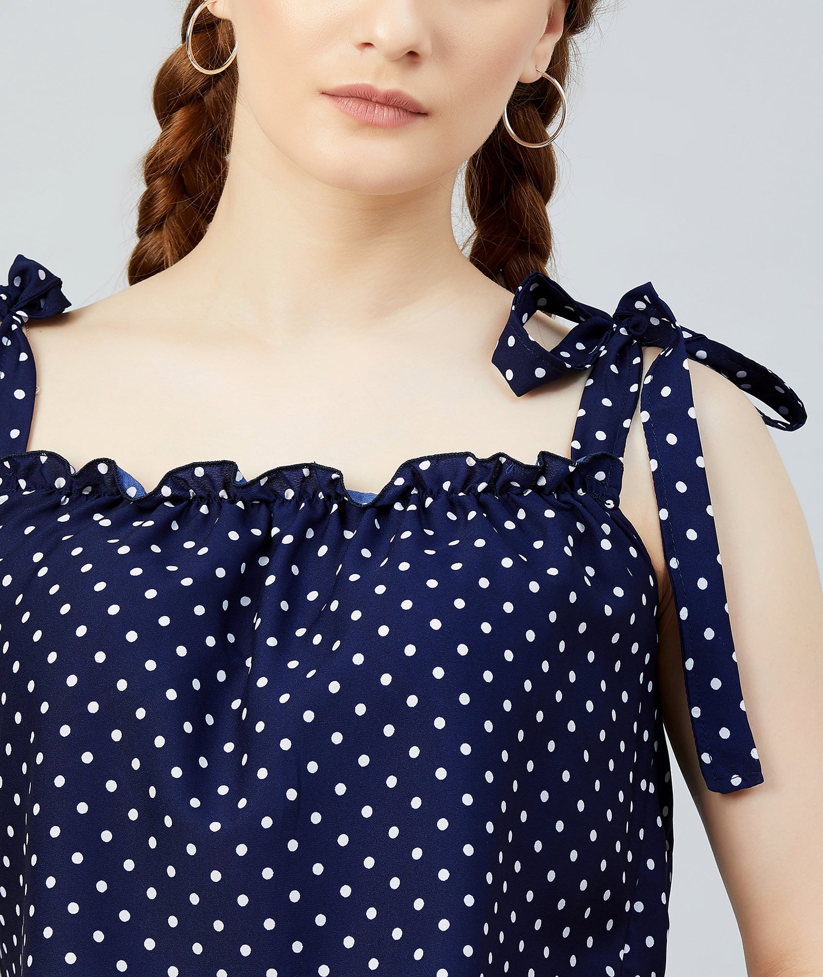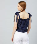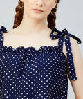 Chimpaaanzee Women Navy Polka Doted Crepe Ruffled Top