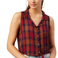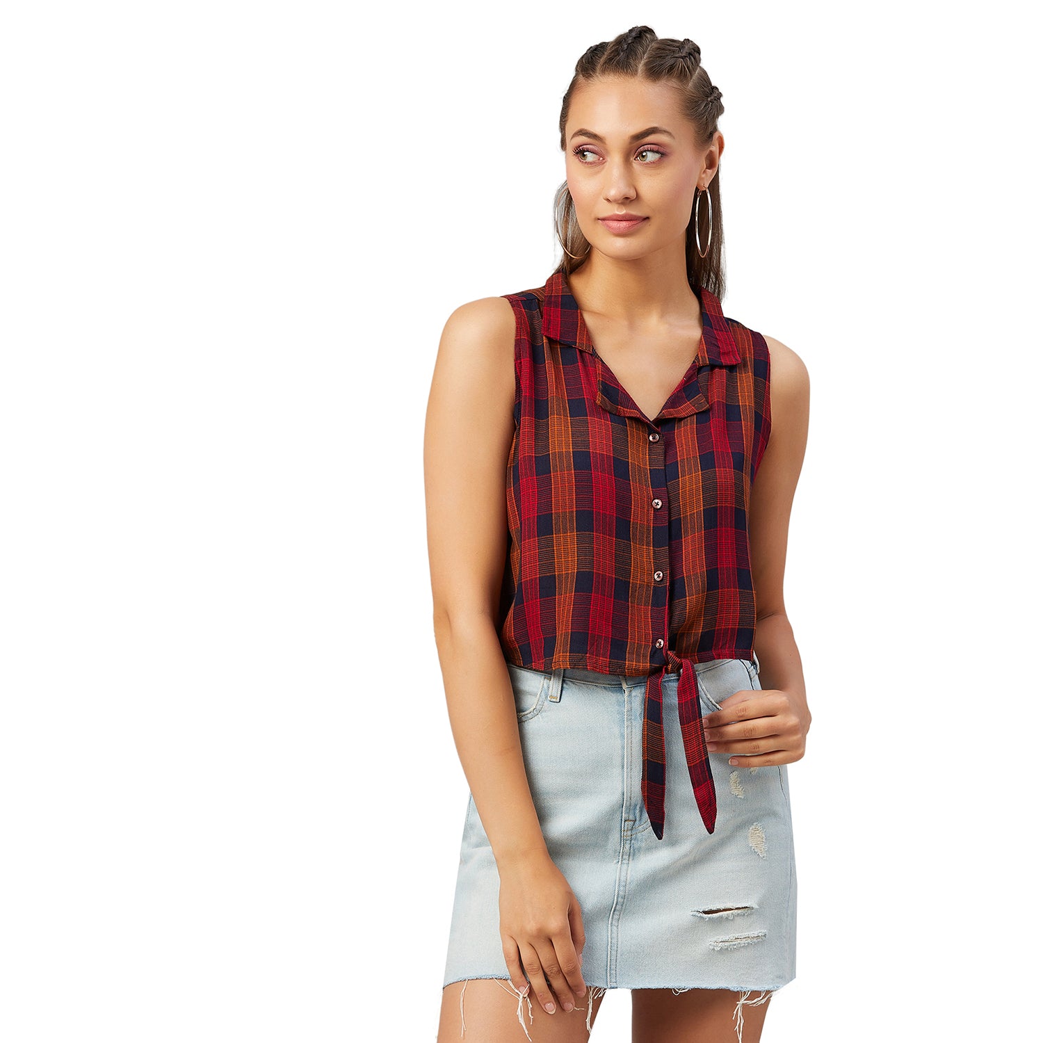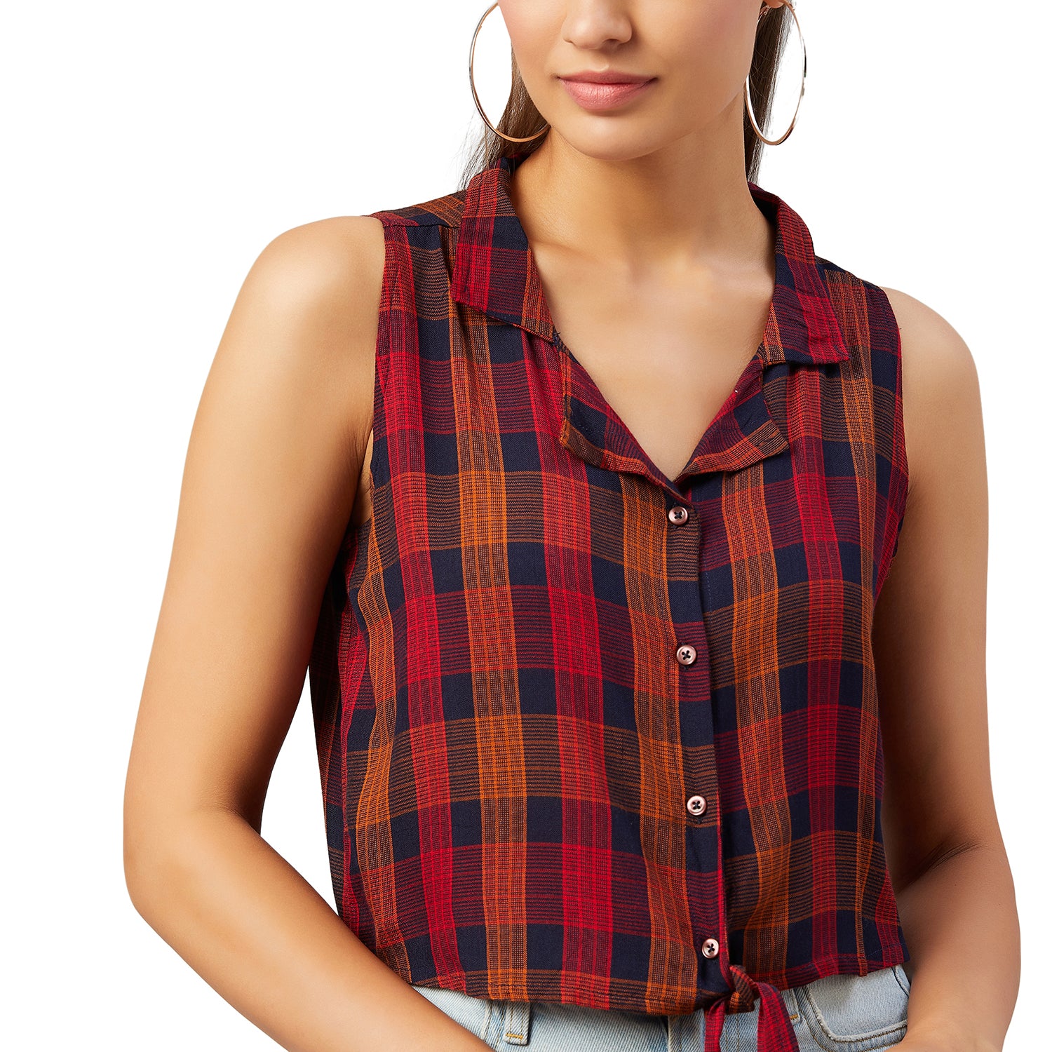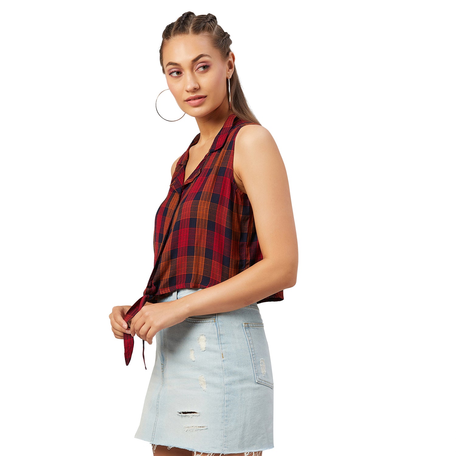 Chimpaaanzee Women Orange Checkered Viscose Knotted Crop Top