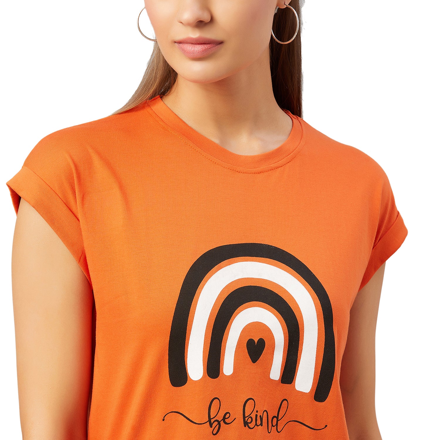 Chimpaaanzee Women Orange Folded Sleeve Round Neck T-shirt