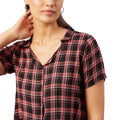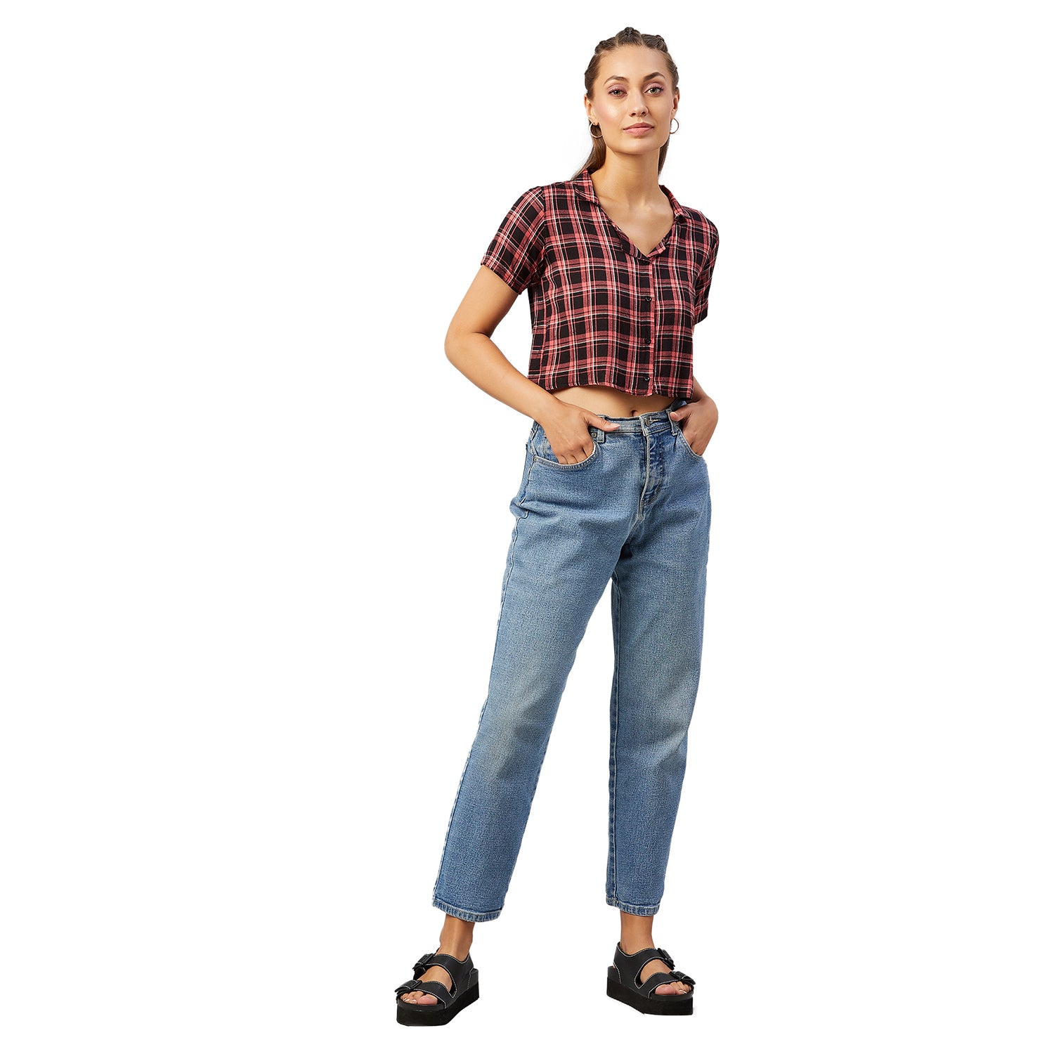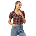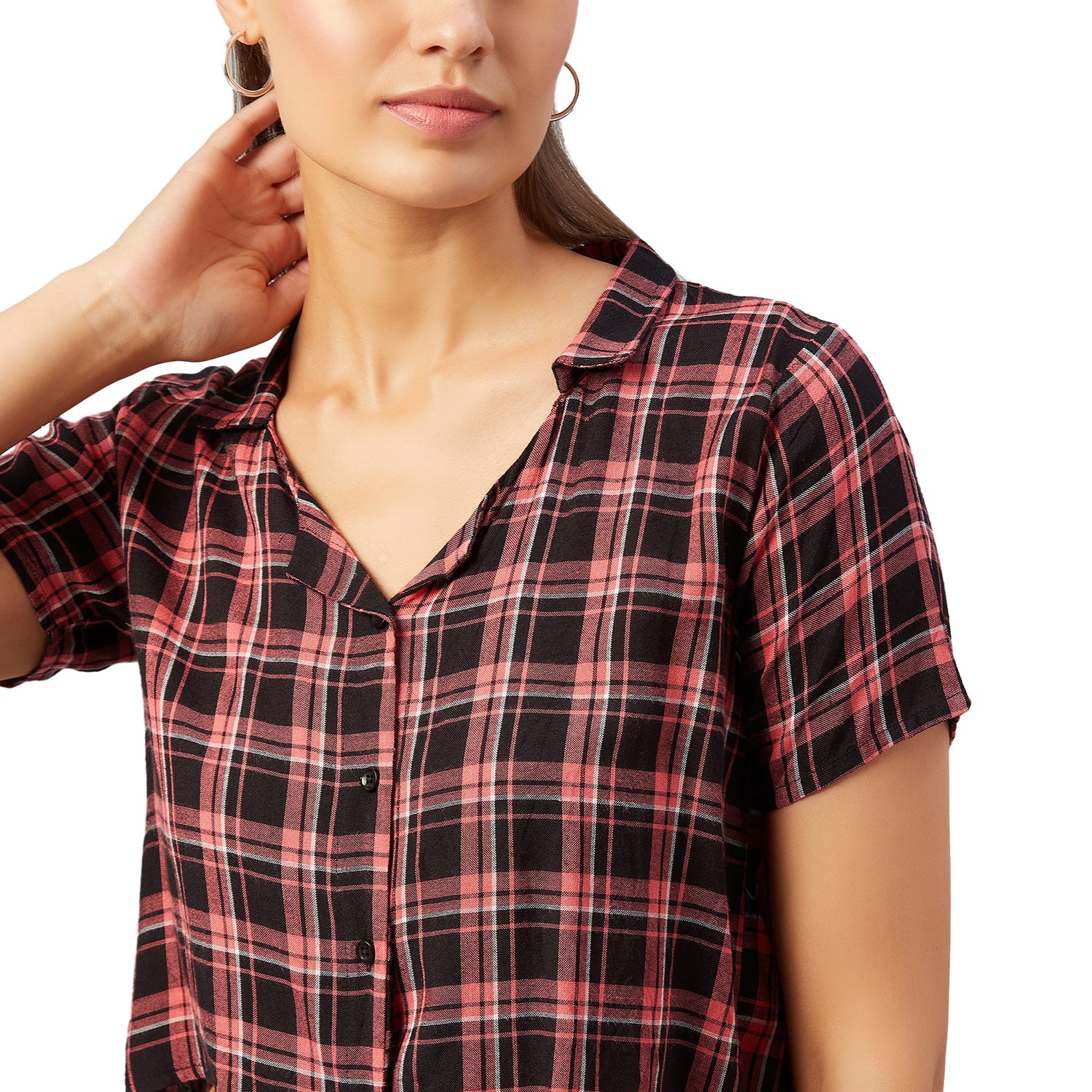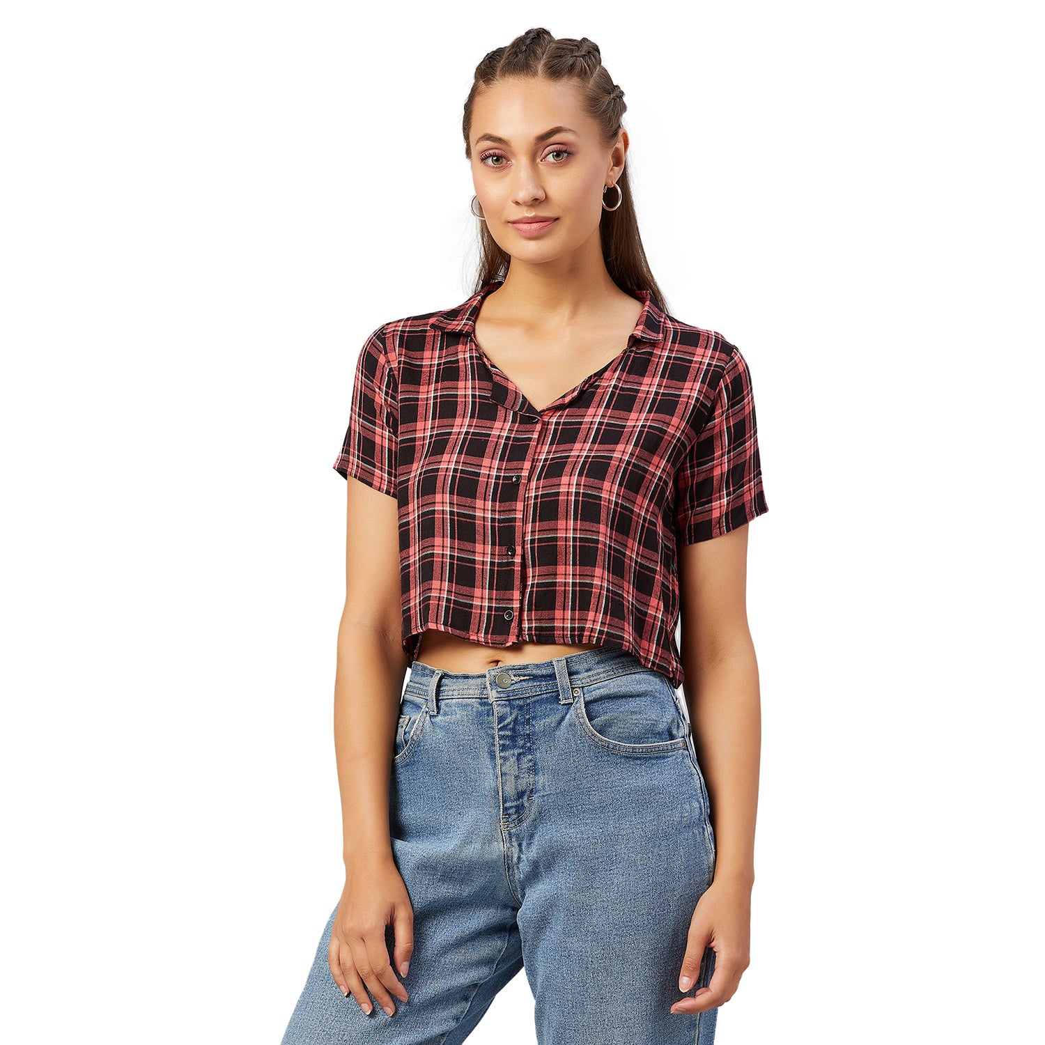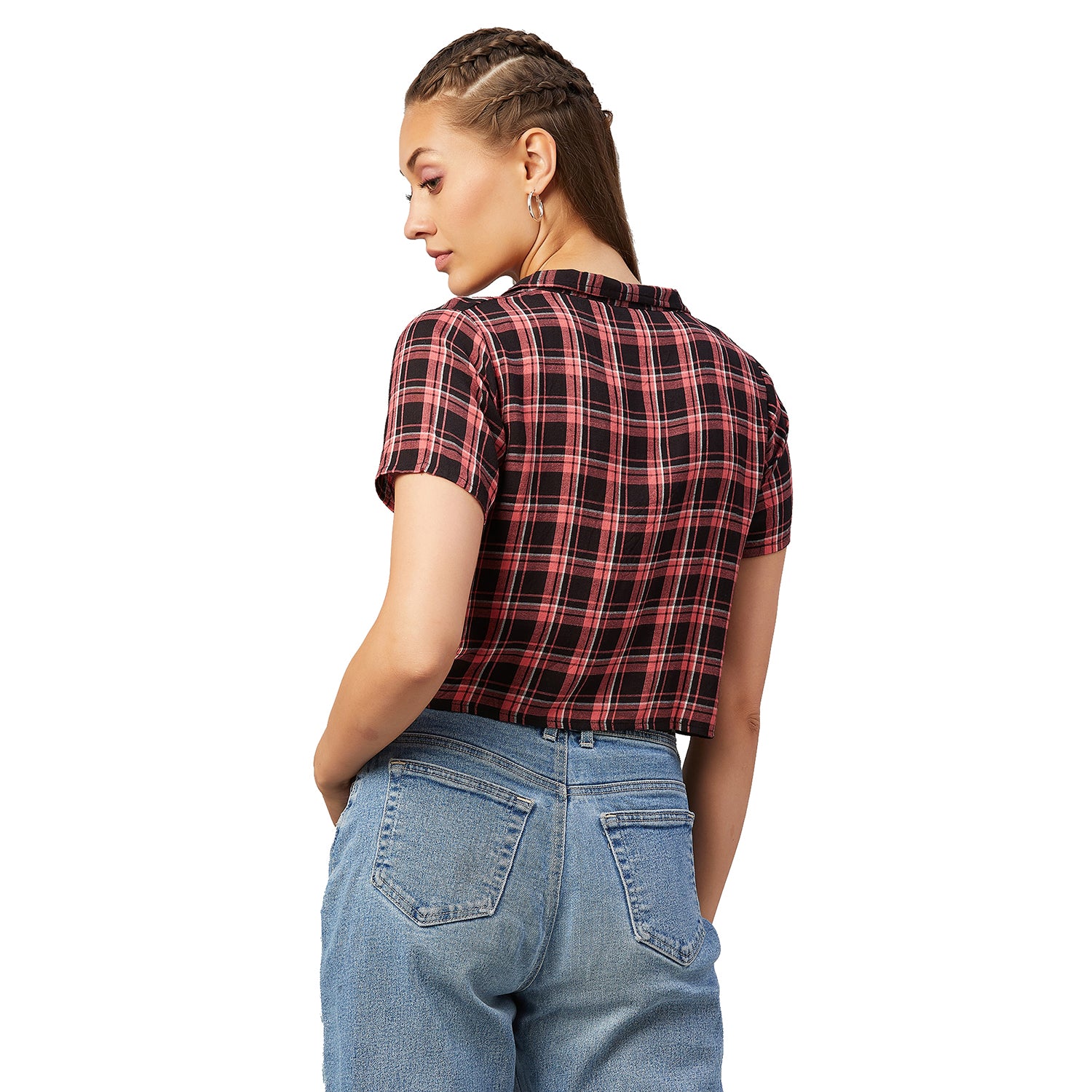 Chimpaaanzee Women Pink and Black Checkered Viscose Crop Shirt