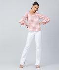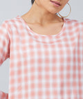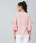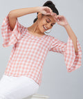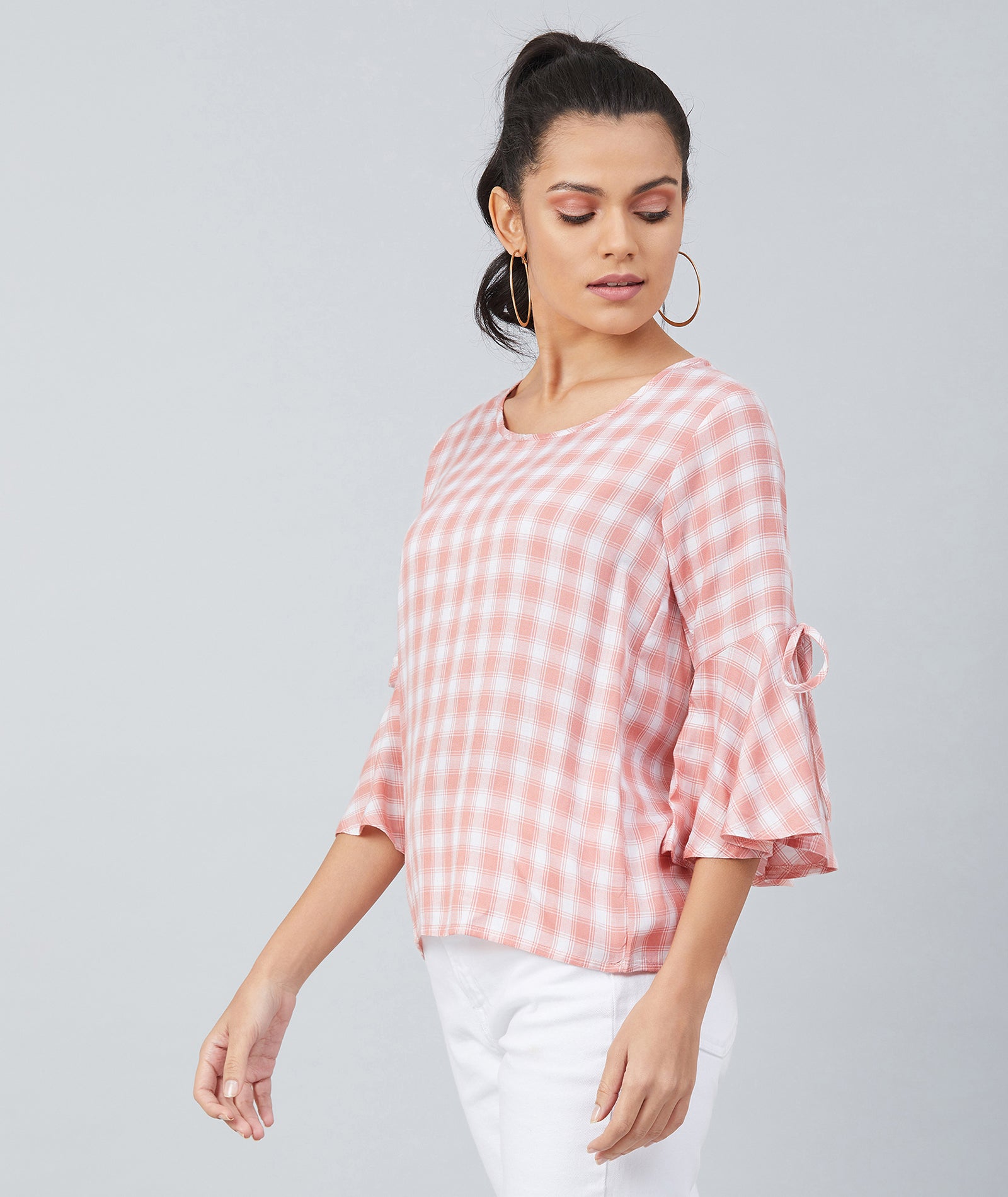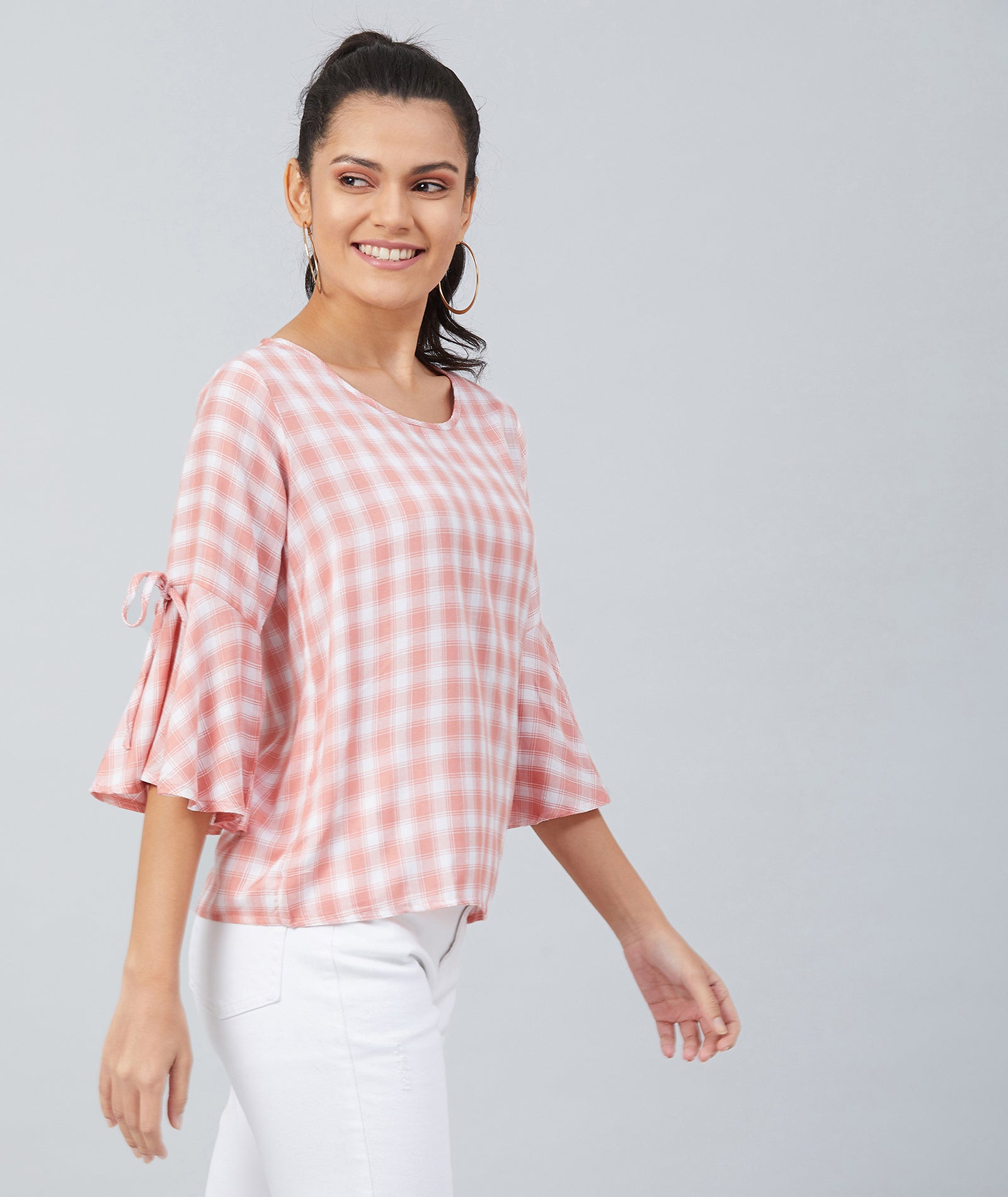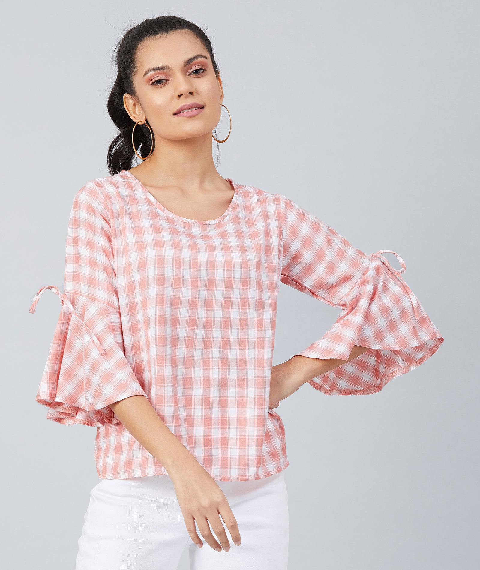 Chimpaaanzee Women Pink and White Checks Bell Knot Sleeve top