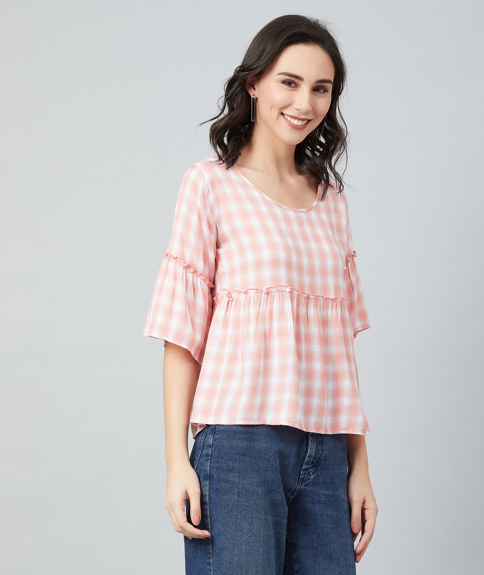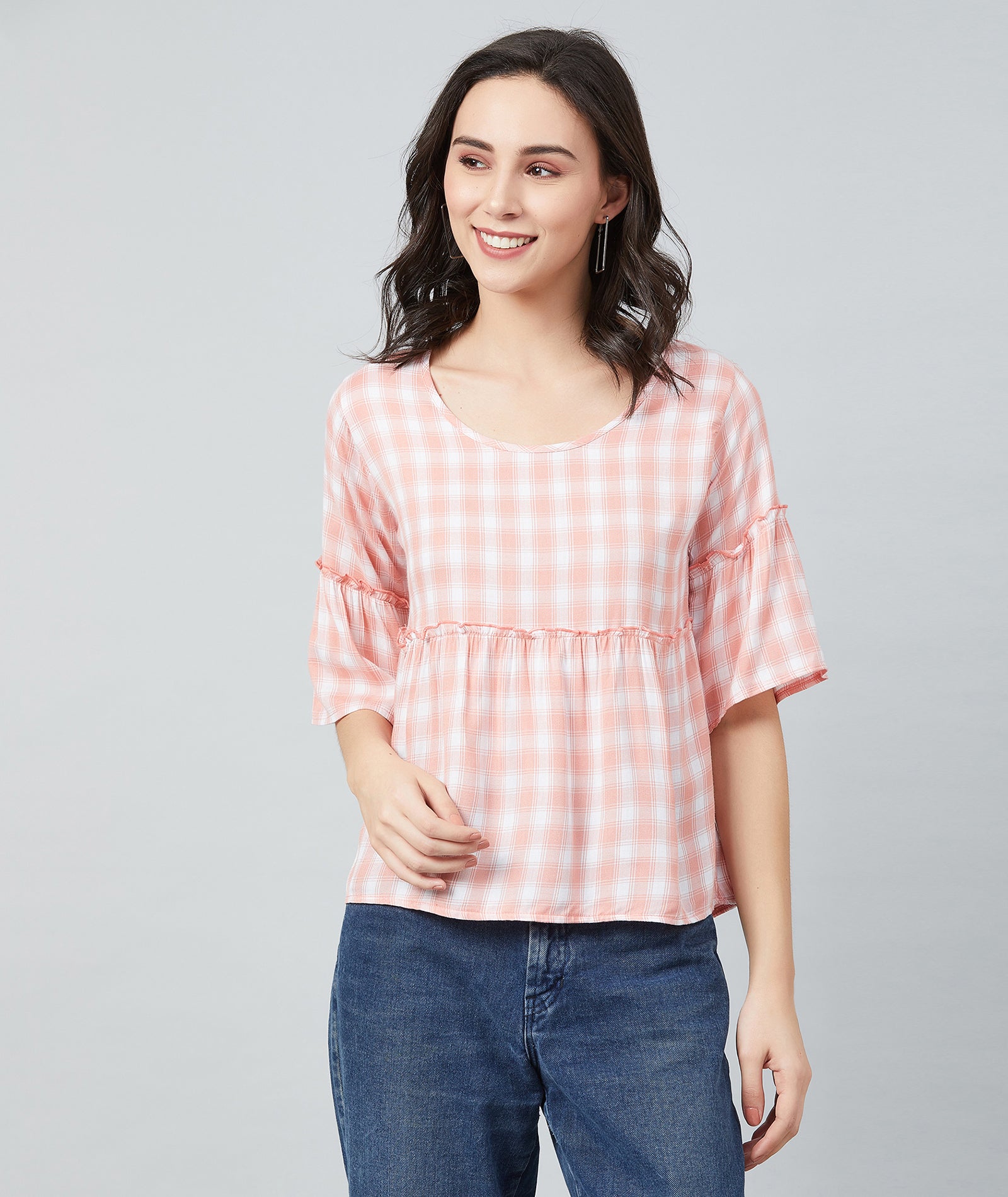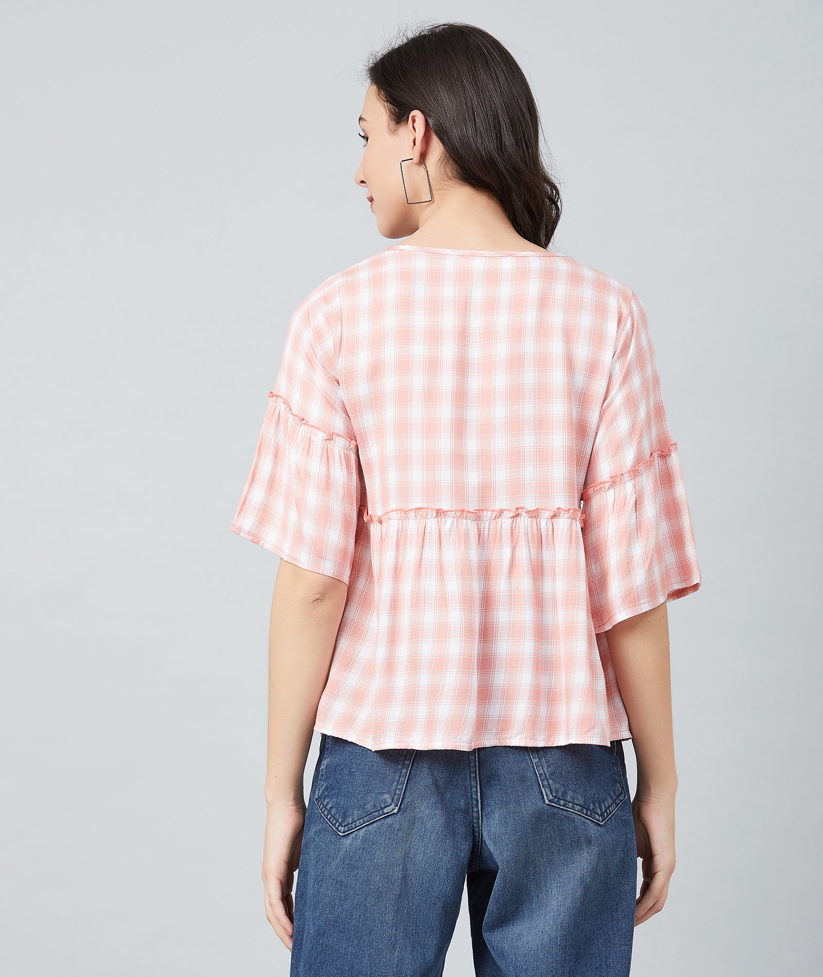 Chimpaaanzee Women Pink and White Checks Frill Style Top