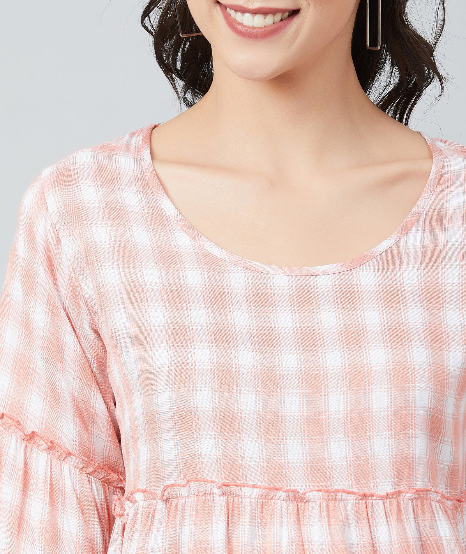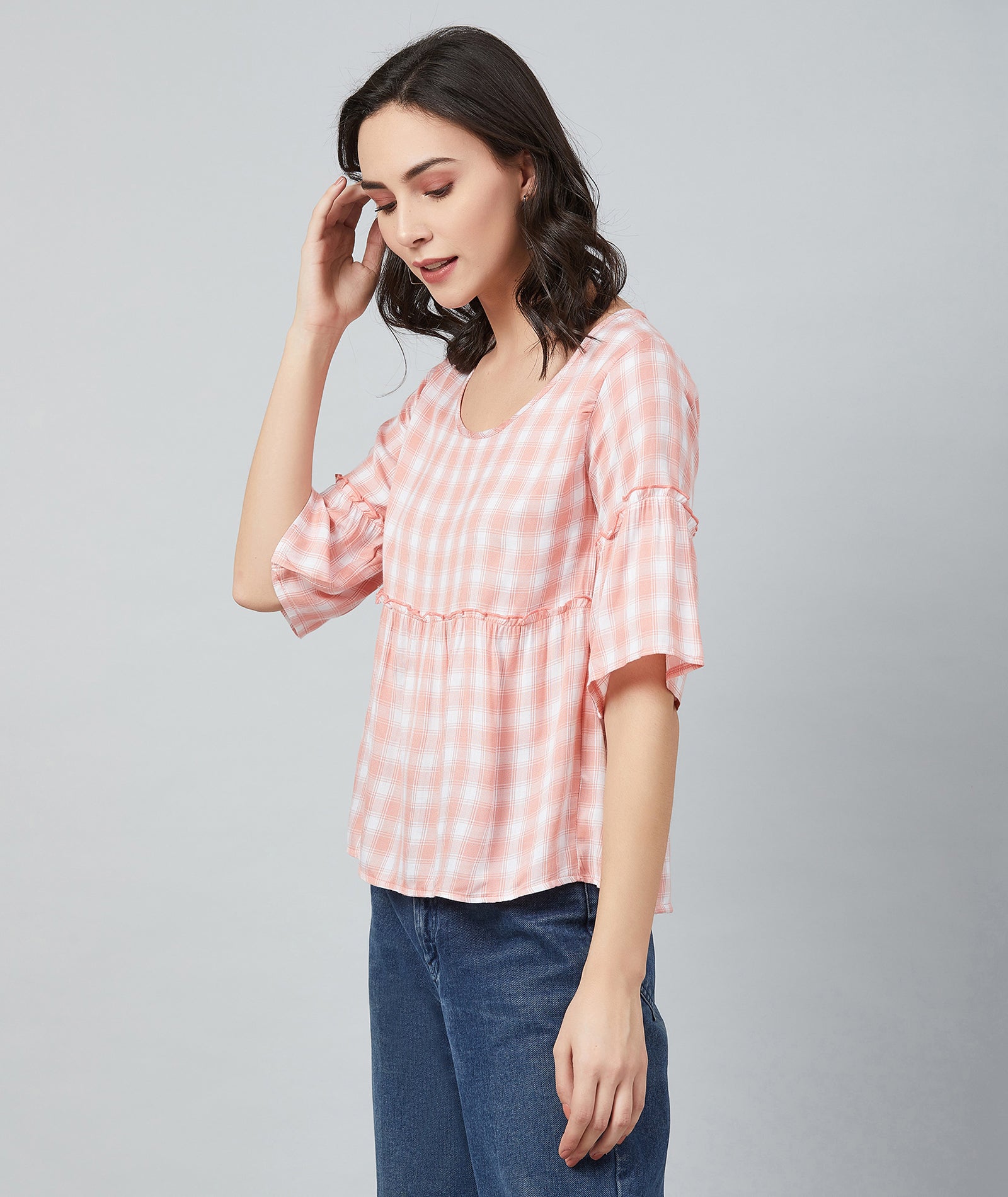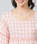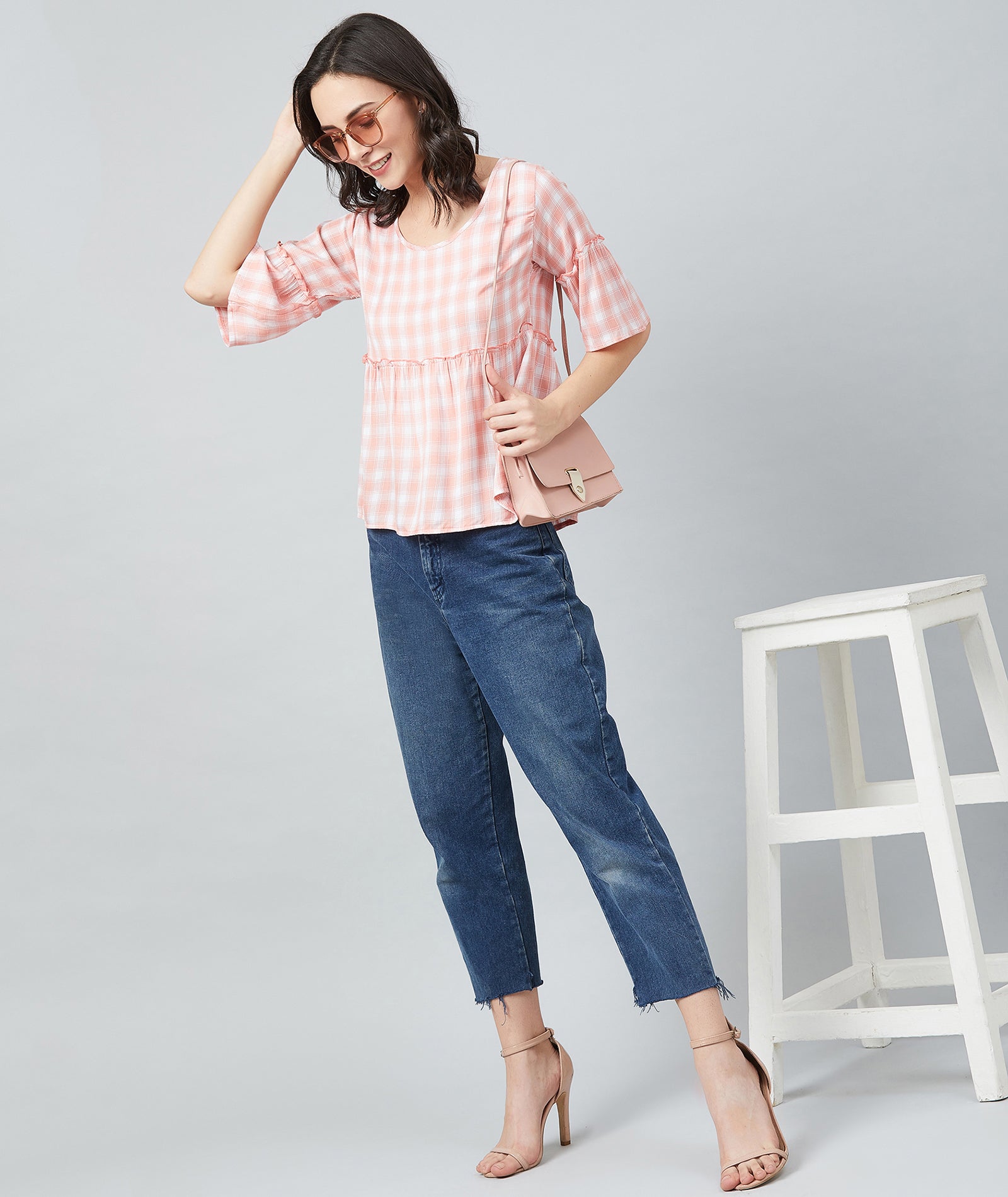 Chimpaaanzee Women Pink and White Checks Frill Style Top