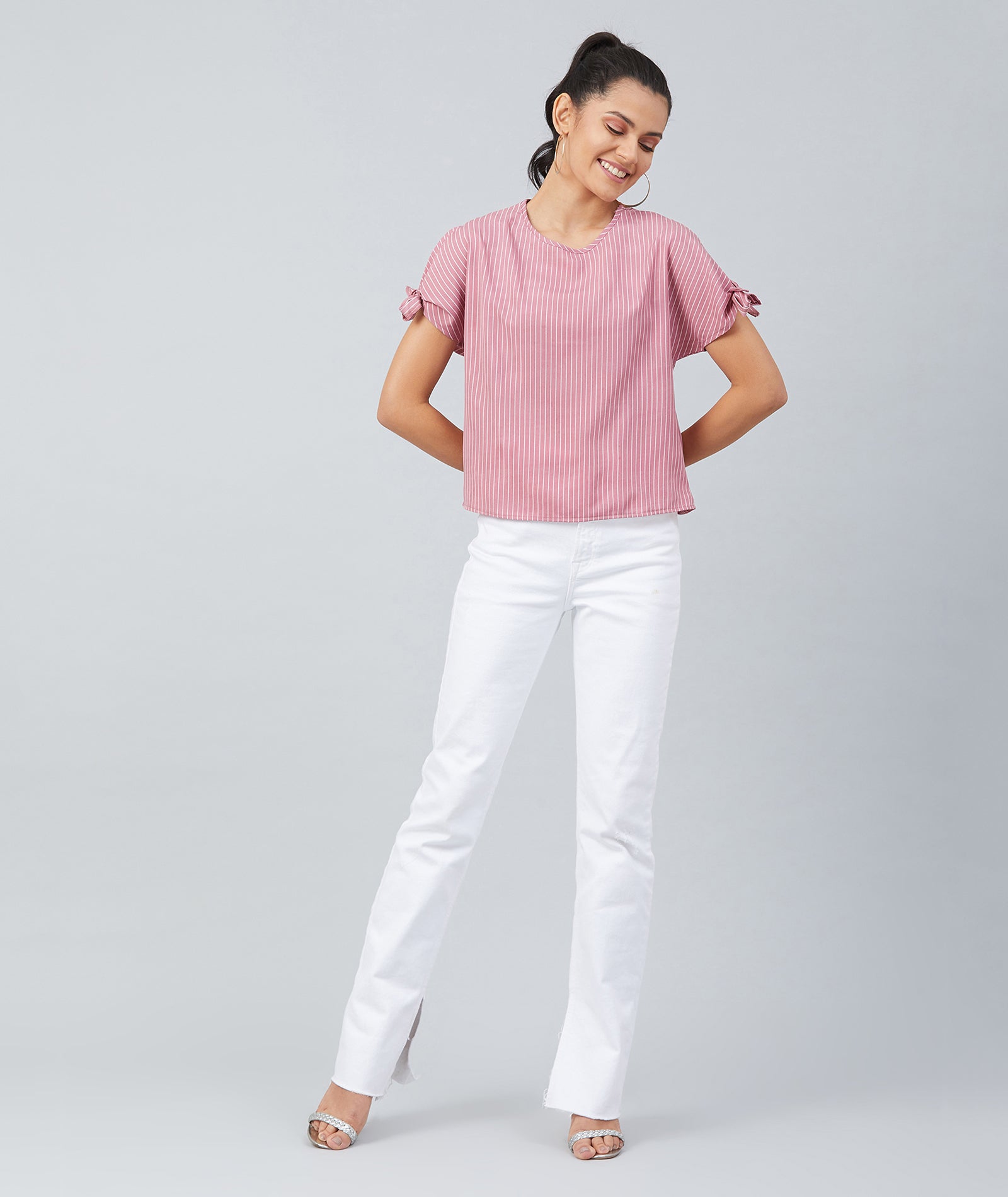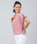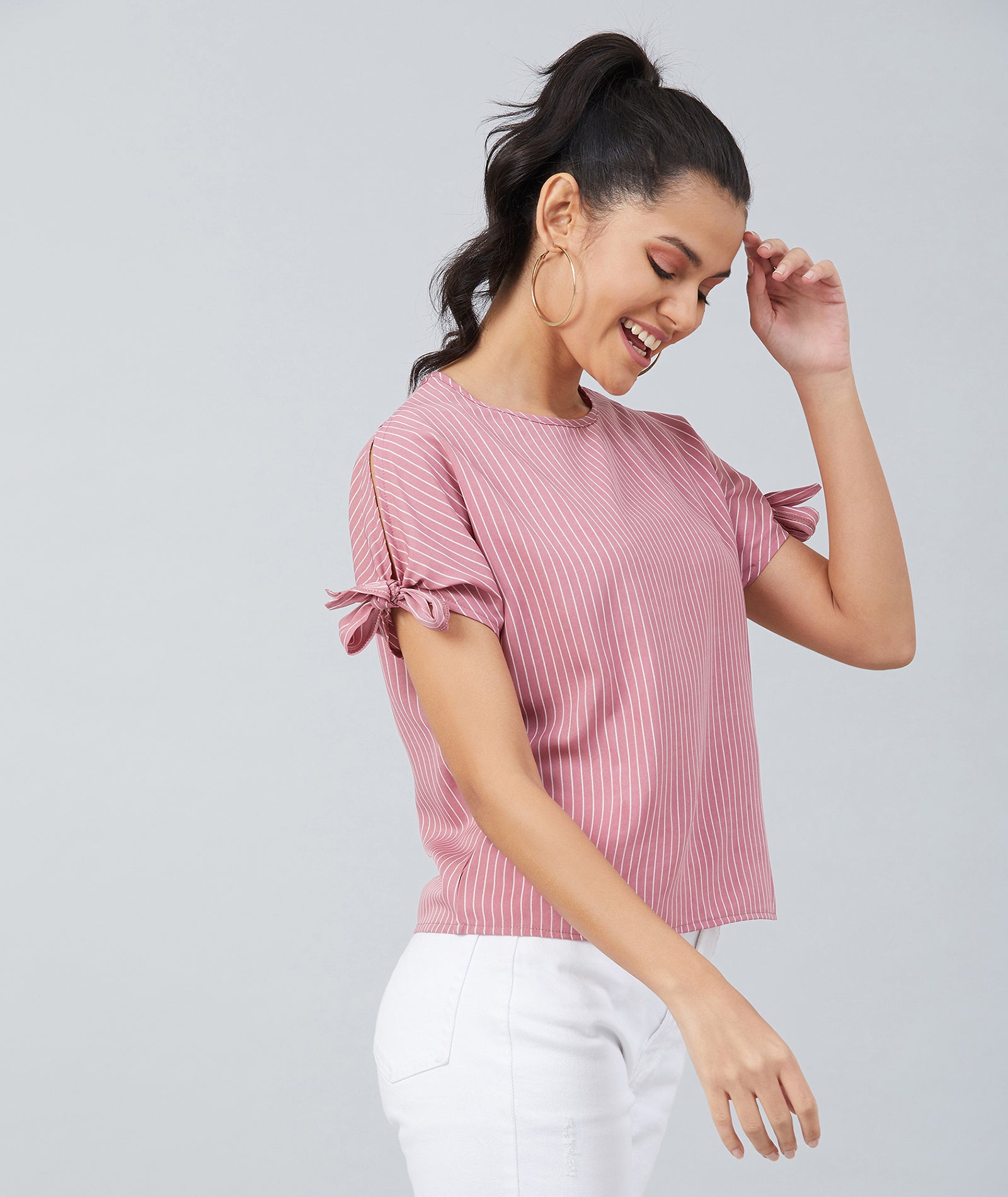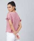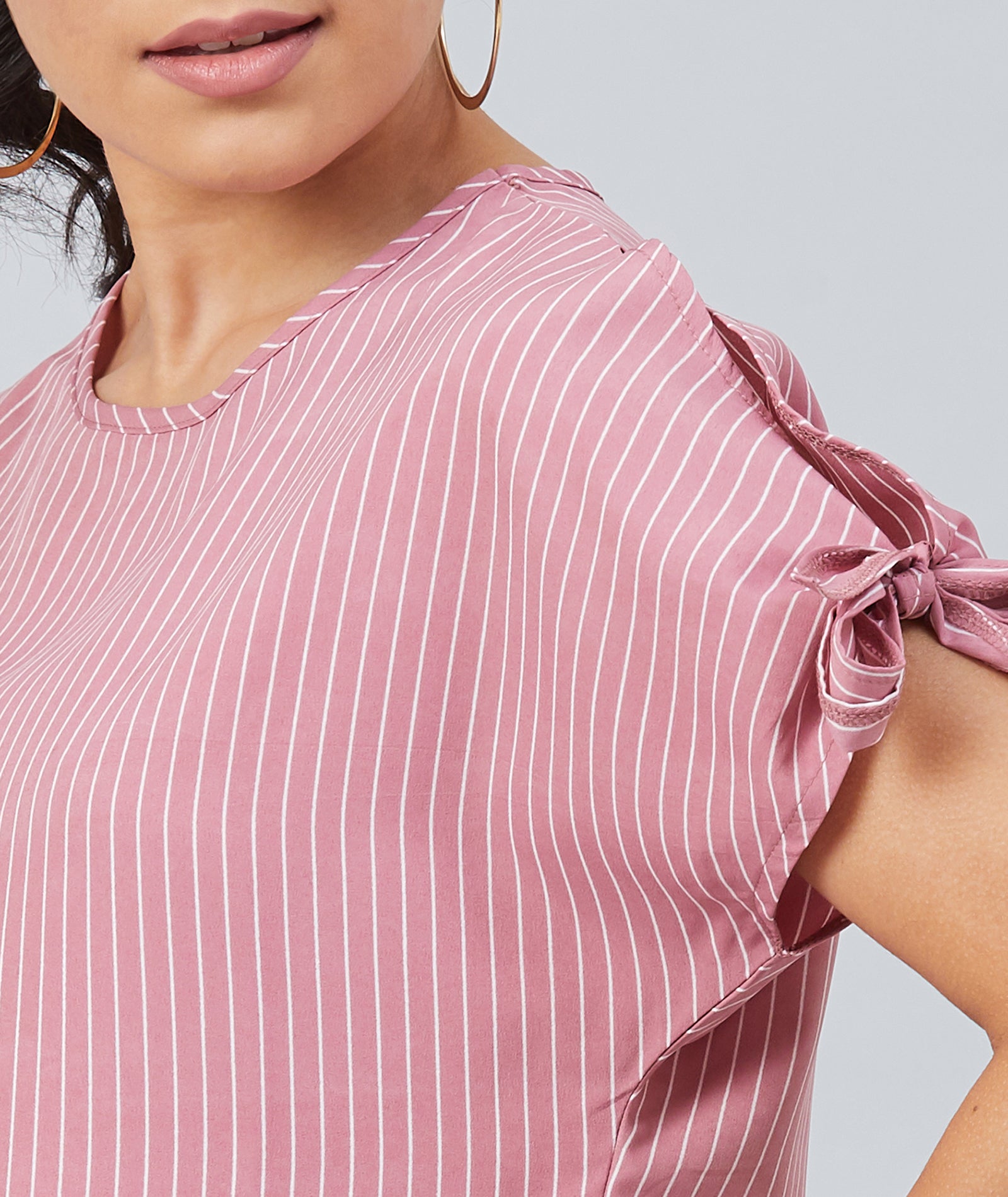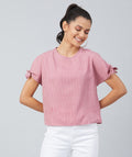 Chimpaaanzee Women Pink Crepe Stripe Knotted Sleeve Top