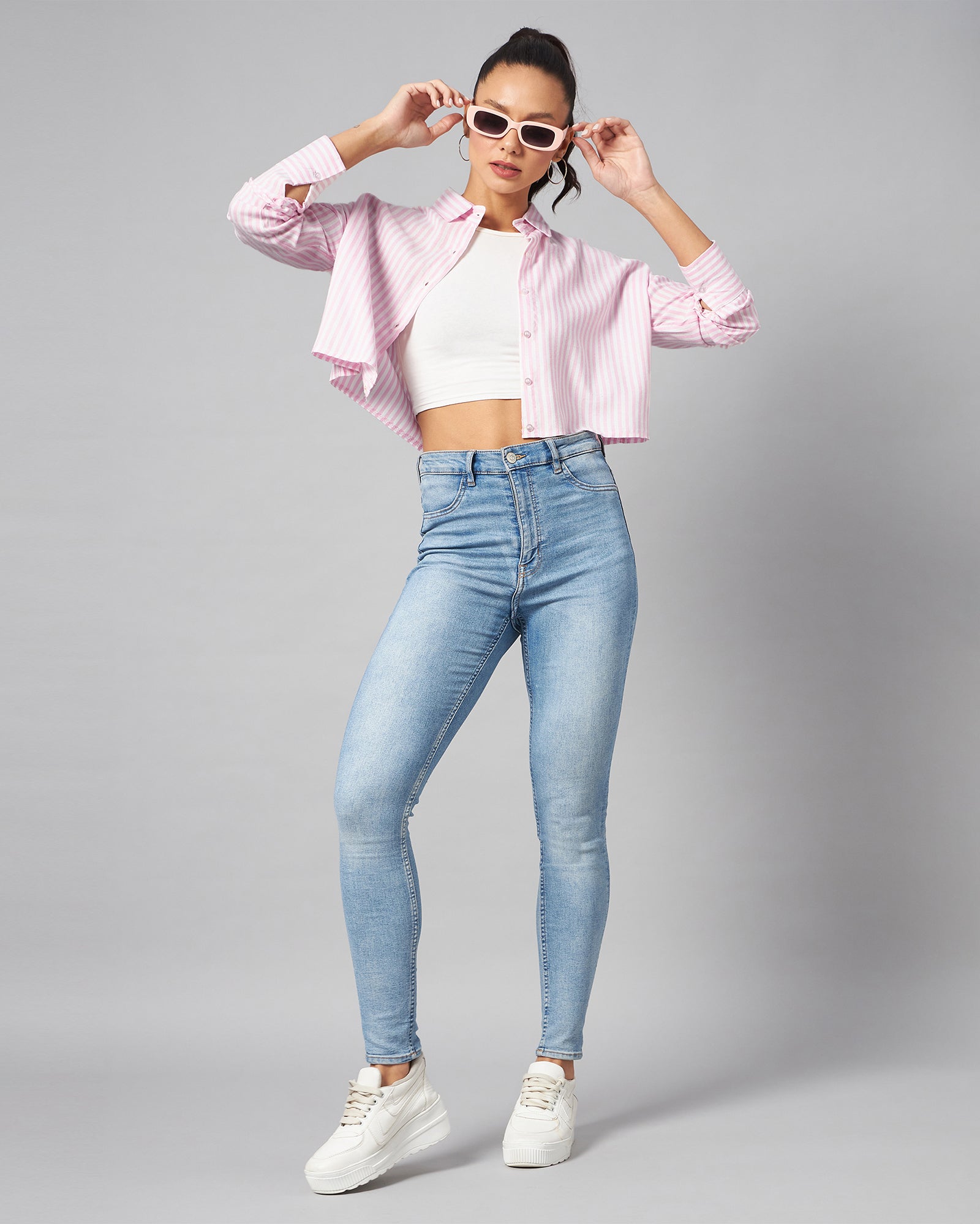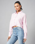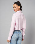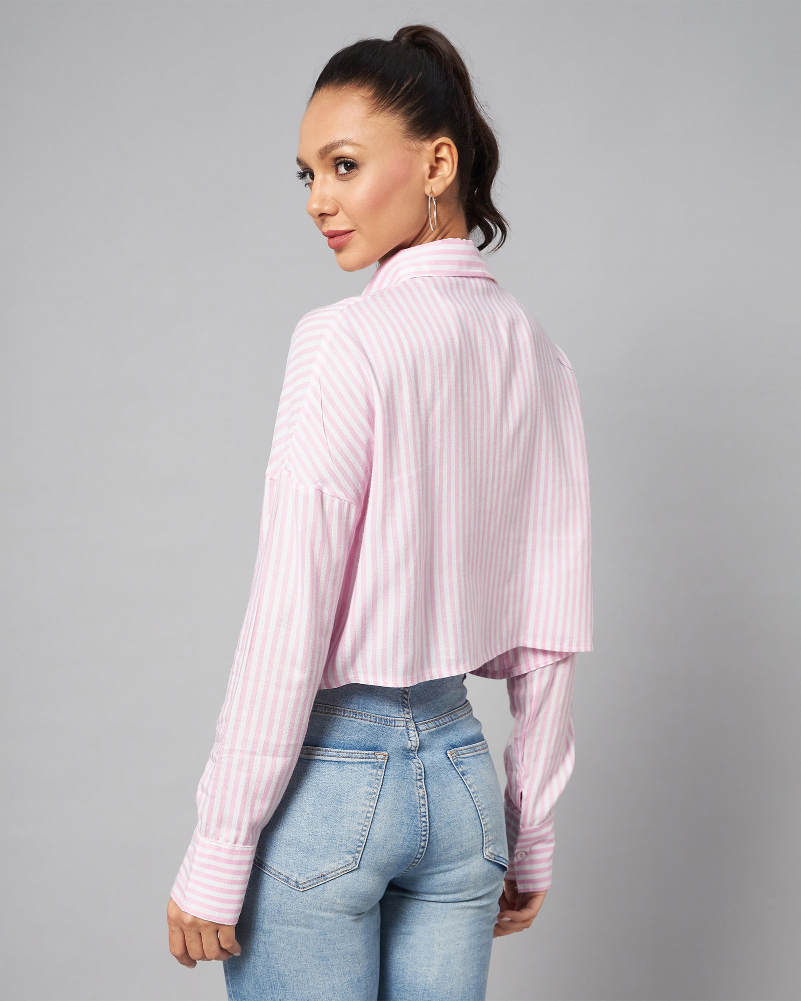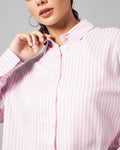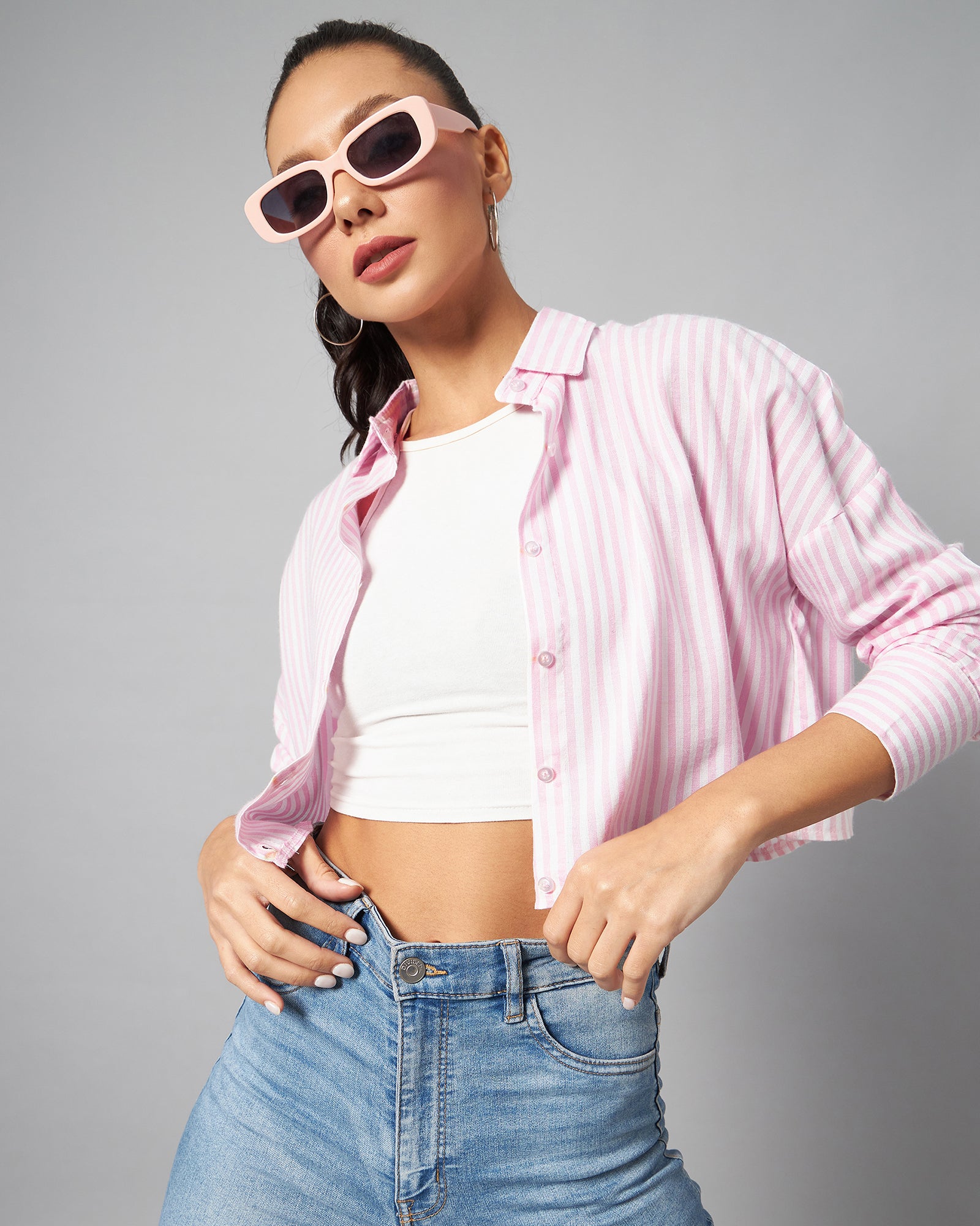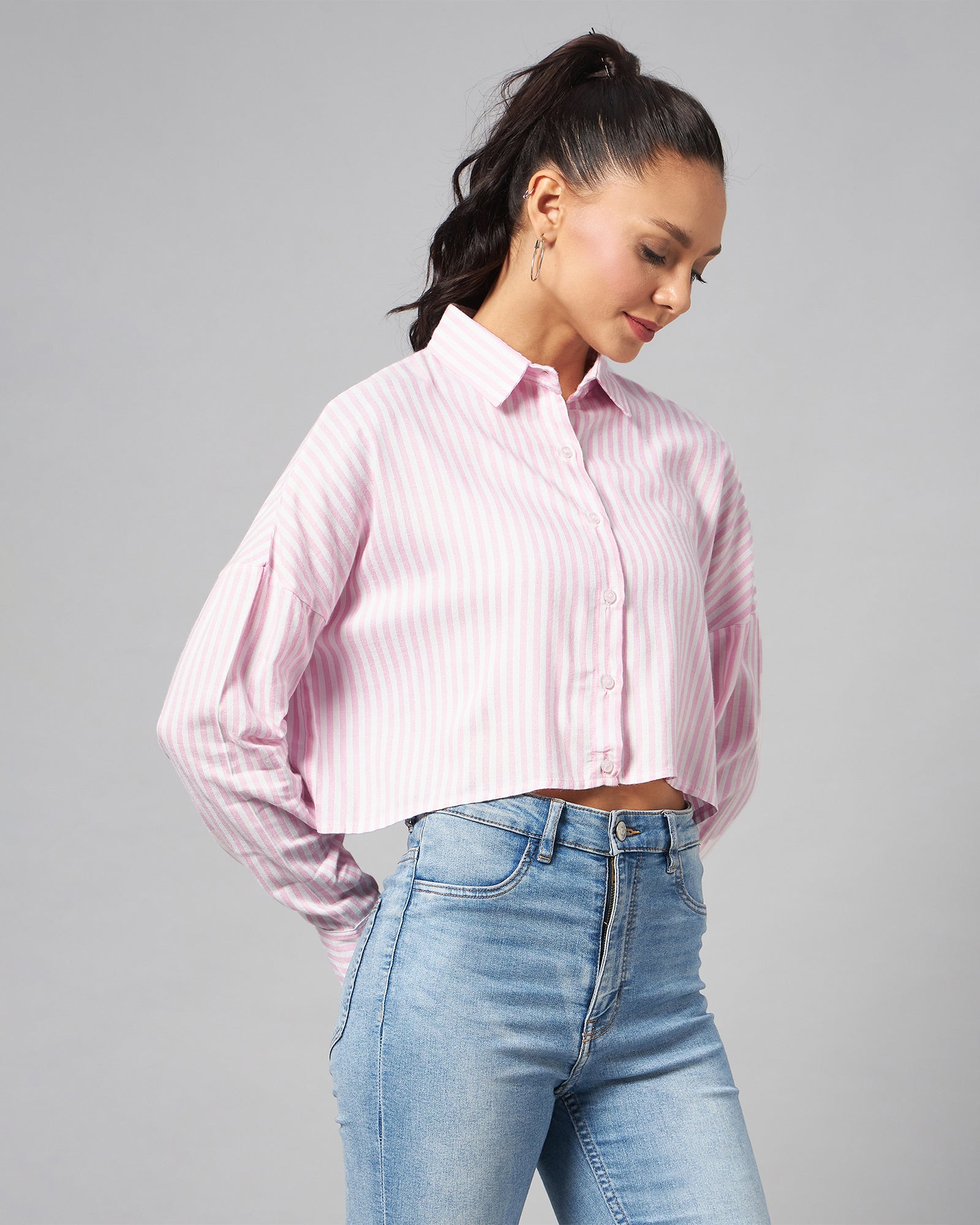Chimpaaanzee Women Pink & White Stripe Full Sleeve Drop Shoulder Crop Shirt
