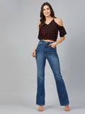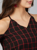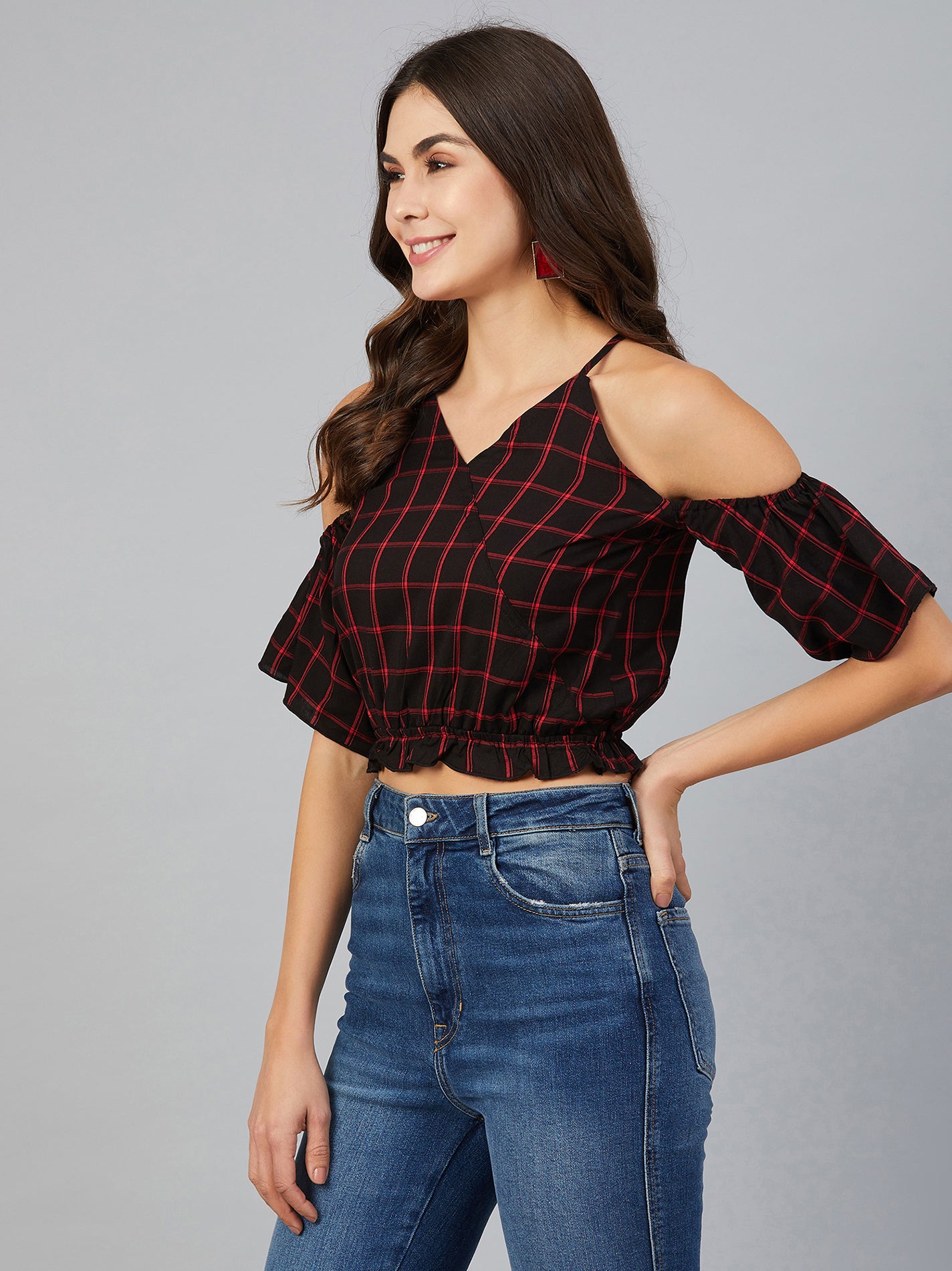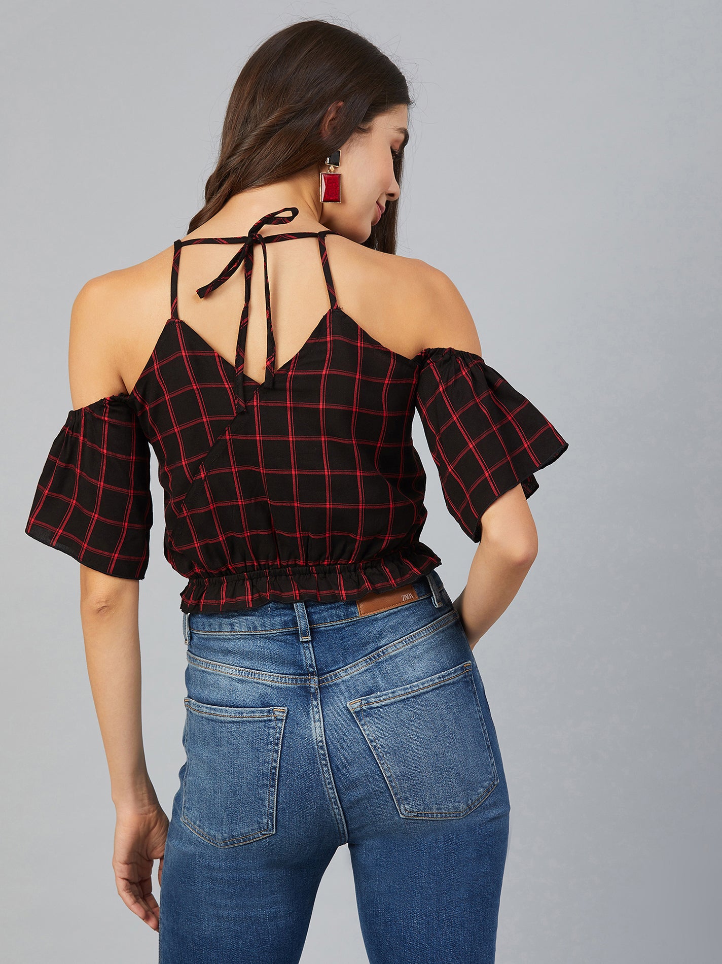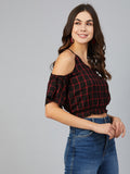 Chimpaaanzee Women Red Checks Cold Shoulder CropTop