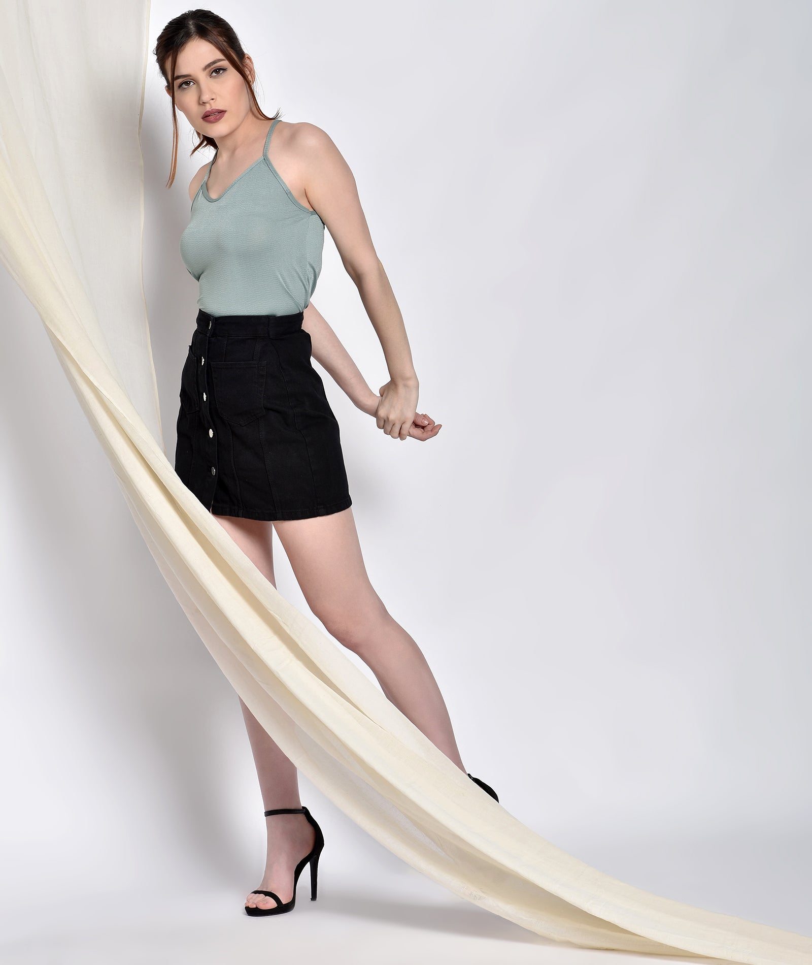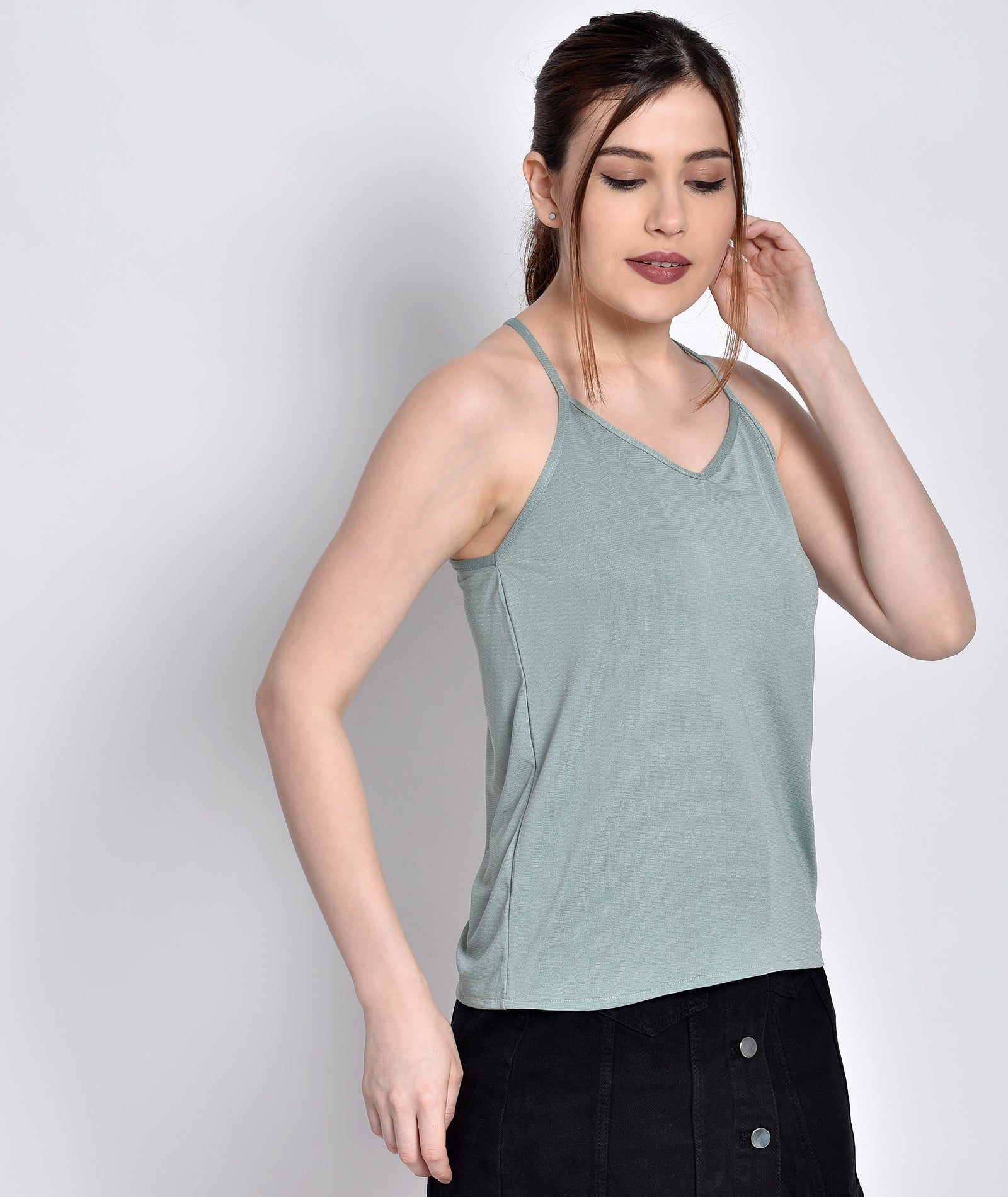 This model has a height of 5 feet 7 inches and is wearing a Top of Size "S"