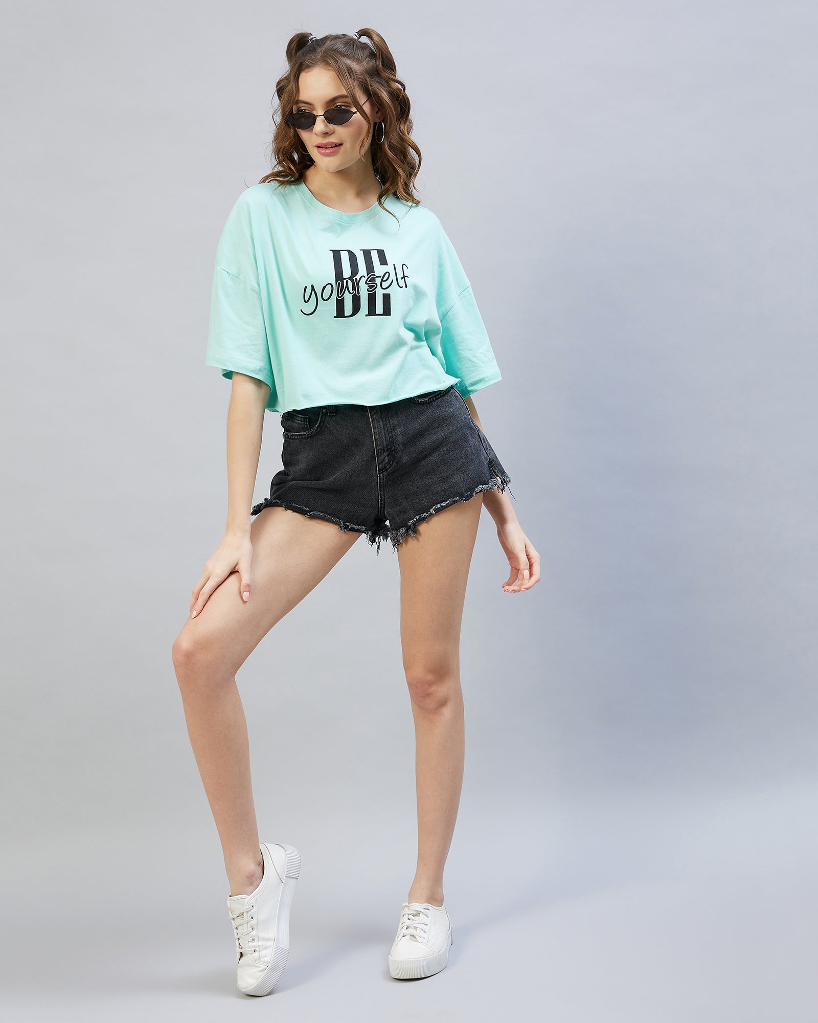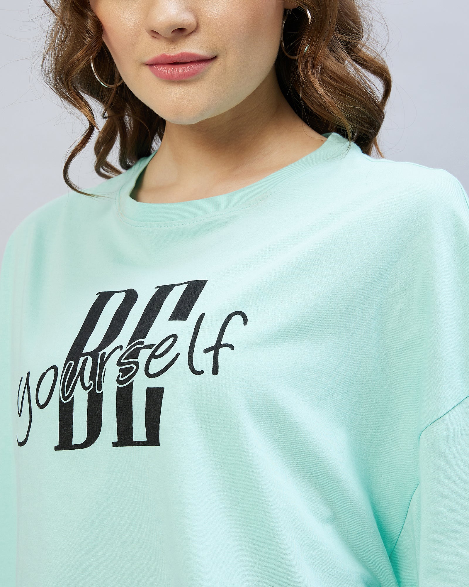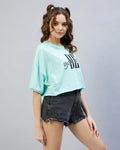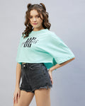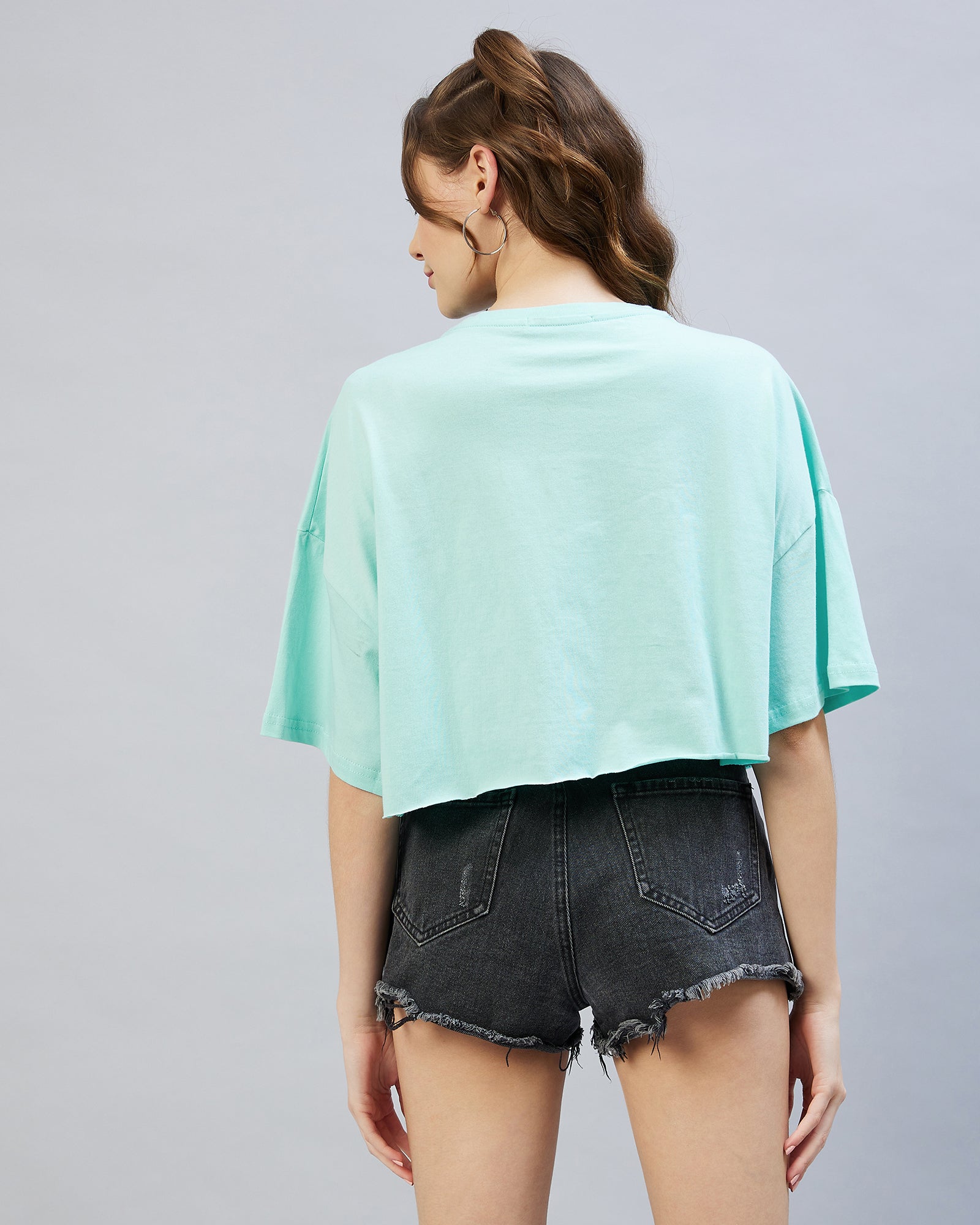Chimpaaanzee Women Sky Blue Typographic Oversized Crop T-shirt