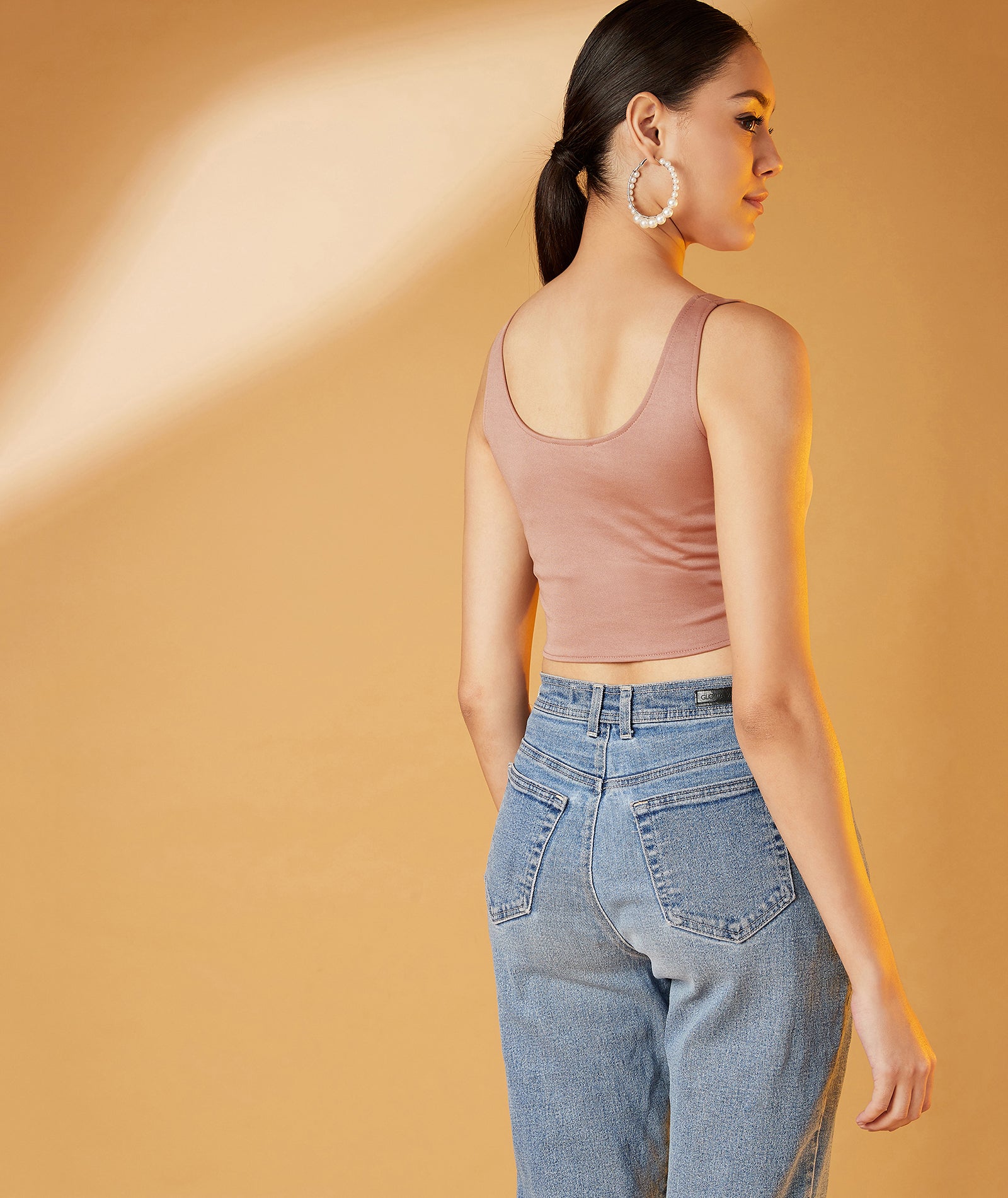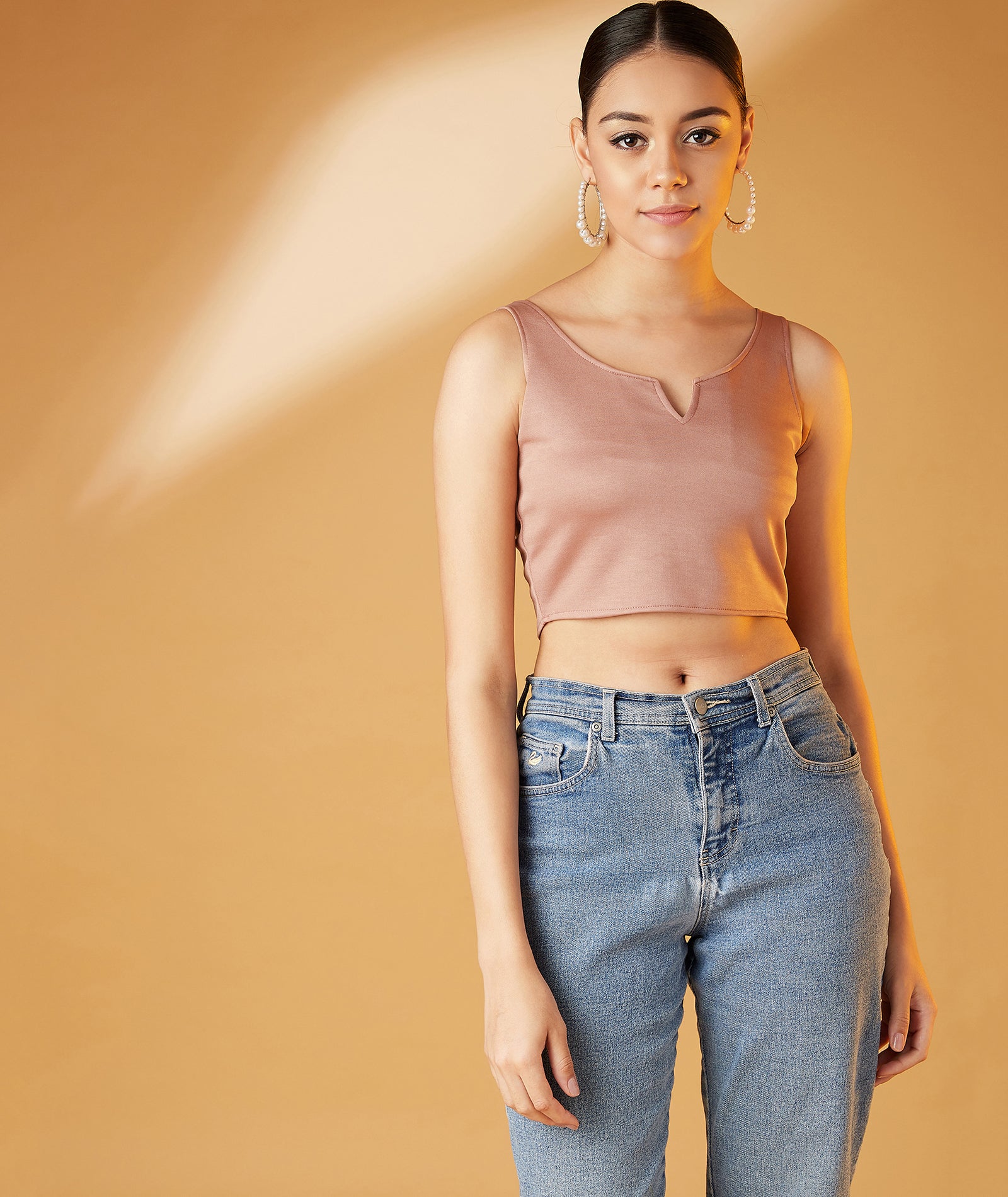 This model has a height of 5 feet 9 inches and is wearing a Top of Size "S"