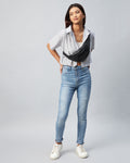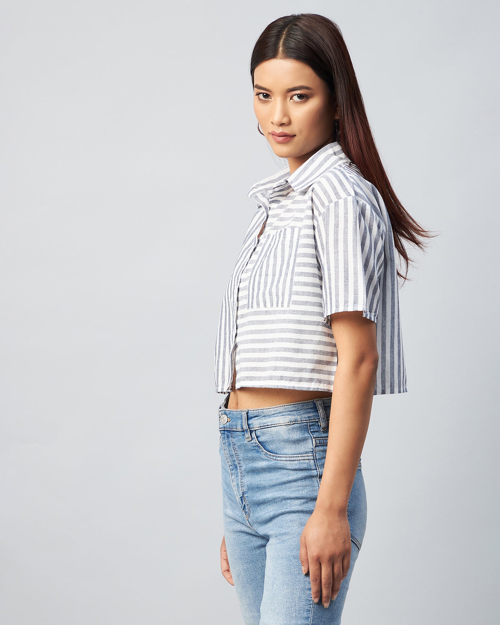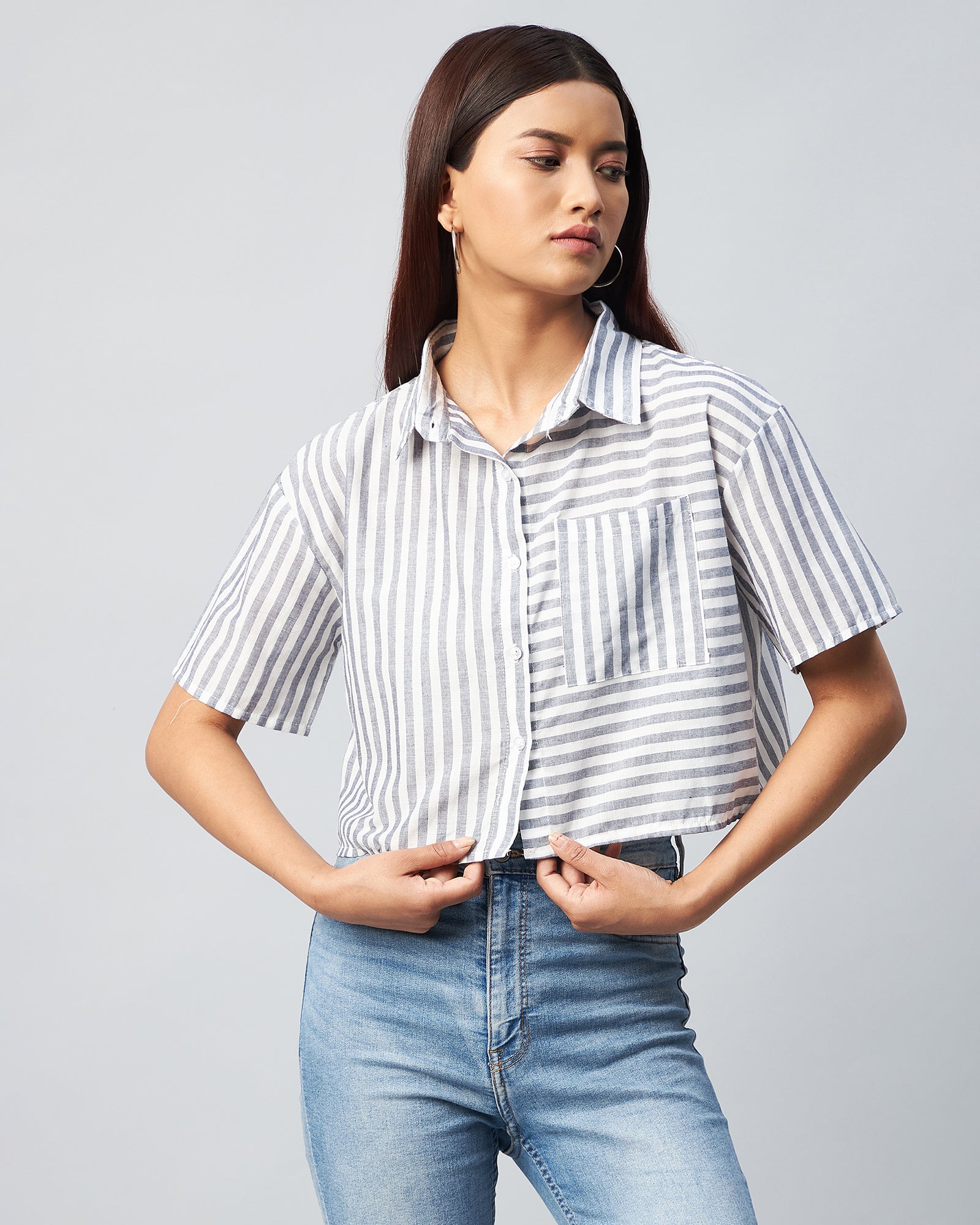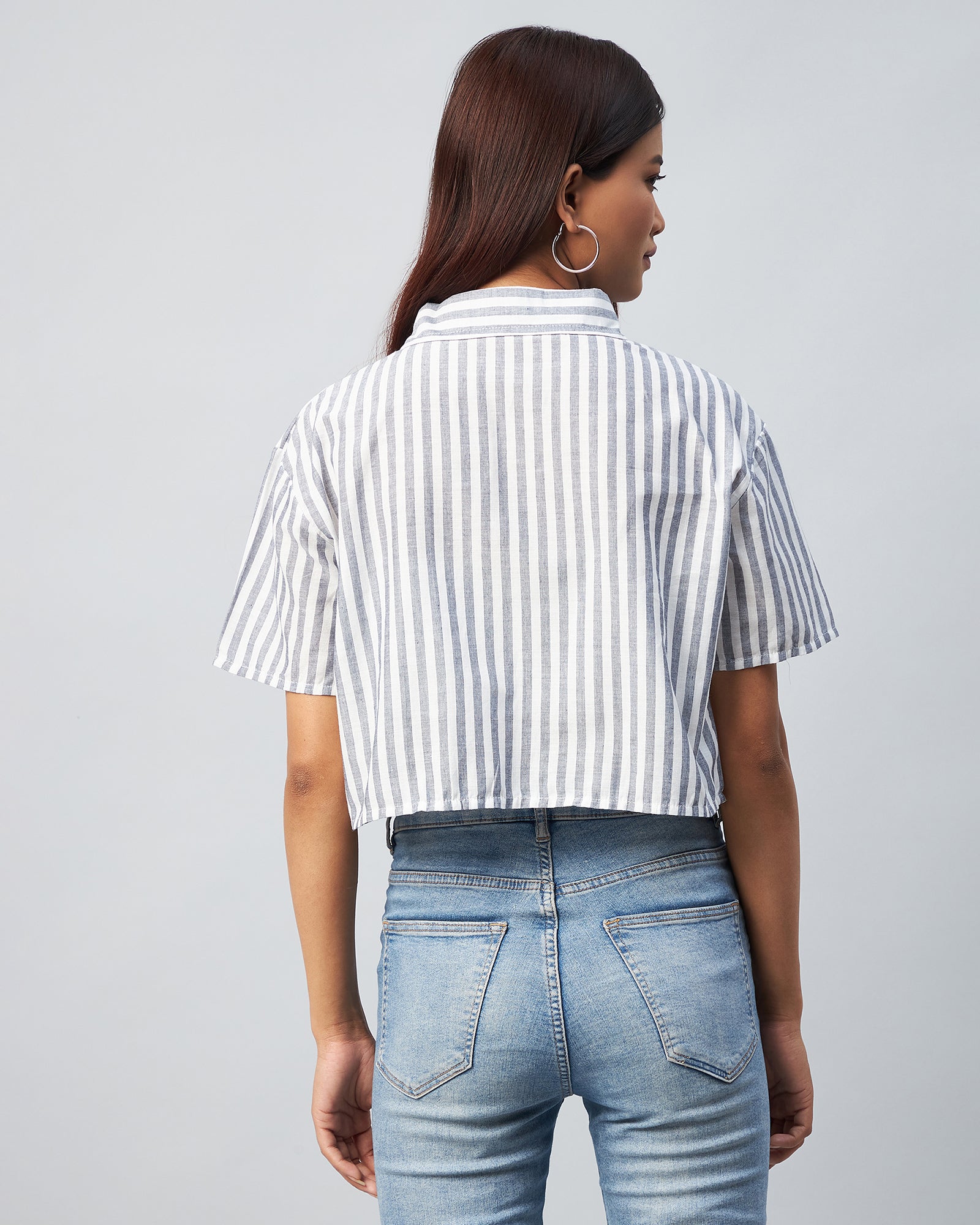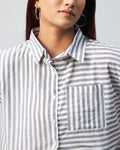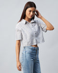 Chimpaaanzee Women Viscose Black and White Striped Half Sleeve Crop Shirt