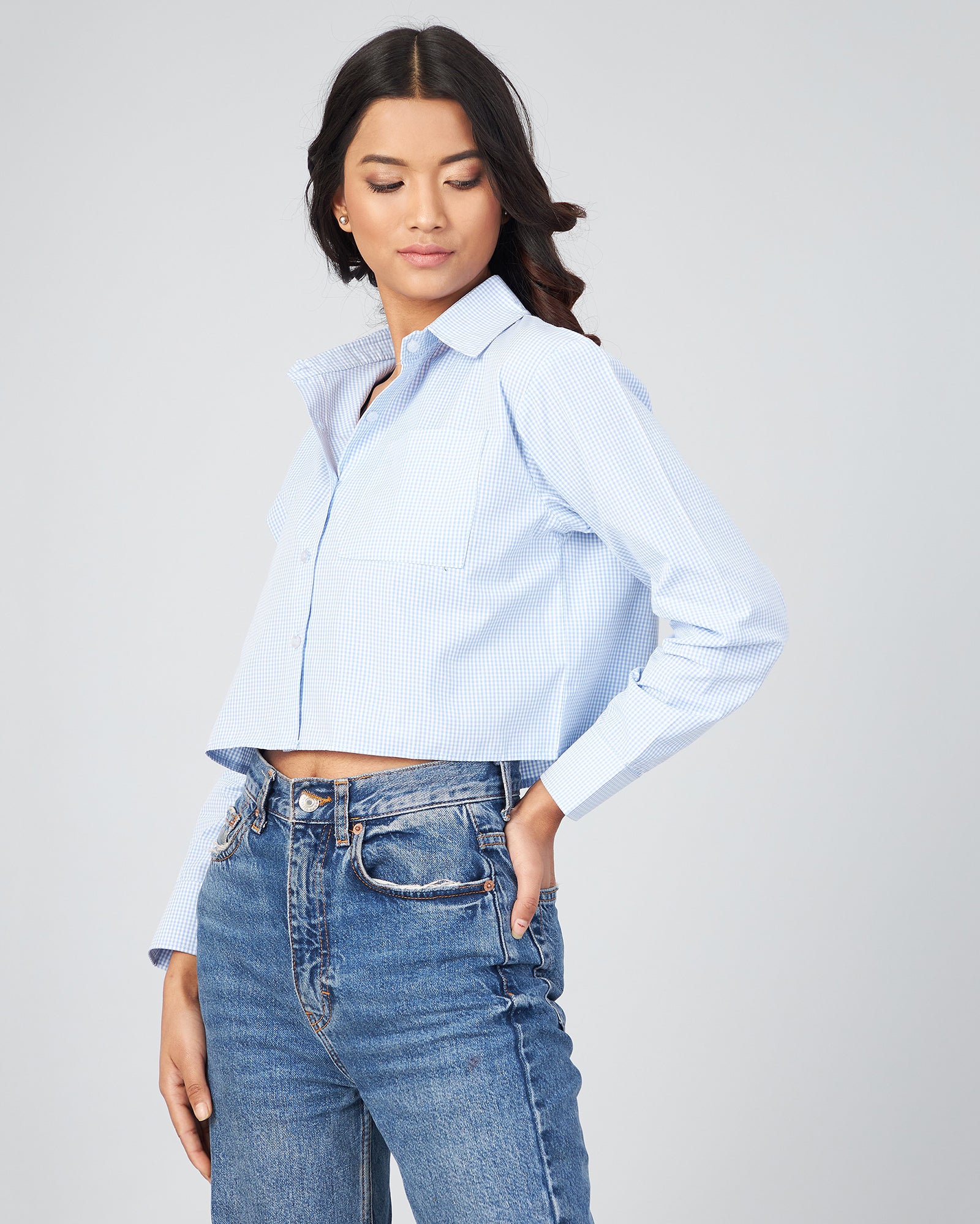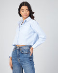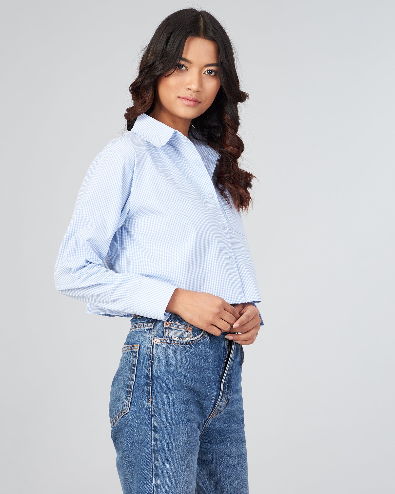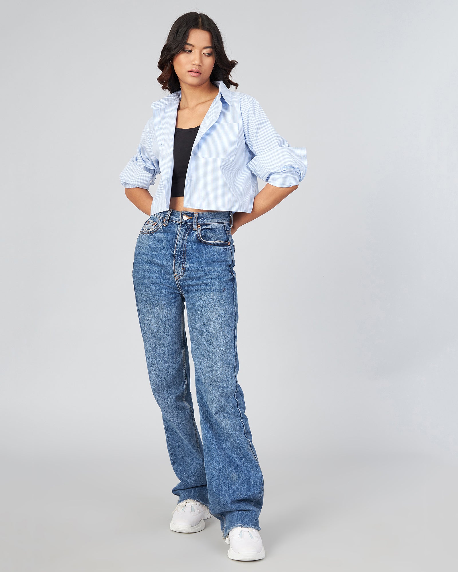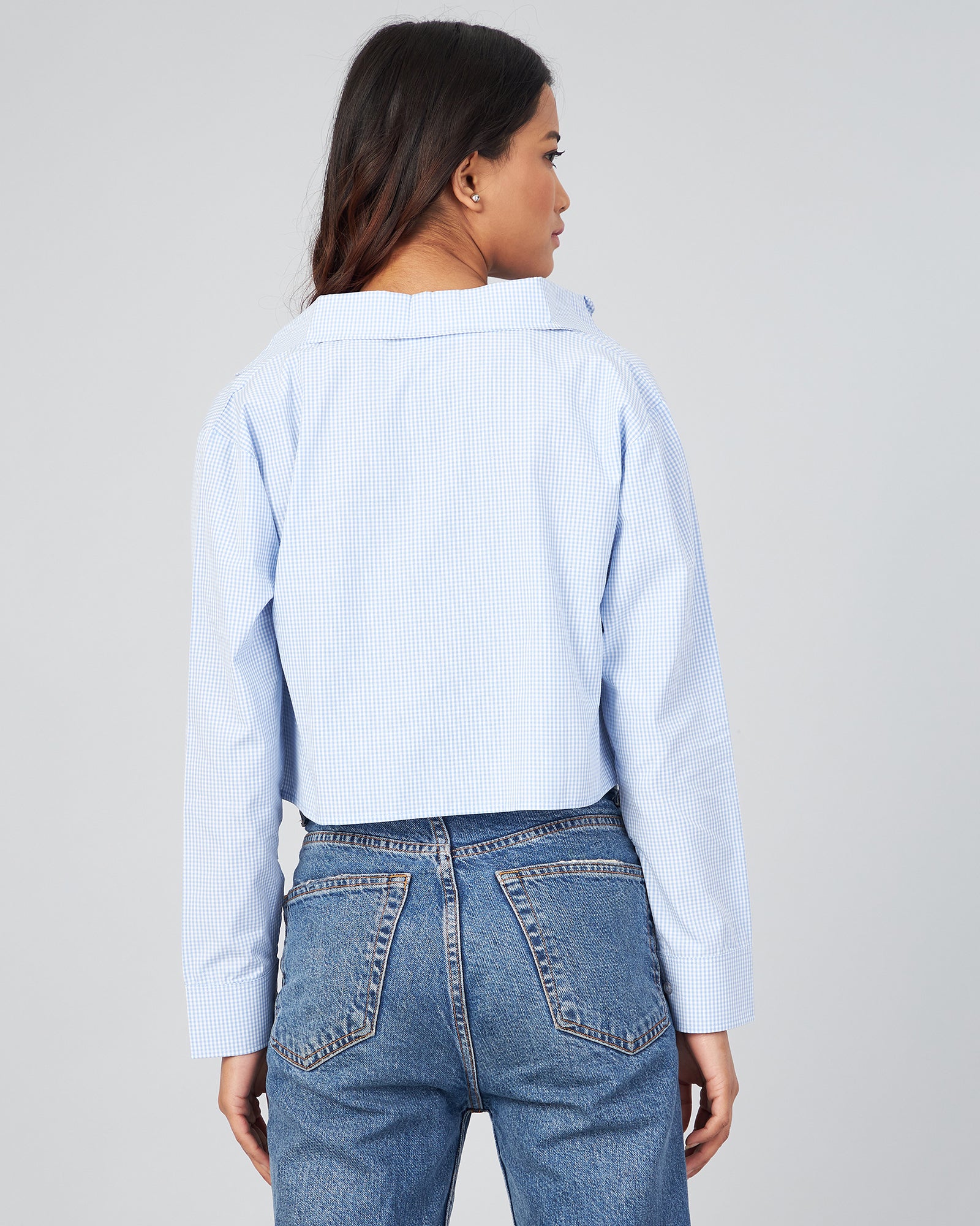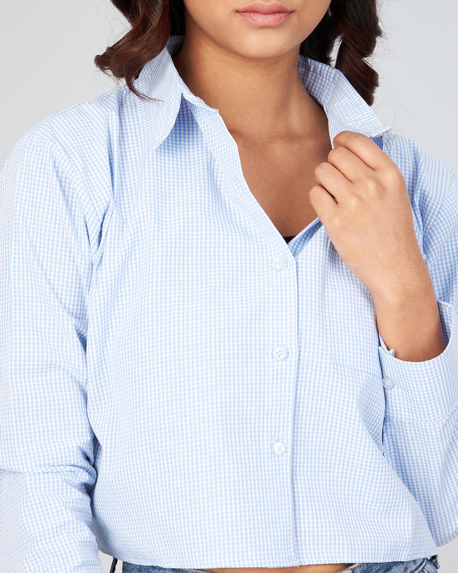 Chimpaaanzee Women Viscose Blue Checkered Full Sleeve Crop Shirt