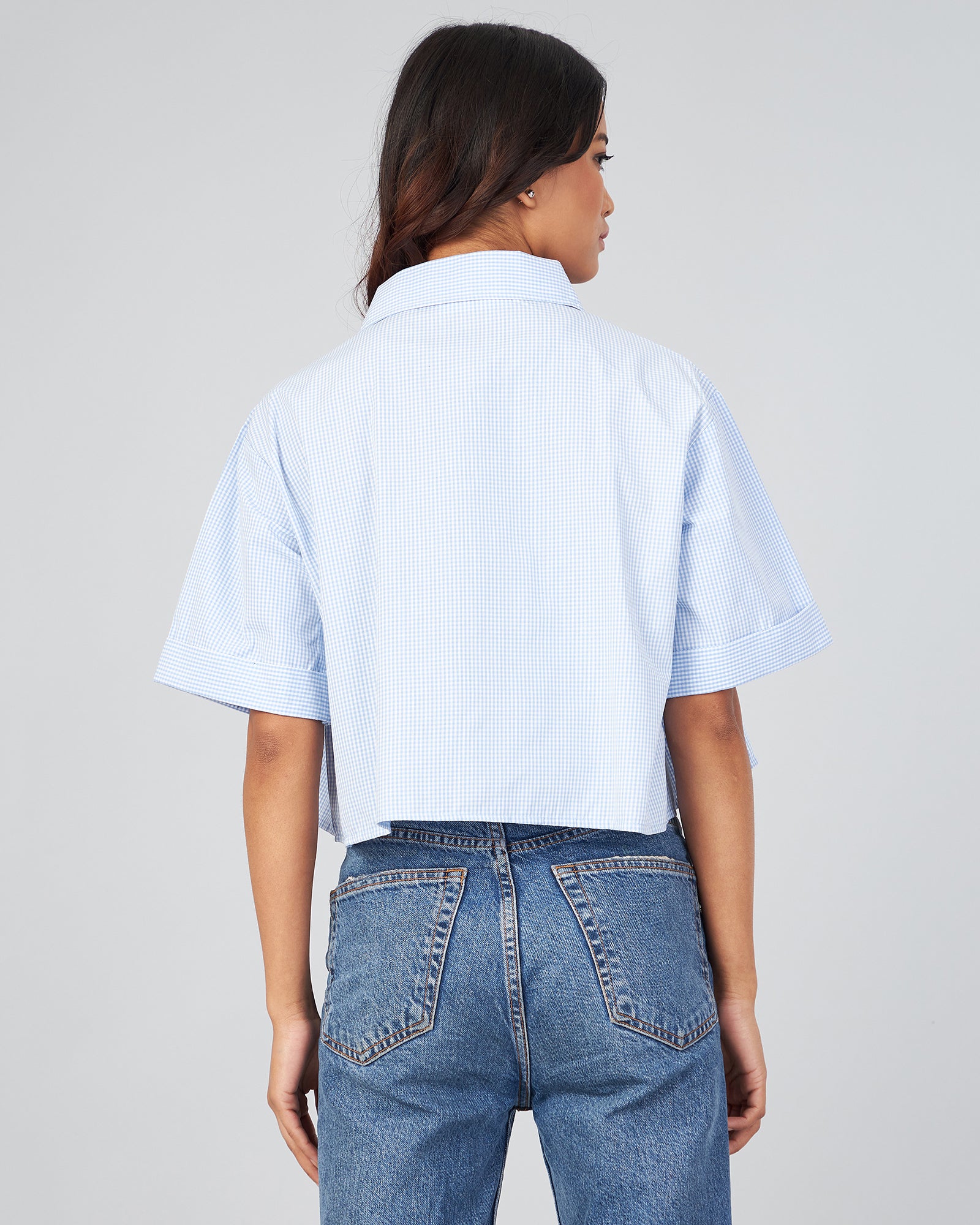 Chimpaaanzee Women Viscose Blue Checkered Loose Fit Crop Shirt