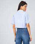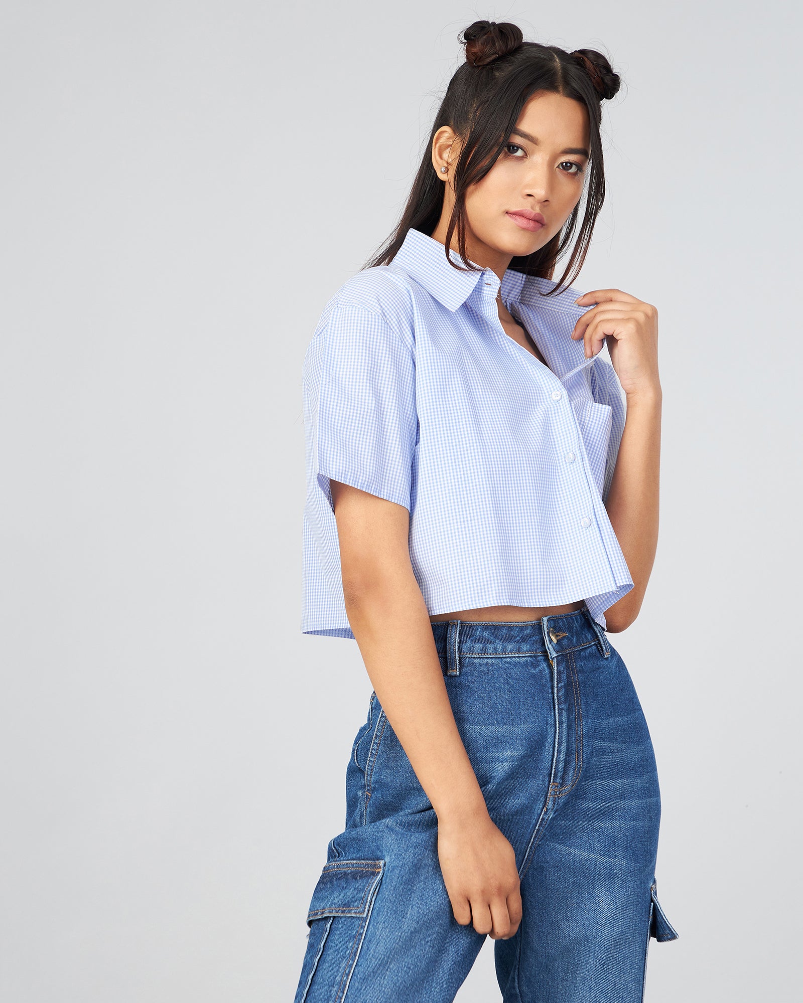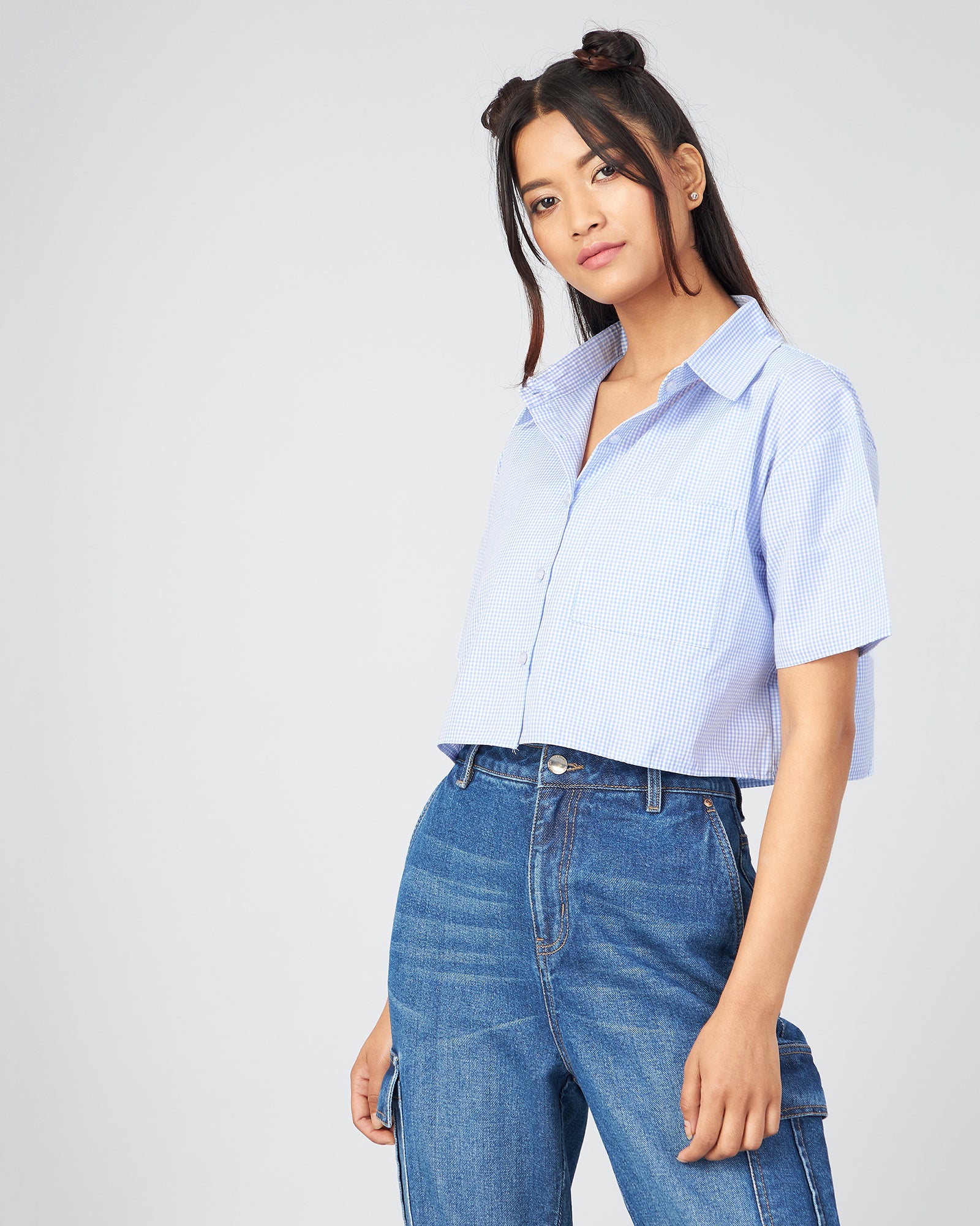 Chimpaaanzee Women Viscose Blue Checkered Short Sleeve Crop Shirt