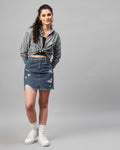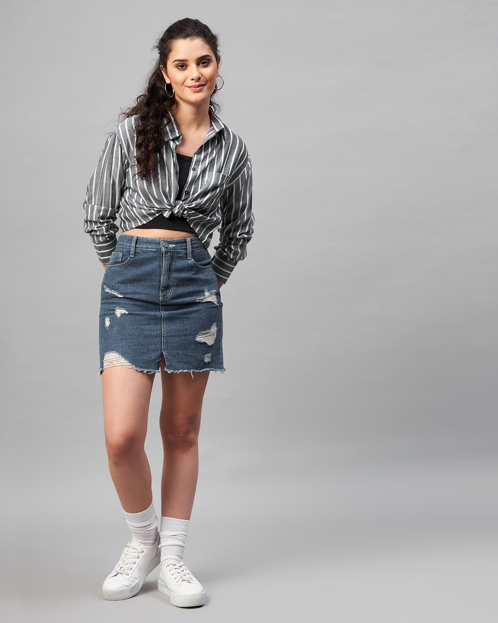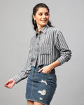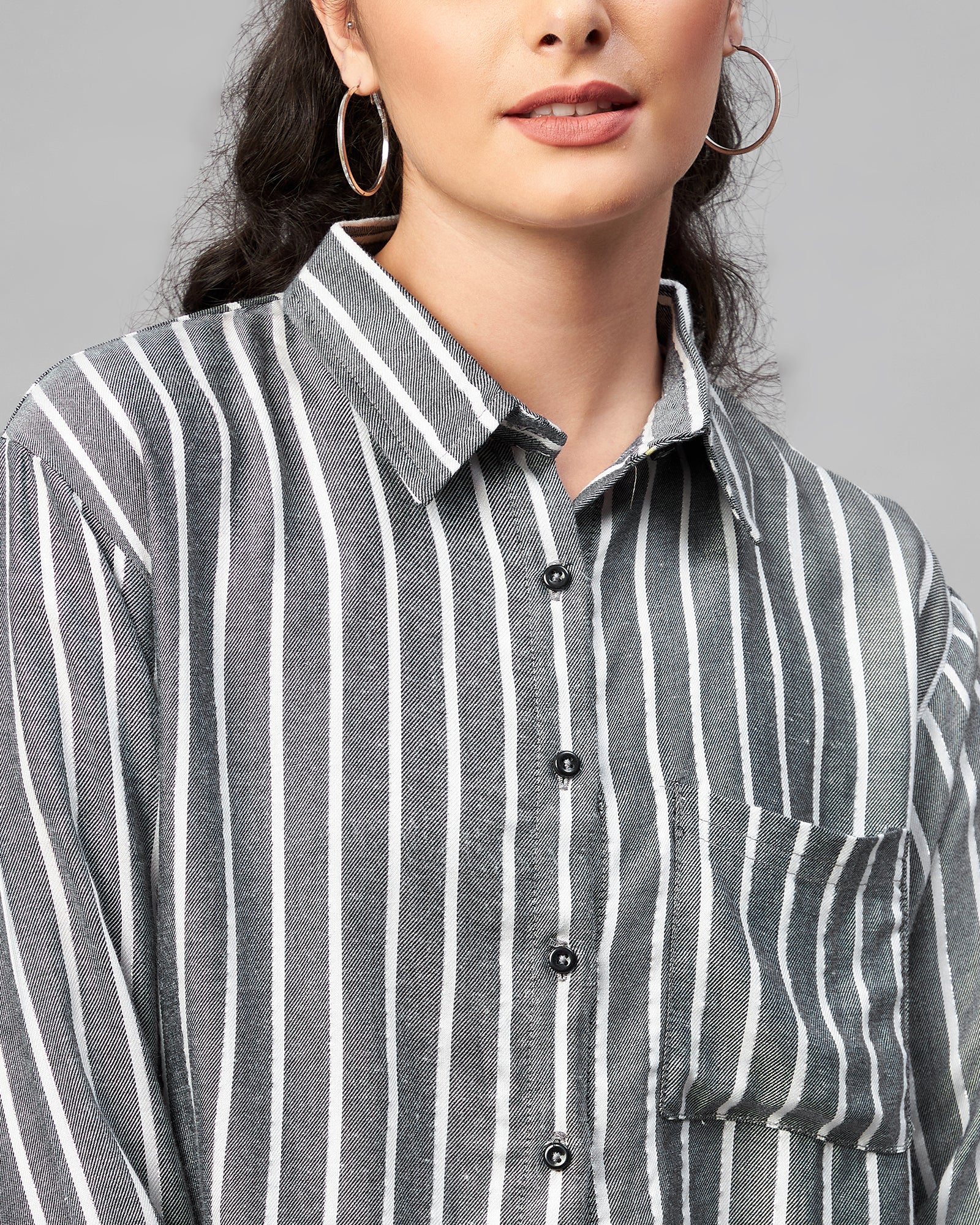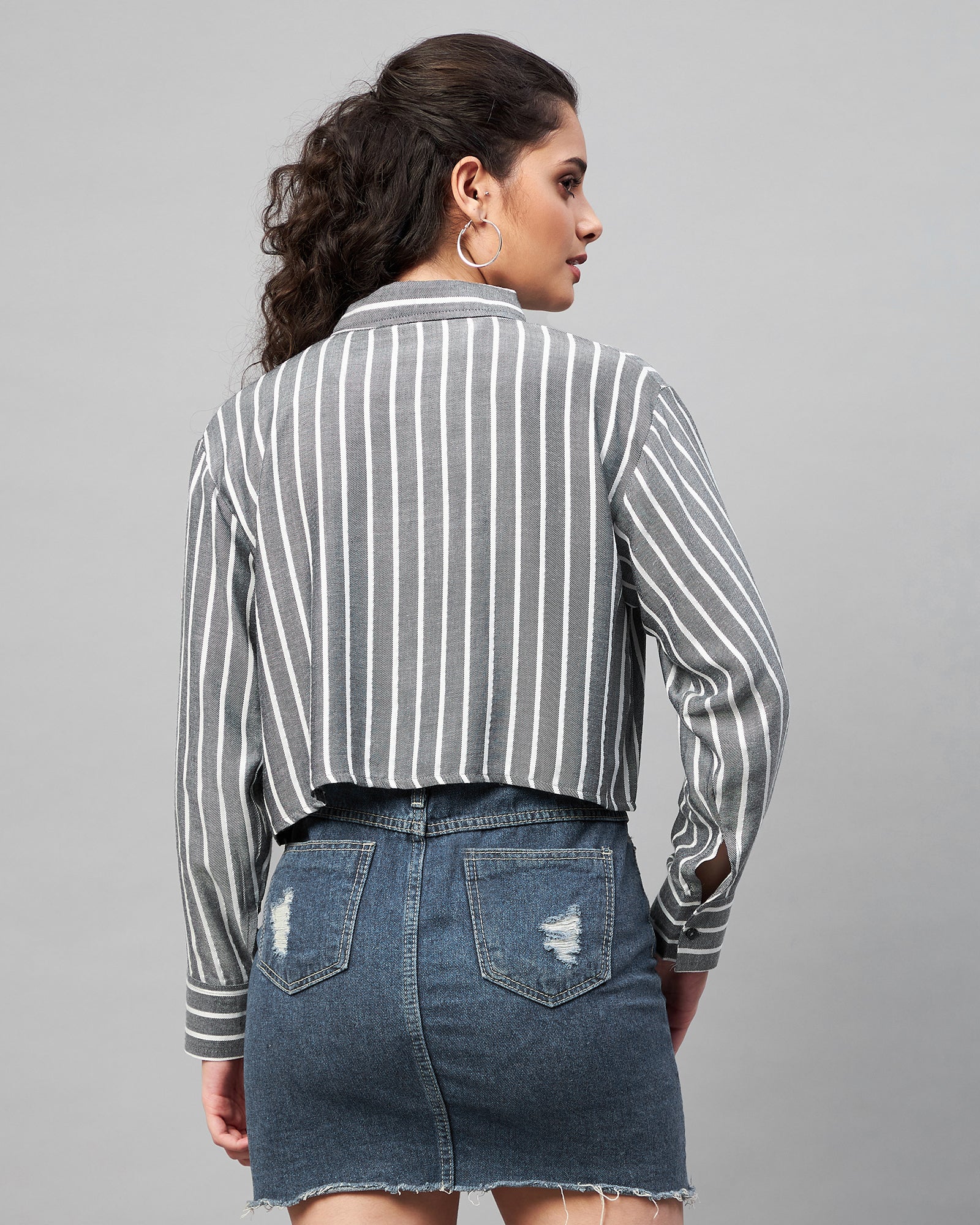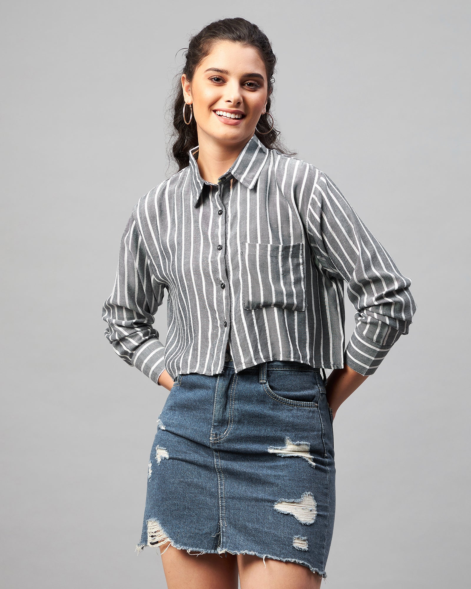Chimpaaanzee Women Viscose Dark Grey Striped Full Sleeve Crop Shirt