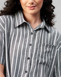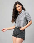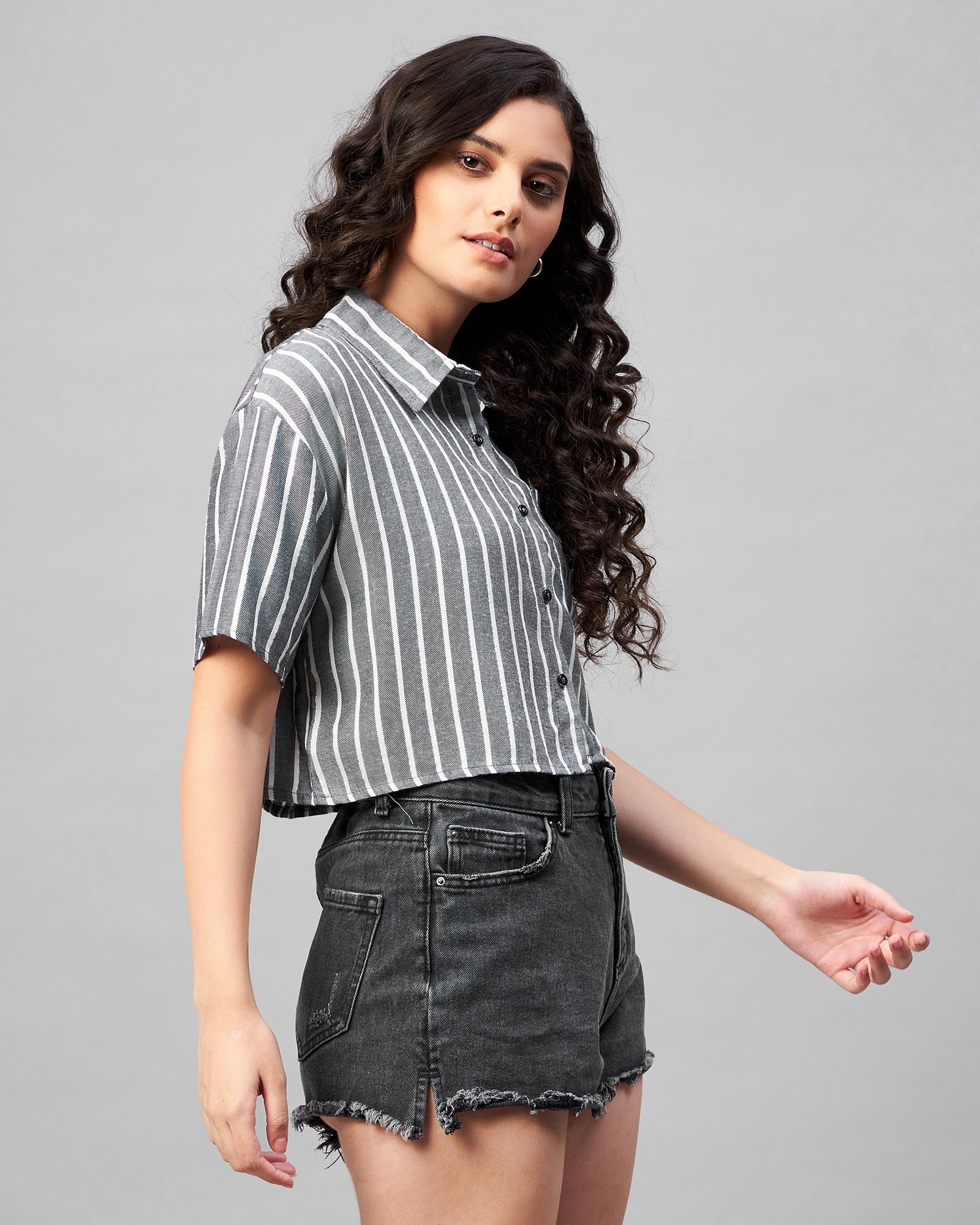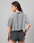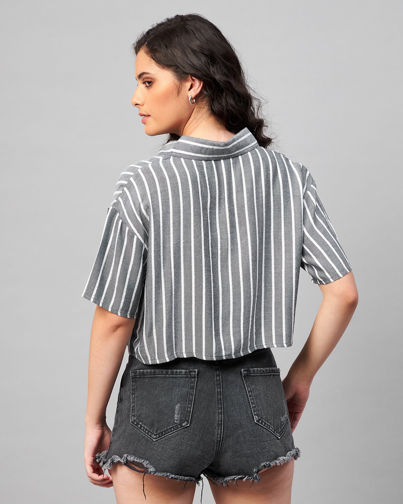Chimpaaanzee Women Viscose Dark Grey Striped Half Sleeve Crop Shirt