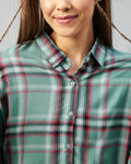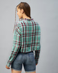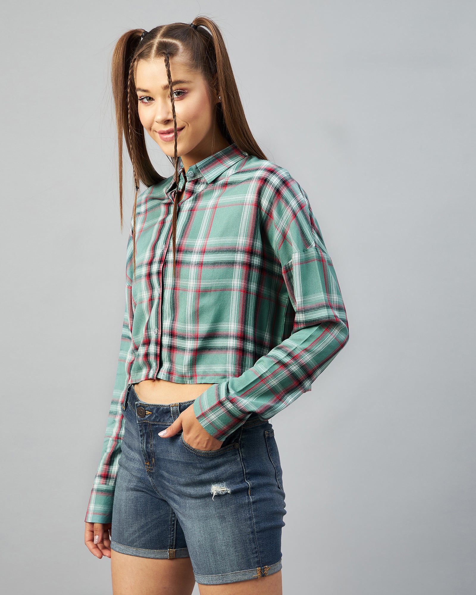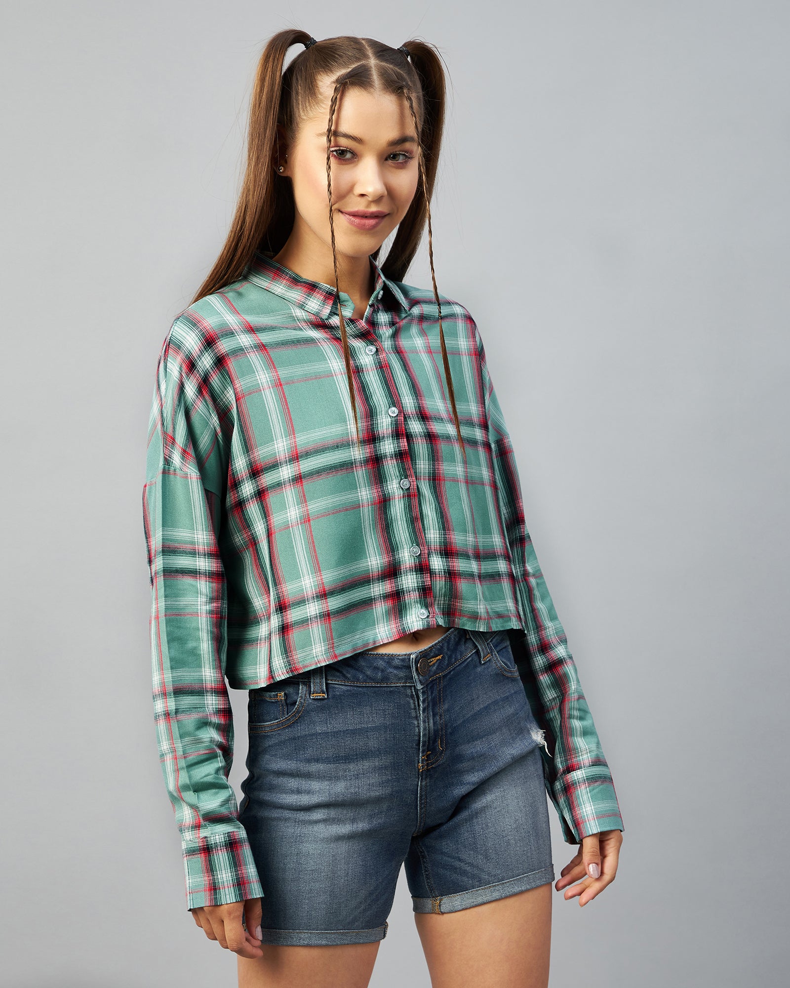 Chimpaaanzee Women Viscose Green & Red Checkered Full Sleeve Drop Shoulder Crop Shirt