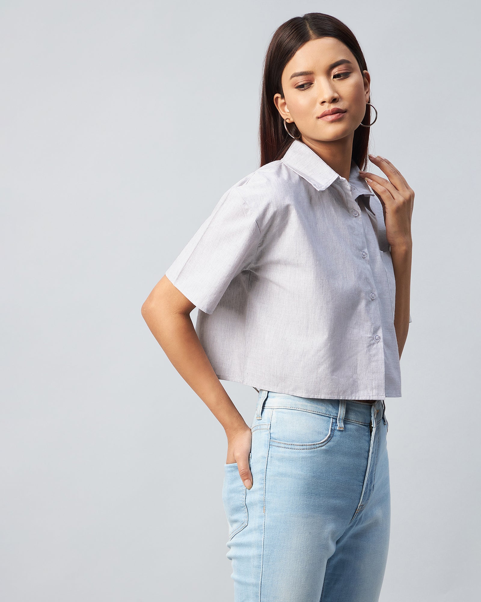 Chimpaaanzee Women Viscose Grey Solid Half Sleeve Crop Shirt