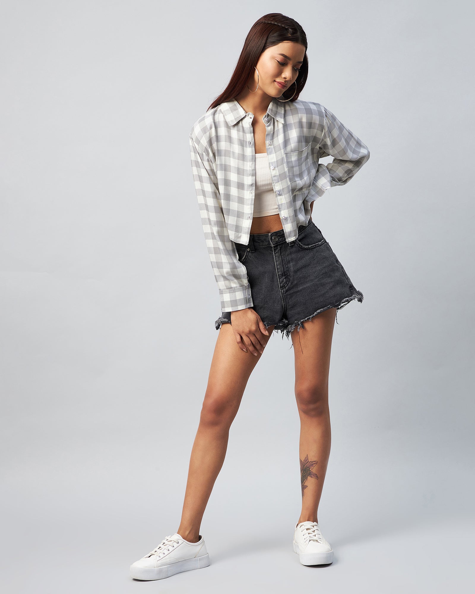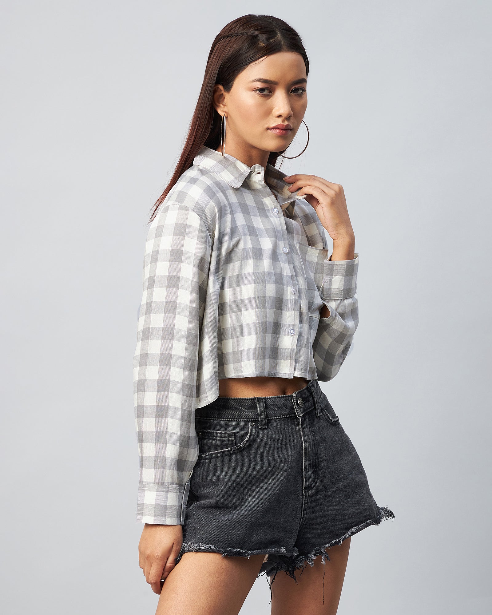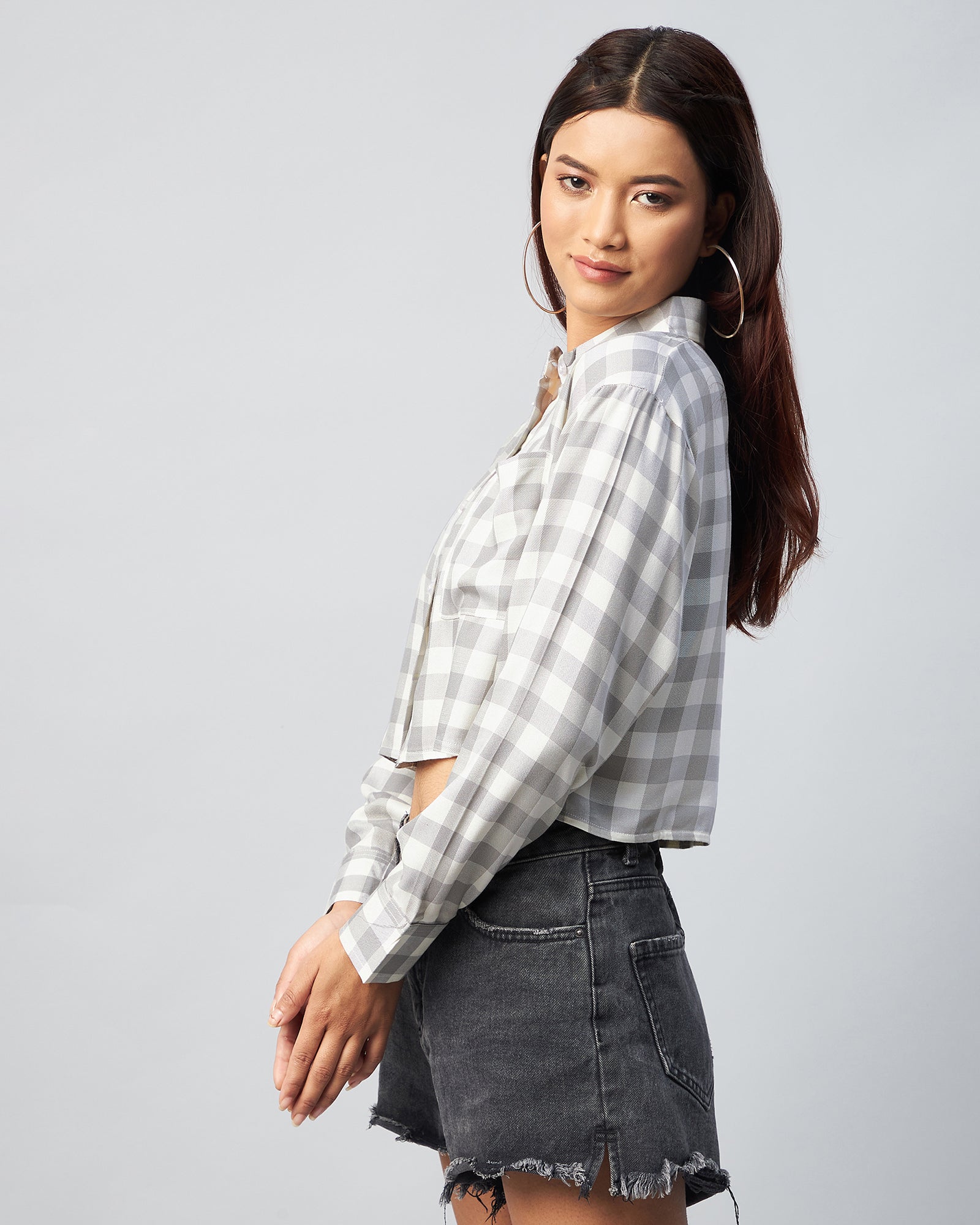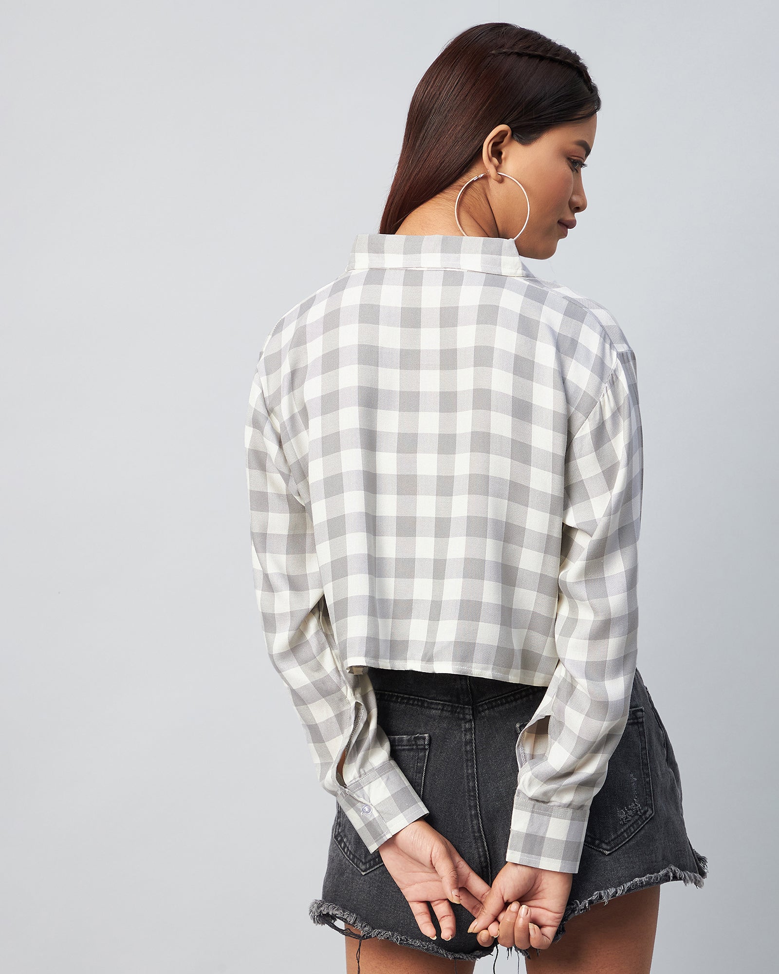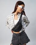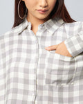 Chimpaaanzee Women Viscose Grey & White Checks Full Sleeve Crop Shirt