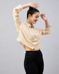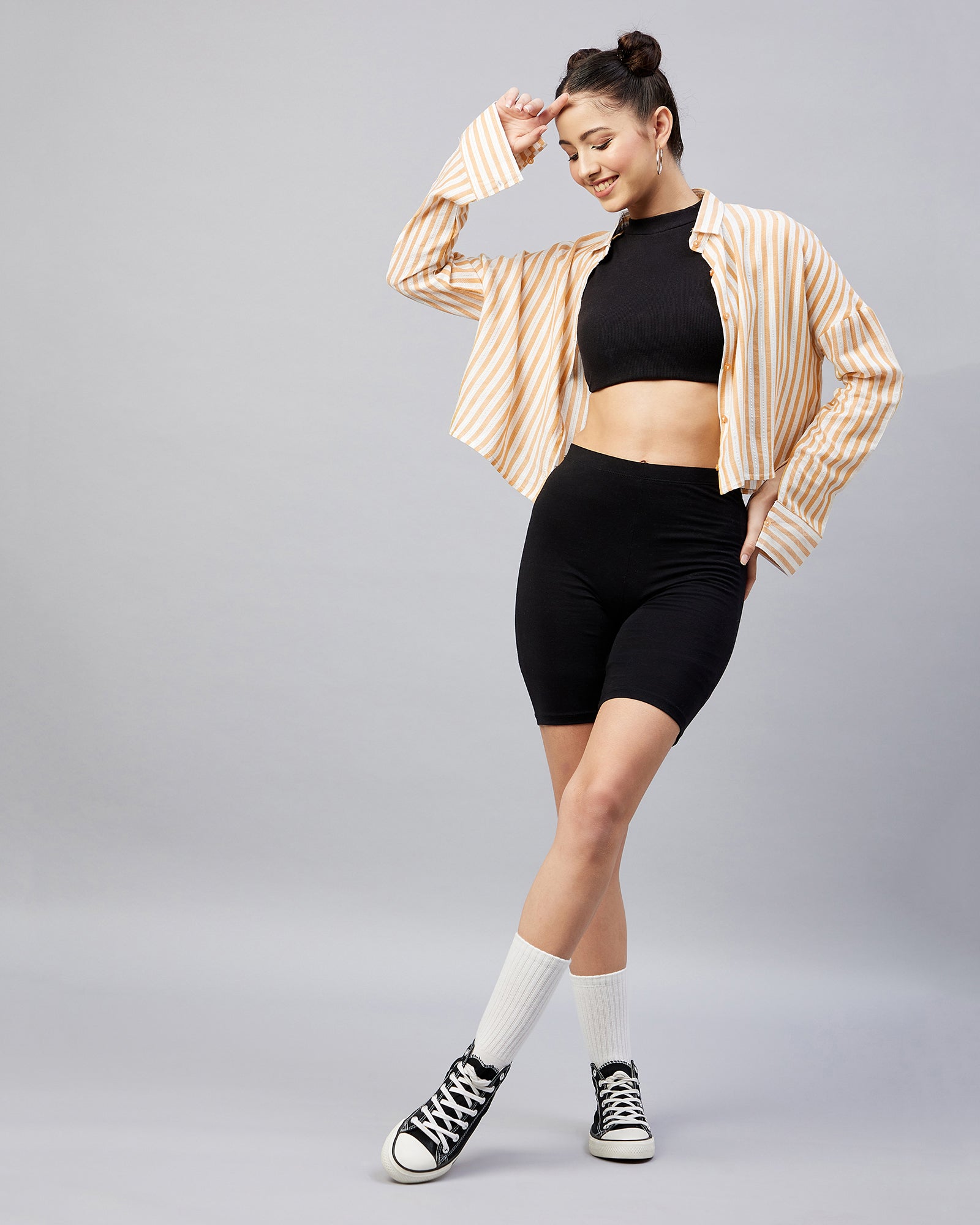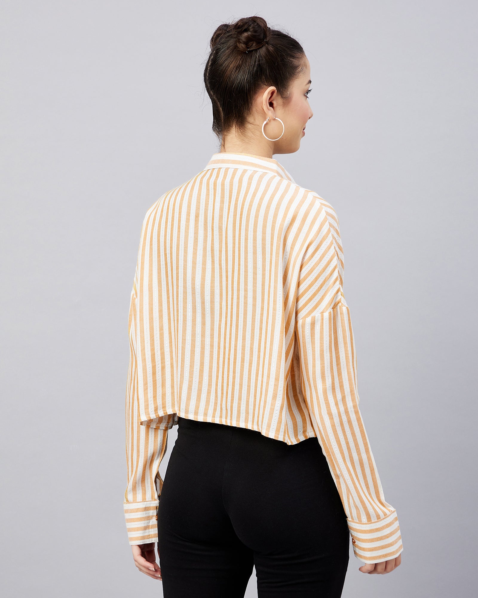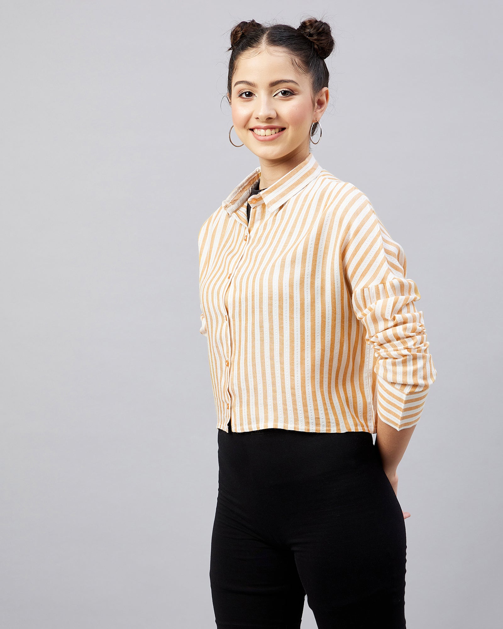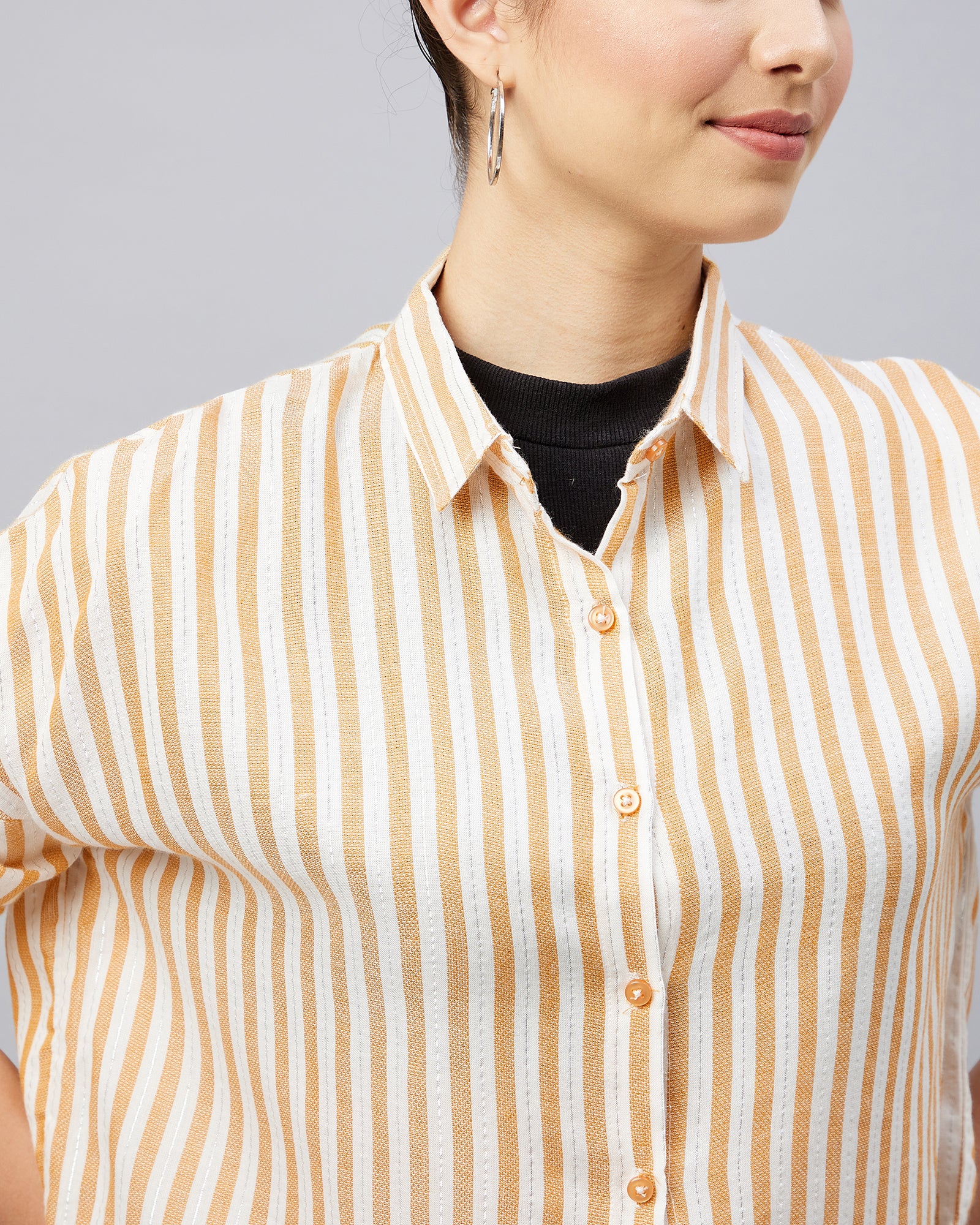 Chimpaaanzee Women Viscose Mustard & White Striped Drop Shoulder Crop Shirt