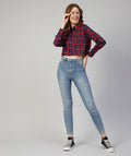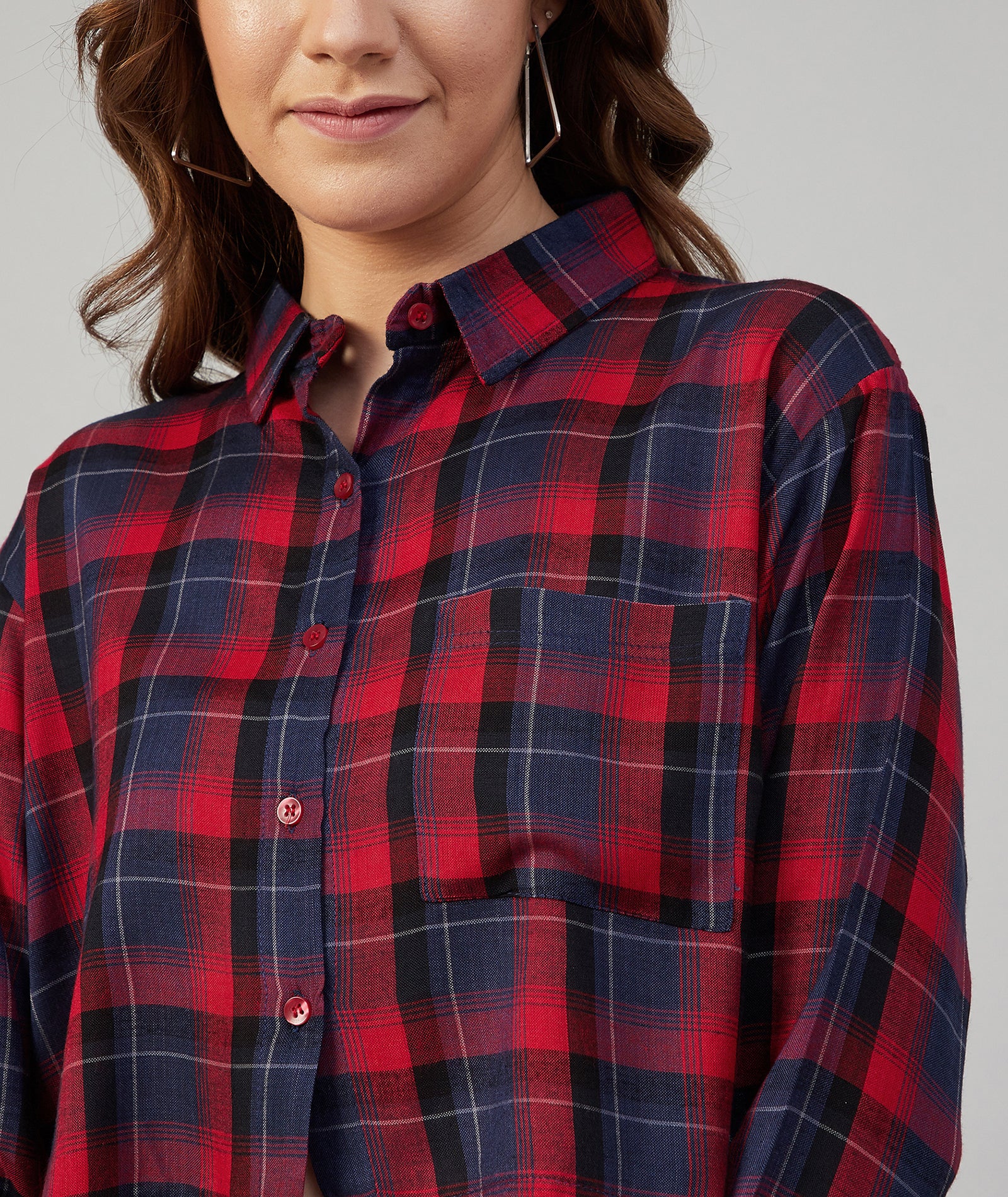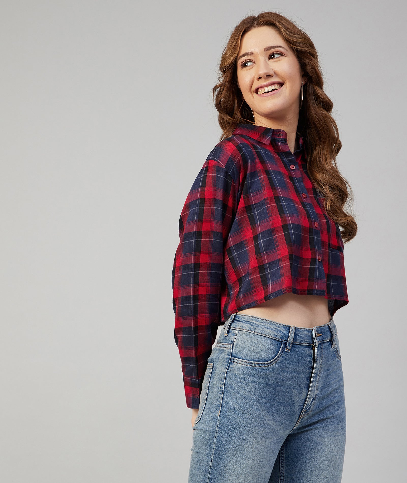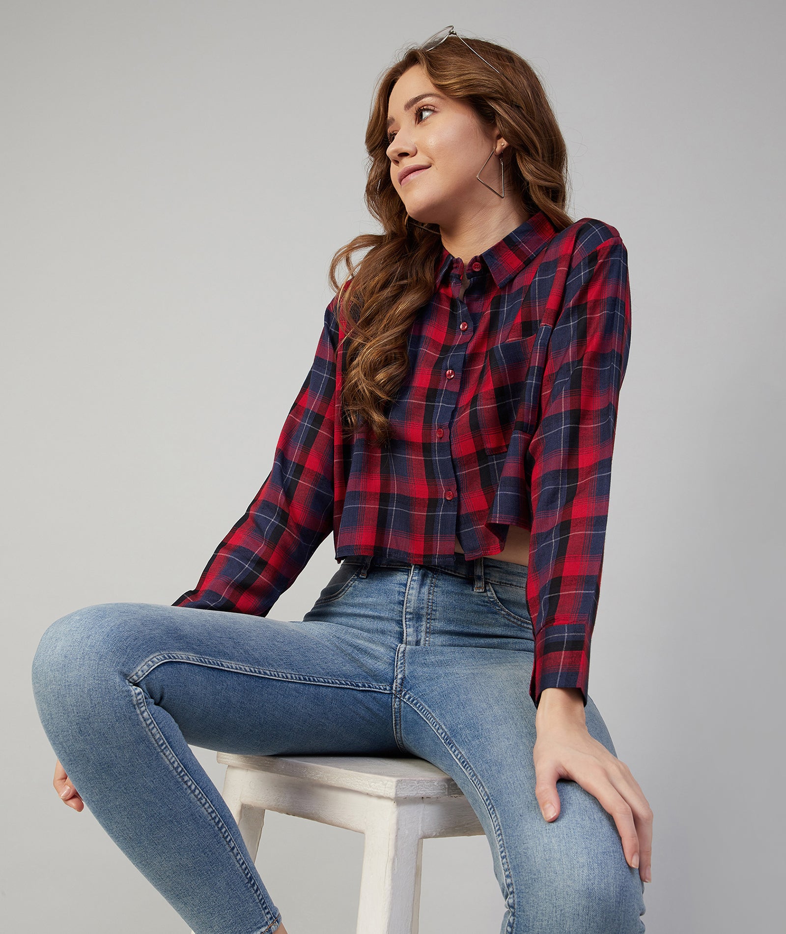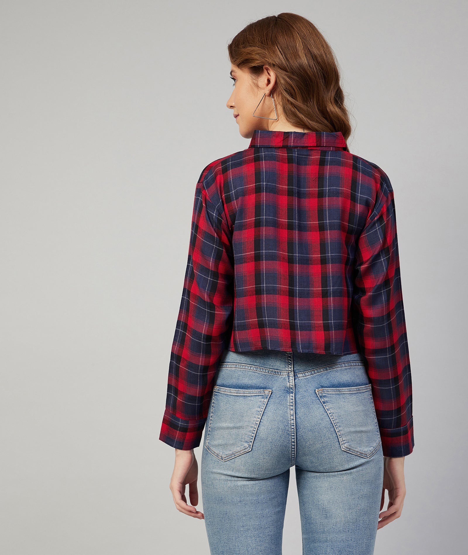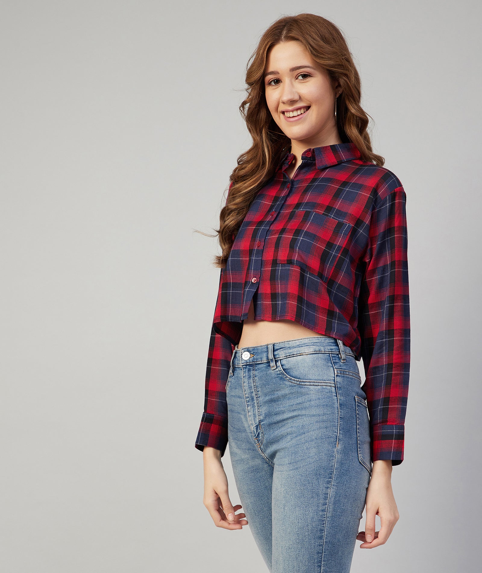 Chimpaaanzee Women Viscose Navy and Red Checkered Full sleeve Crop Shirt