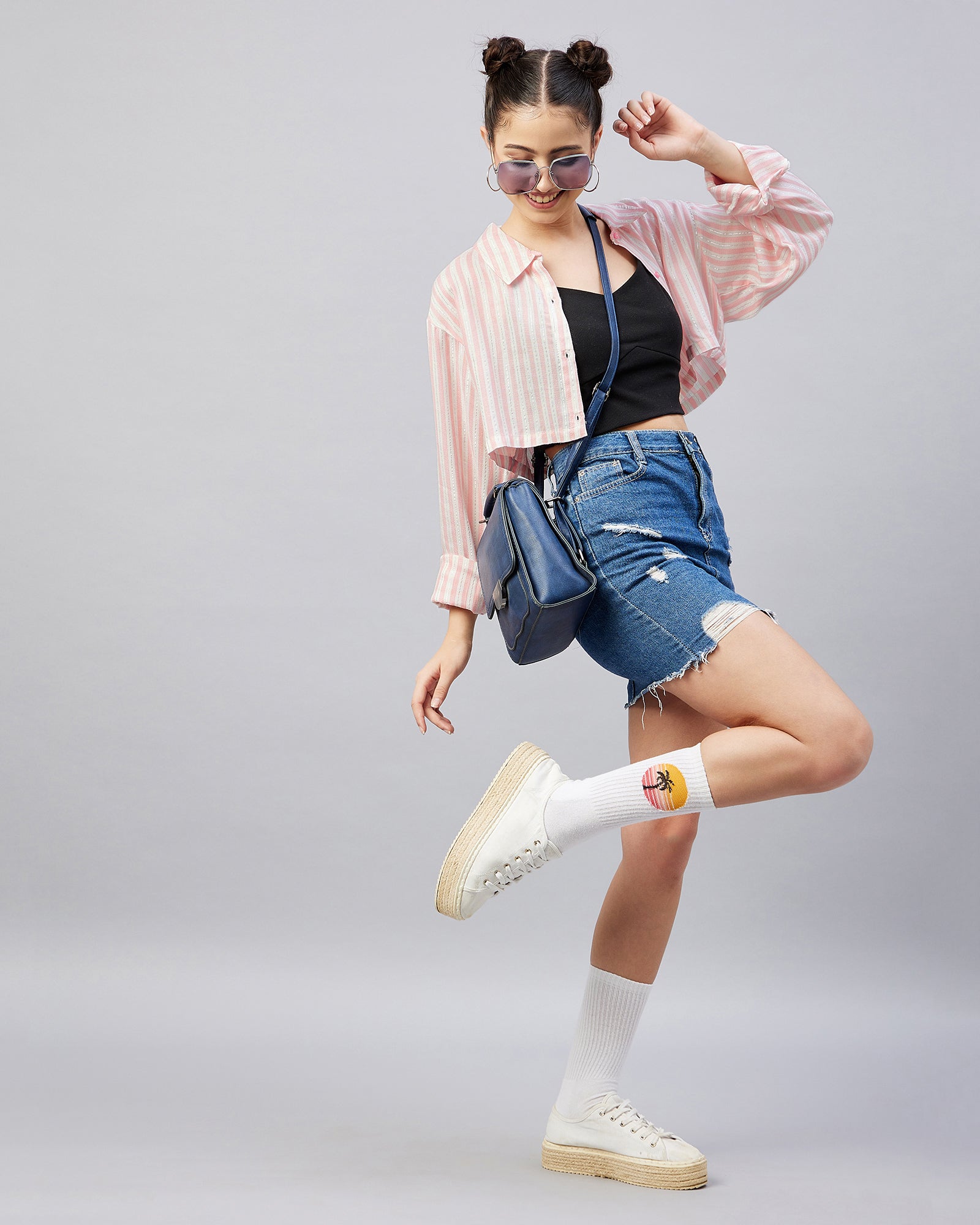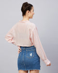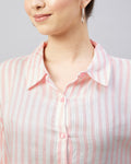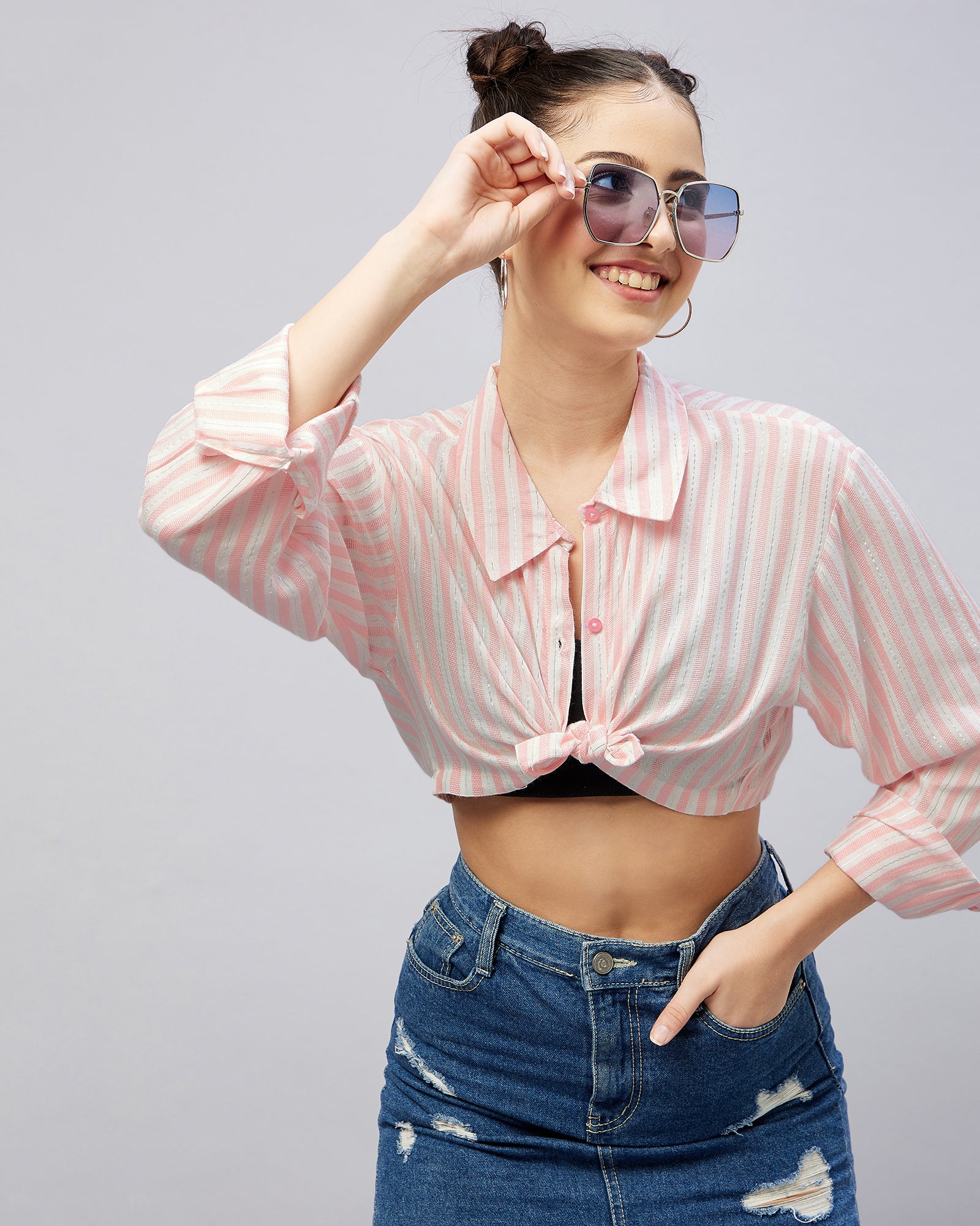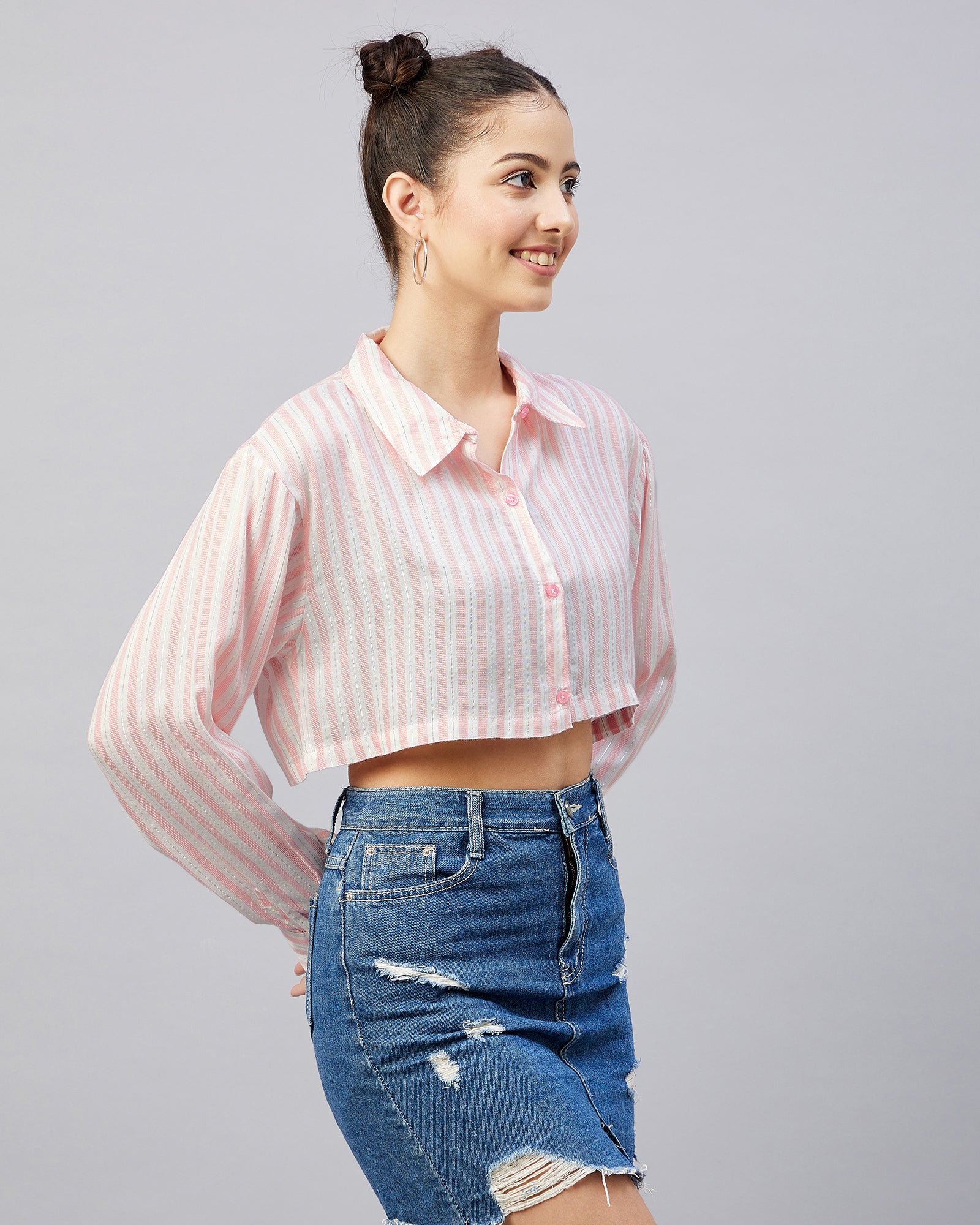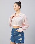 Chimpaaanzee Women Viscose Pink & White Striped Fully Crop Shirt