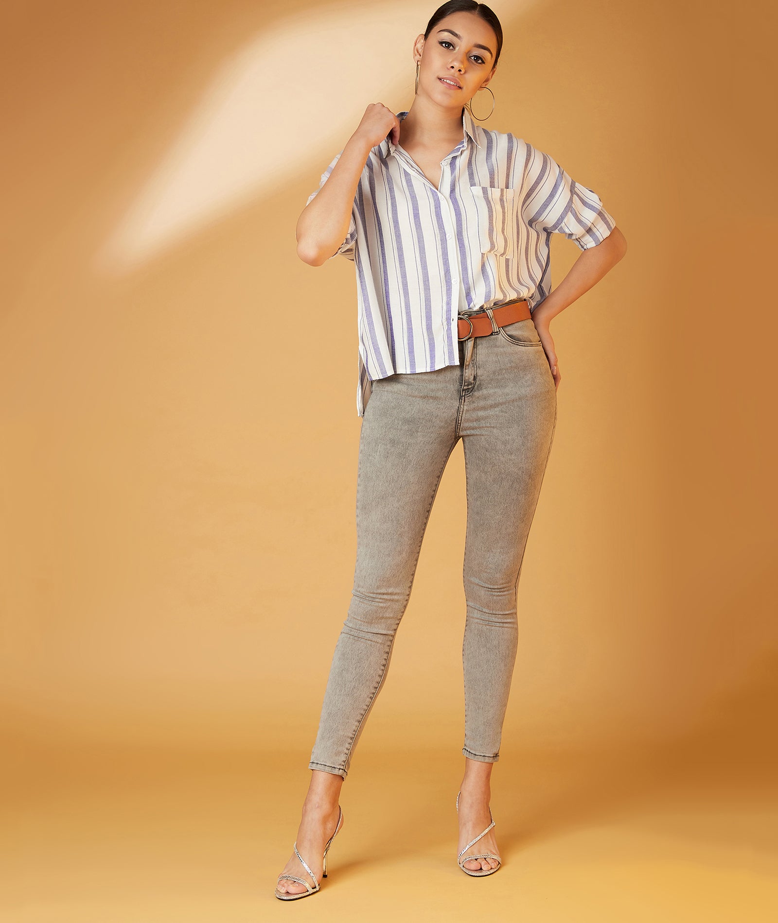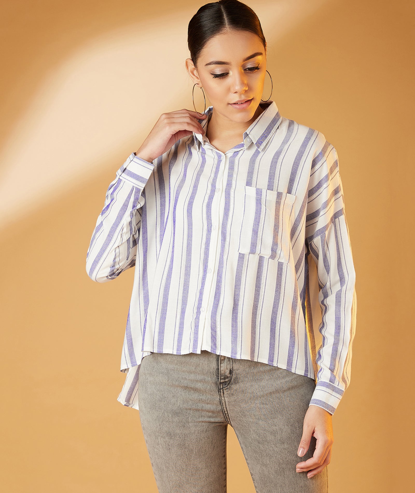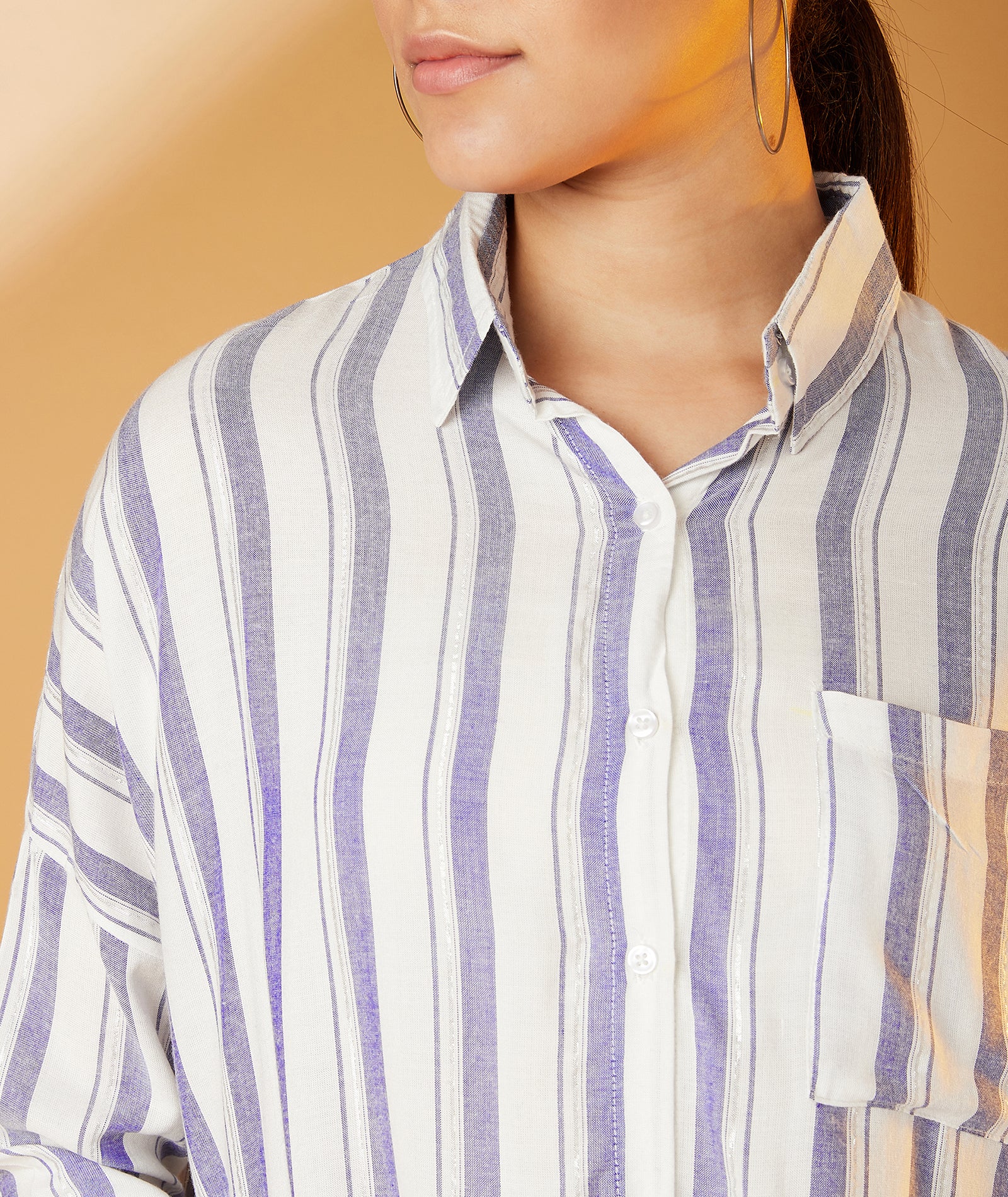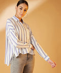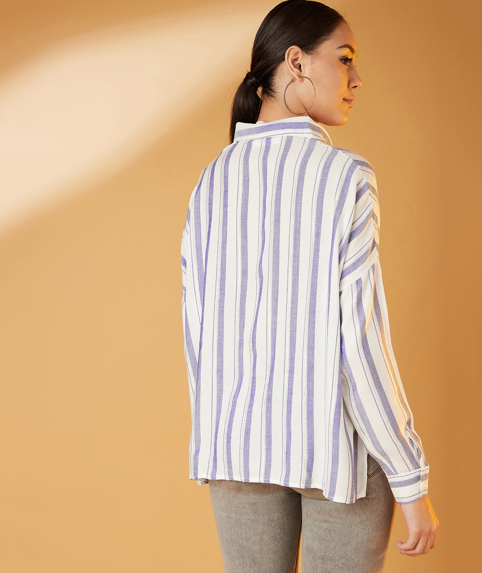 Chimpaaanzee Women Viscose Striped Loose Fit White & Blue Shirt