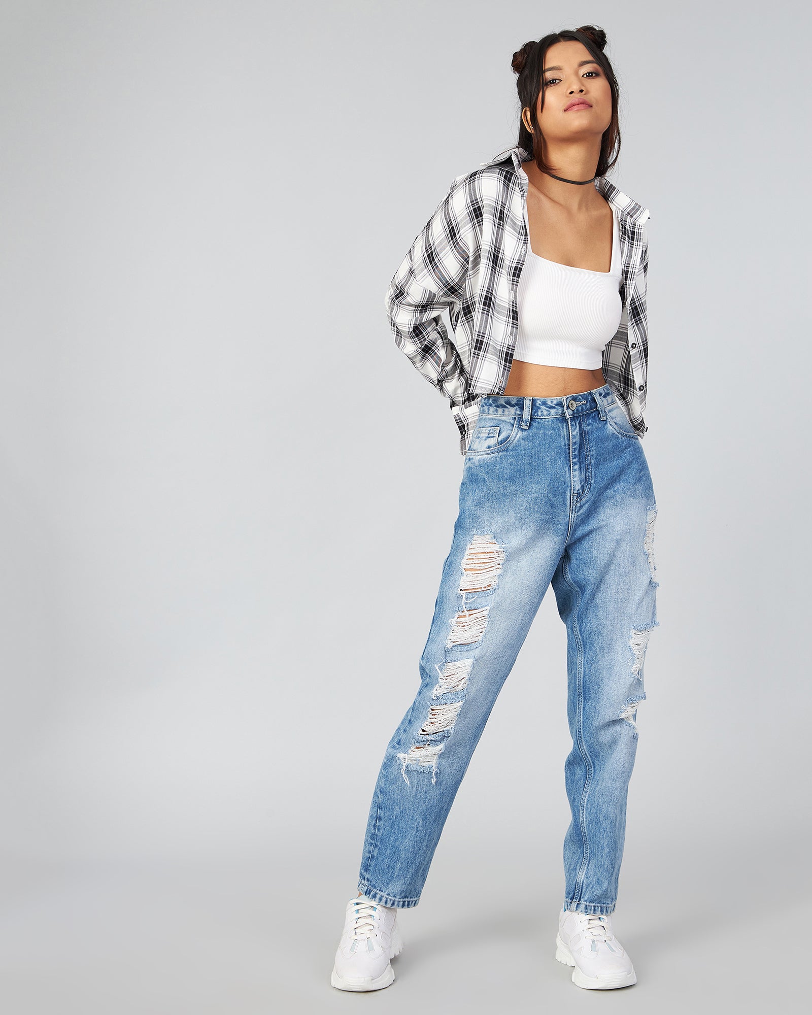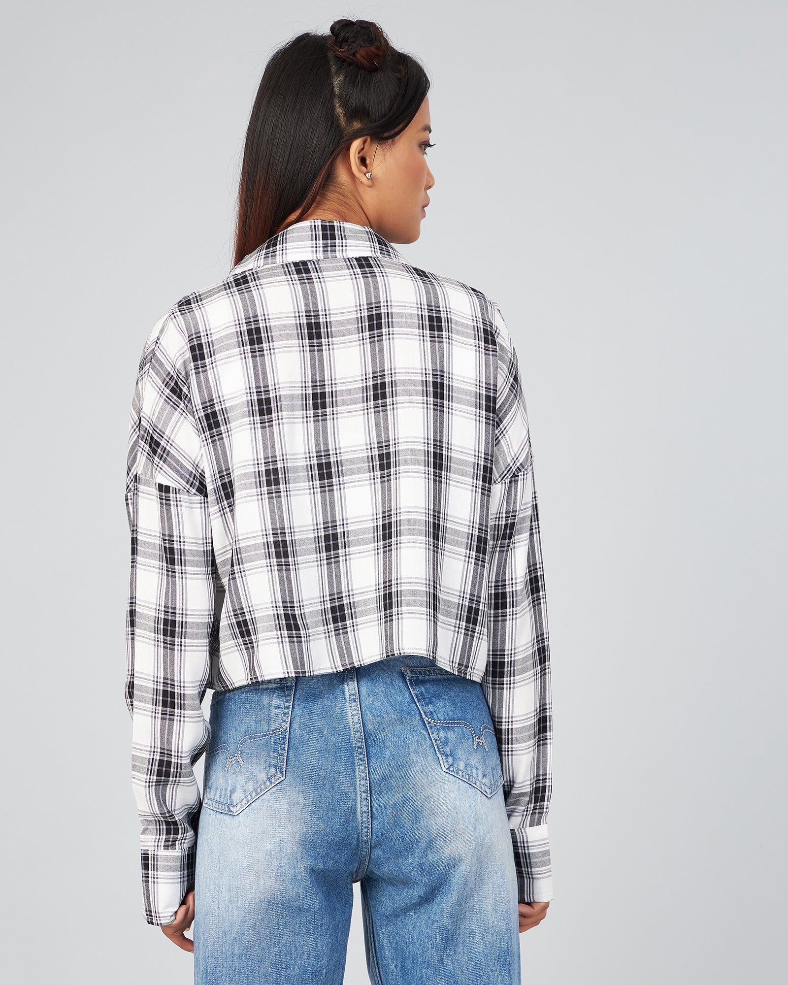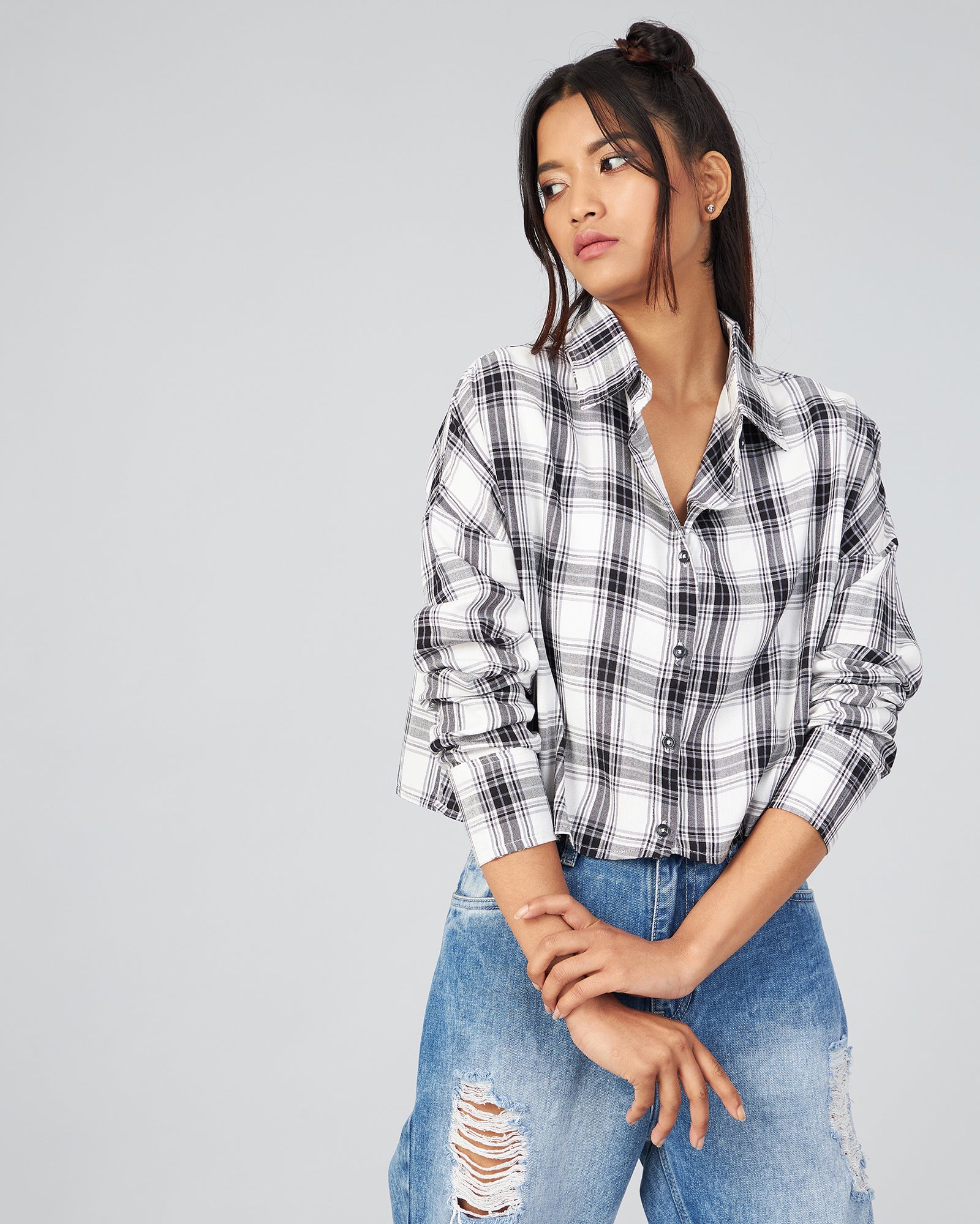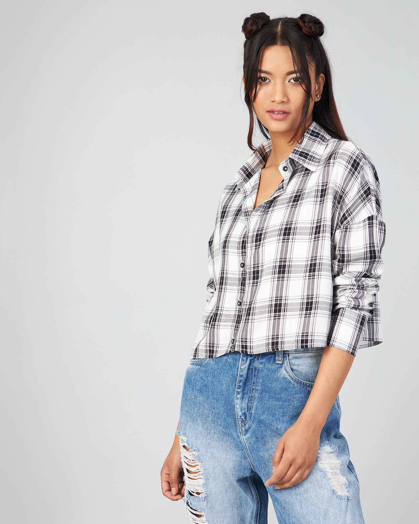 Chimpaaanzee Women Viscose White and Black Checkered Crop Shirt
