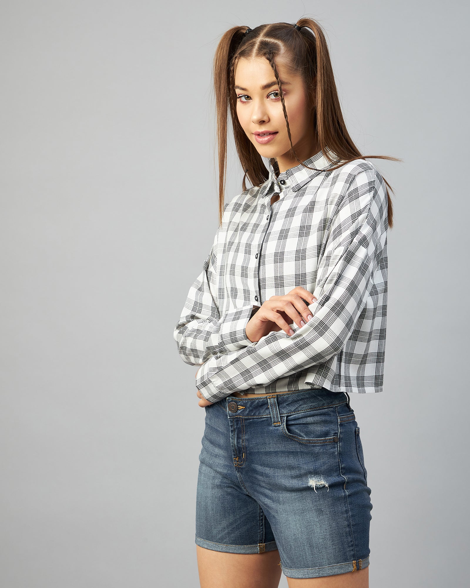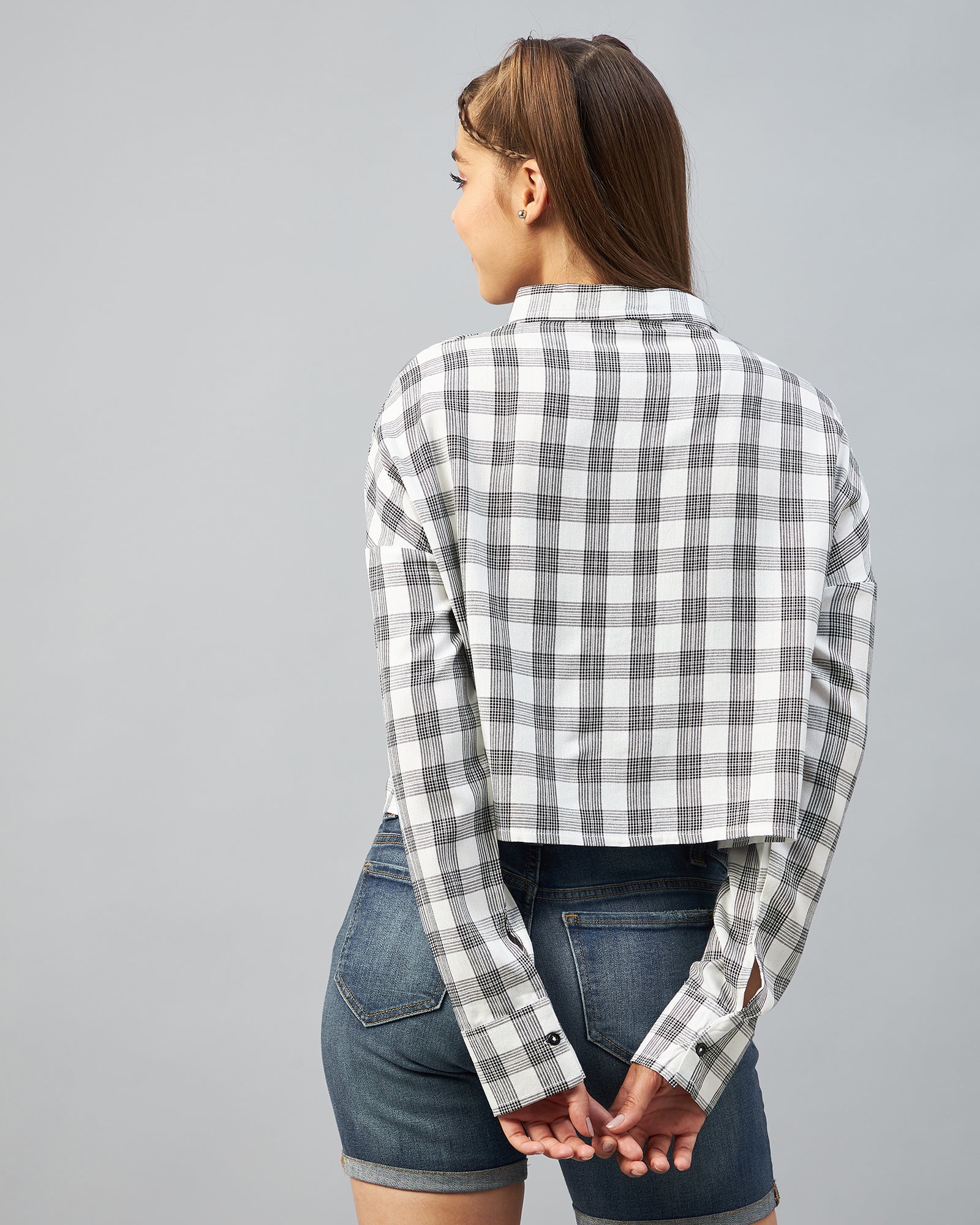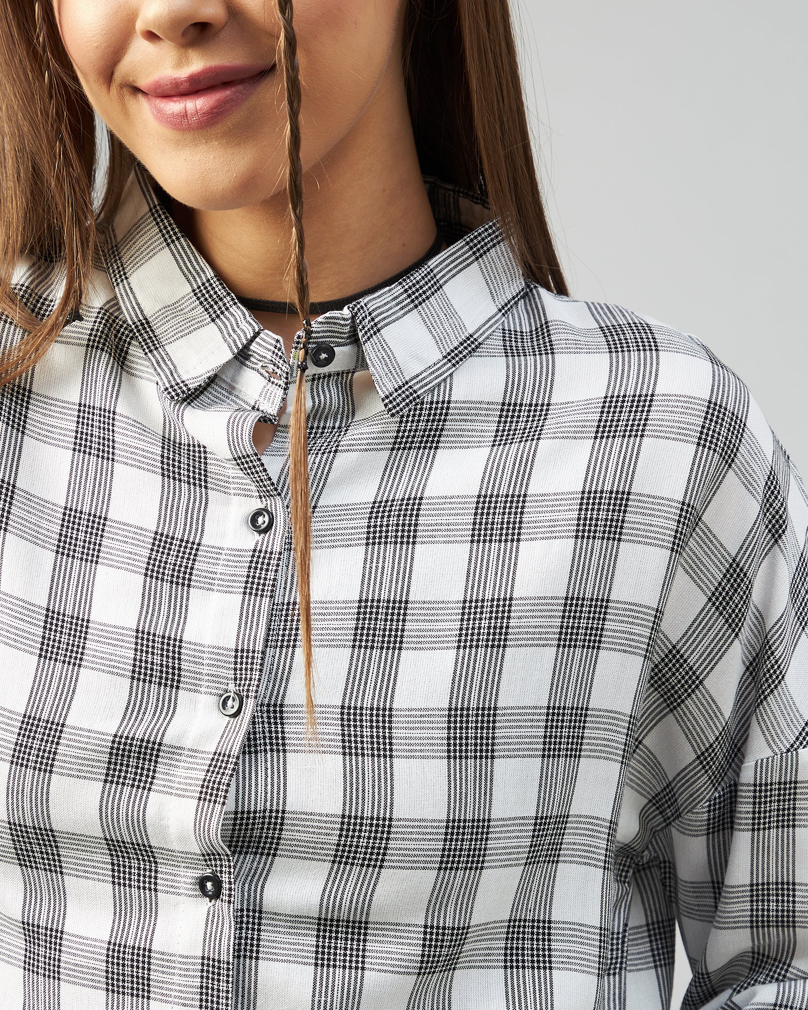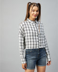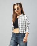 Chimpaaanzee Women Viscose White & Black Checkered Full Sleeve Drop Shoulder Crop Shirt