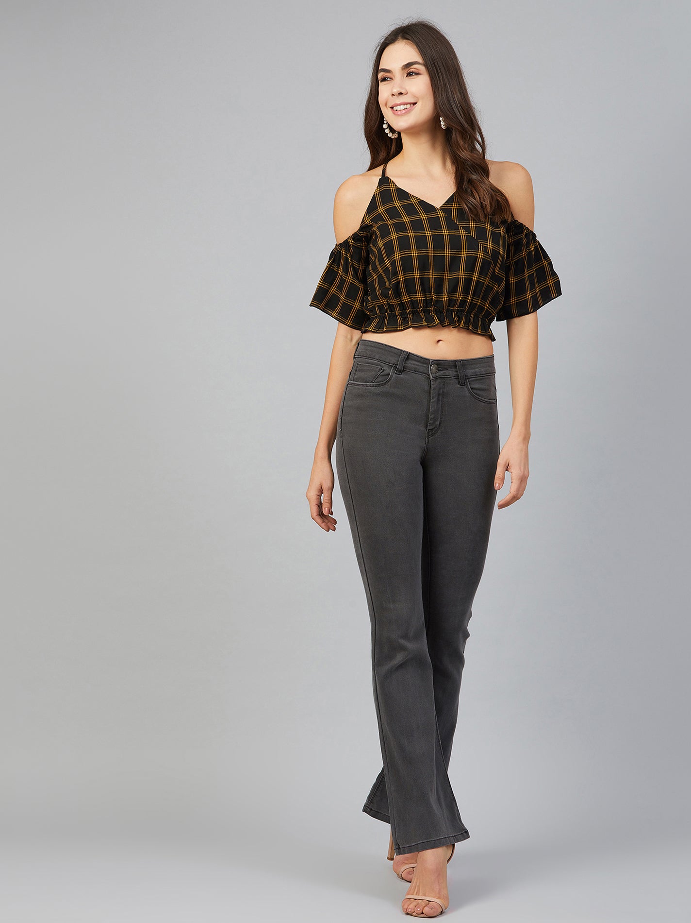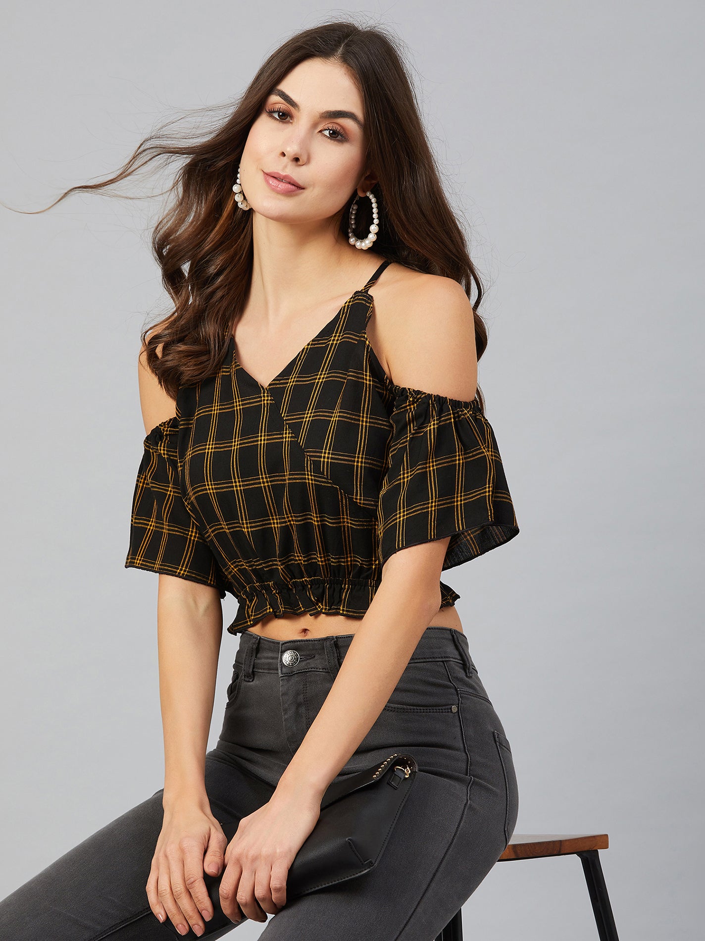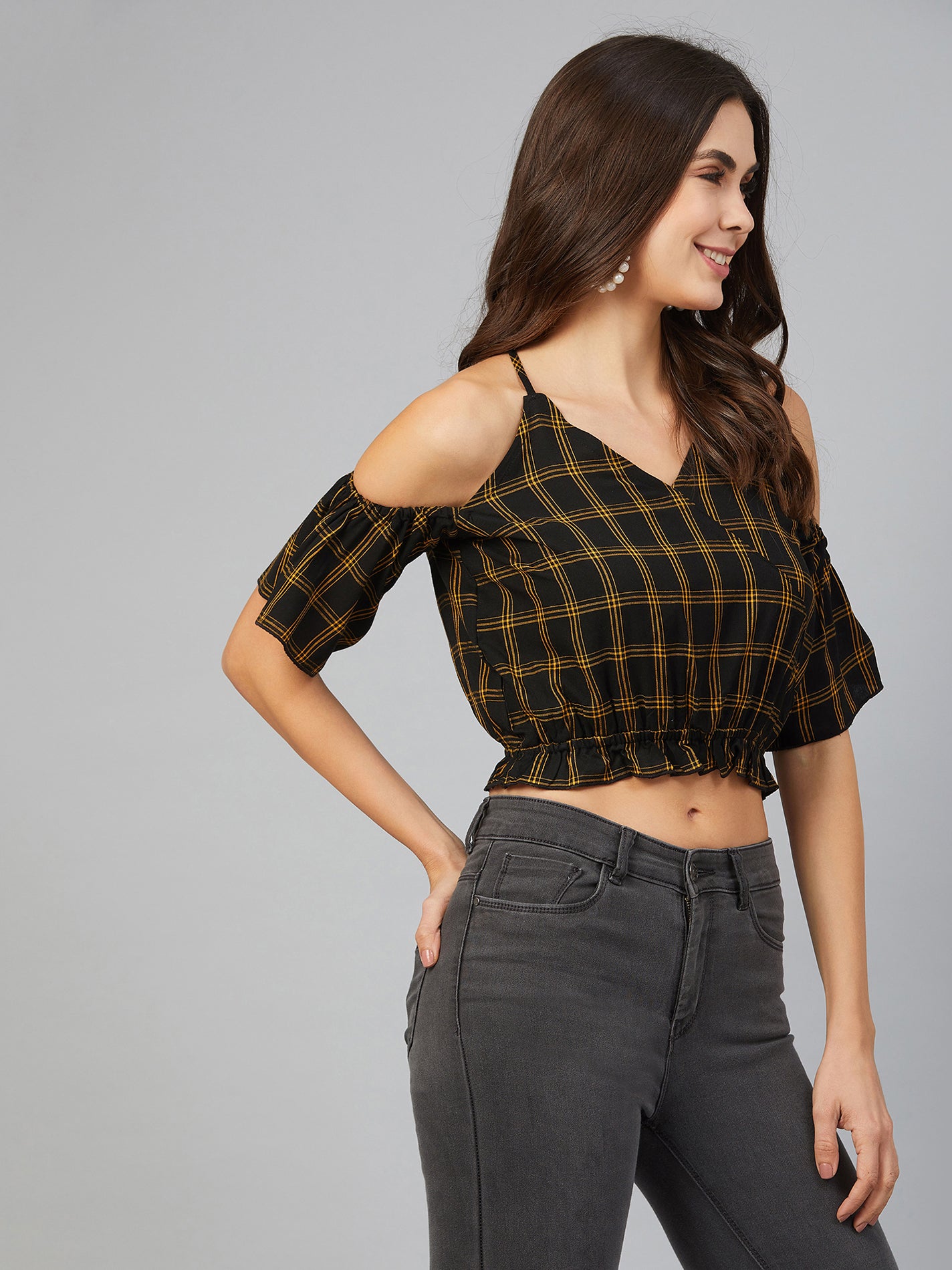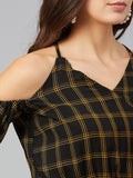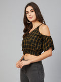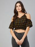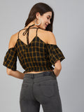 Chimpaaanzee Women Yellow Checks Cold Shoulder Crop Top