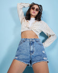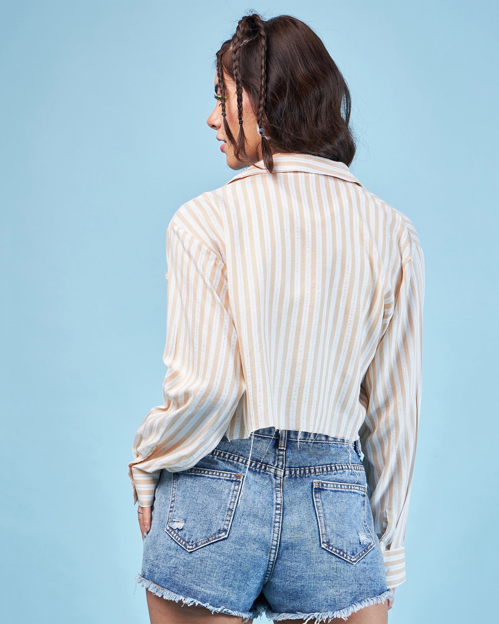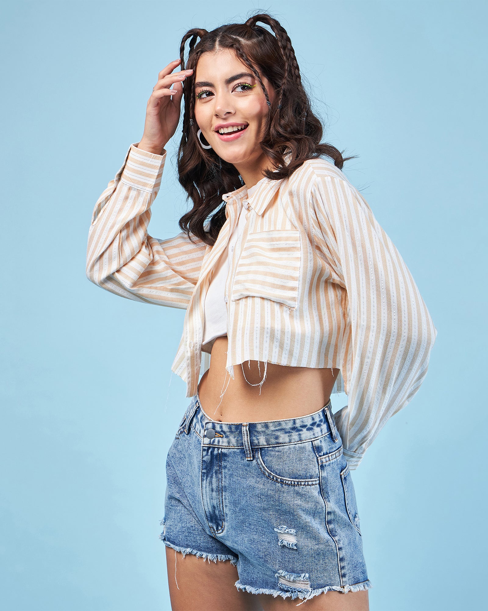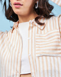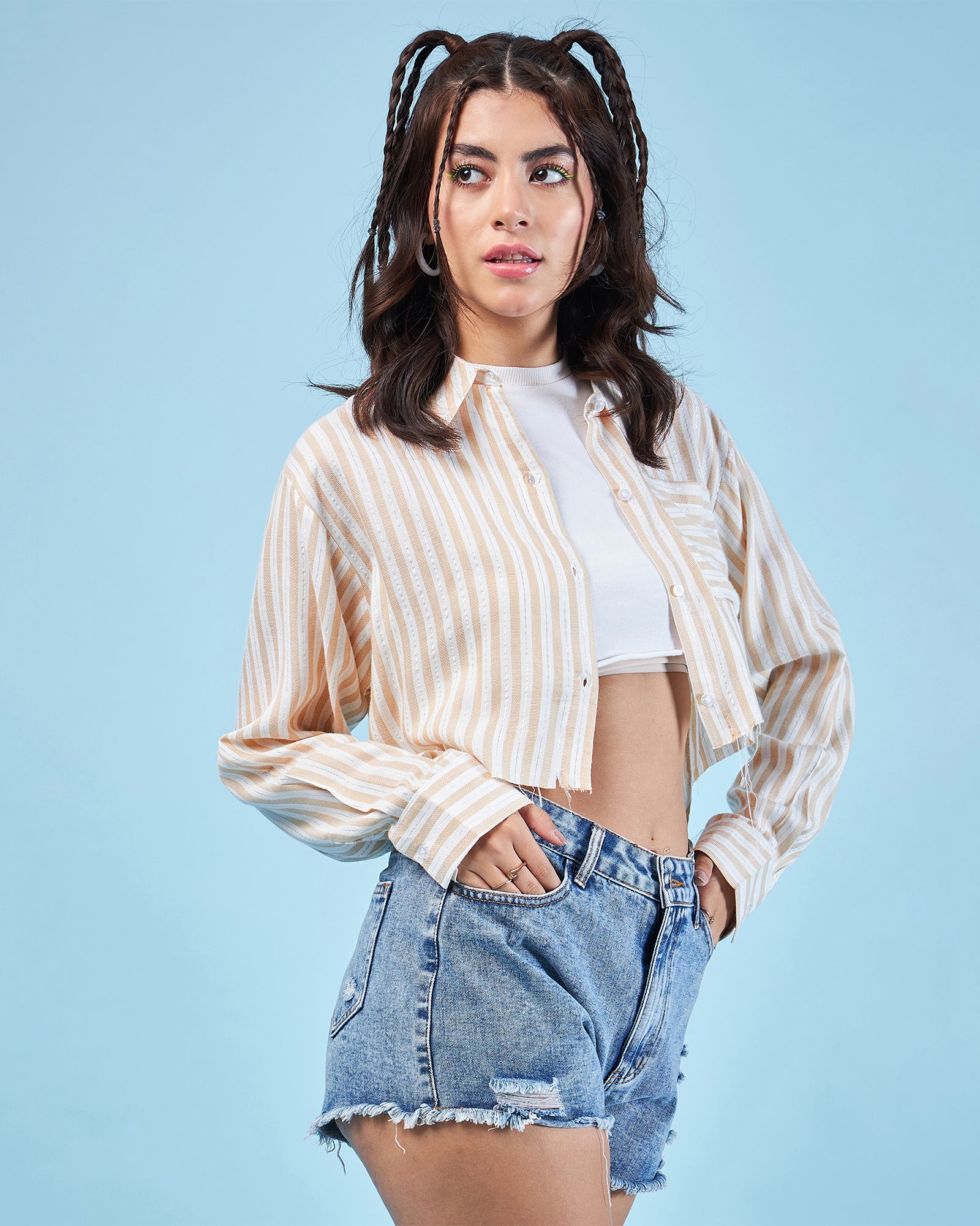 Chimpaaanzee Women Beige & White Crop Oversized Shirt